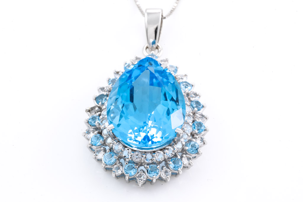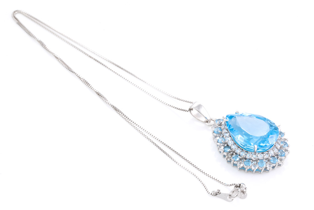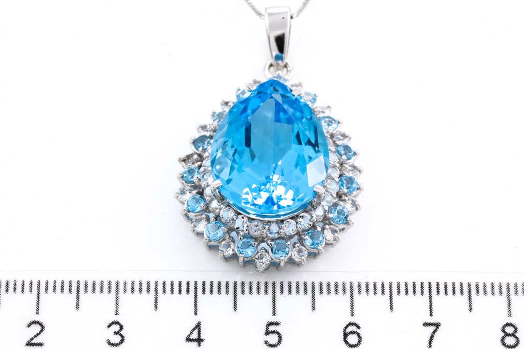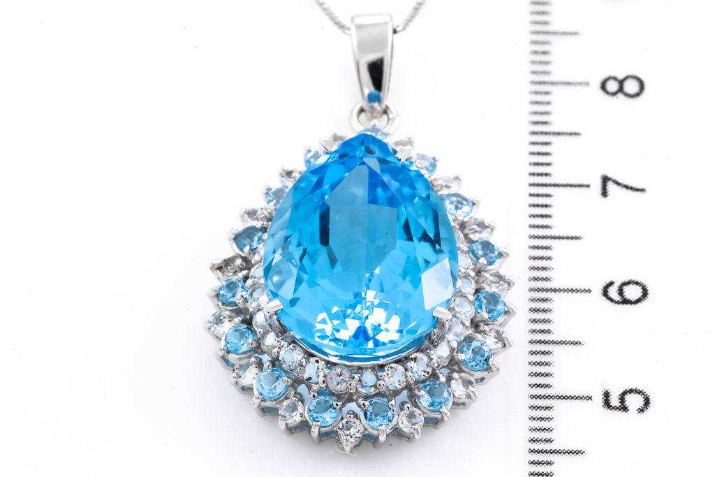 Topaz pendant with centre pear shape Topaz of 22.2ct, round blue & colourless Topaz totalling approximately 2.00cts. 18ct white gold with 44cm adjustable chain. Weight: 13.6g. (Pre-owned)