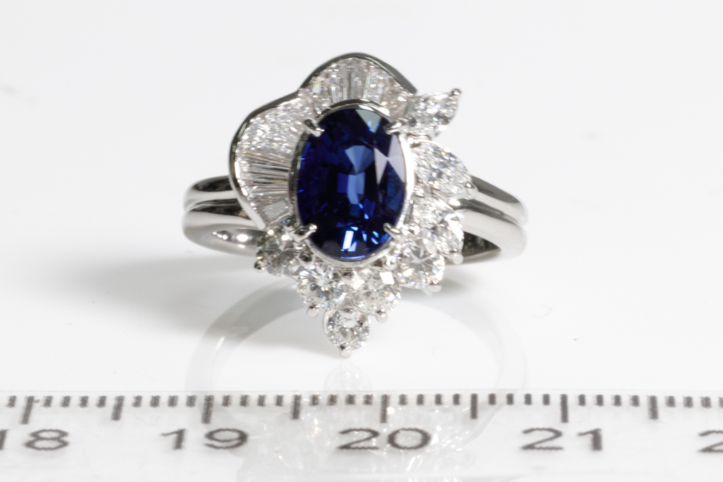 Sapphire and Diamond ring with oval shape blue Sapphire of 2.22ct and round & baguette cut Diamonds totalling 1.03cts (Estimated grading: H-I SI). Platinum. Ring size M1/2. Weight 7.4g. With Certificate #416186. (Pre-owned)