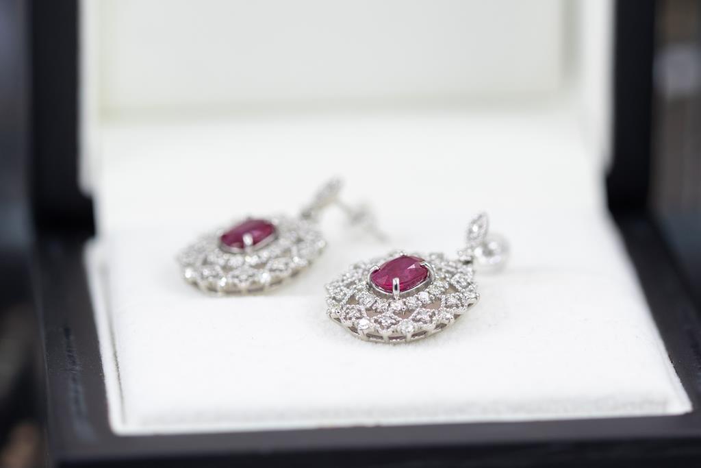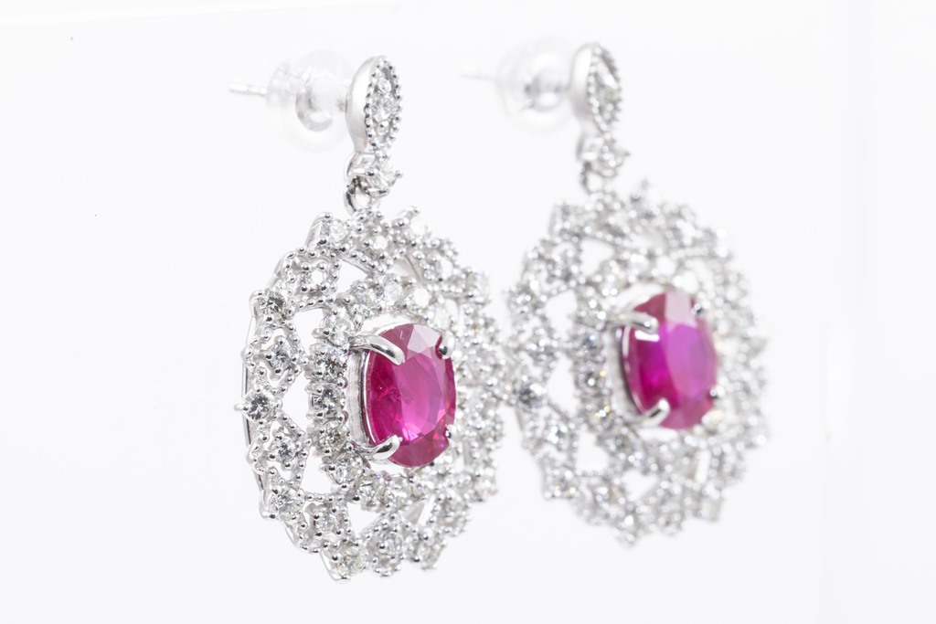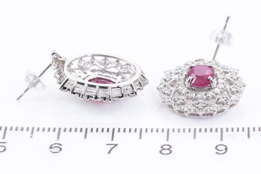Ruby and Diamond earrings with oval shape purplish red Burmese Rubies totalling 2.23cts (both with GIA reports #3345700795, 2347700792) and round Diamonds totalling 1.00cts (Estimated grading: J-K SI). Platinum with 18ct white gold & silicon backs. Weight: 7.3g. (Pre-owned)