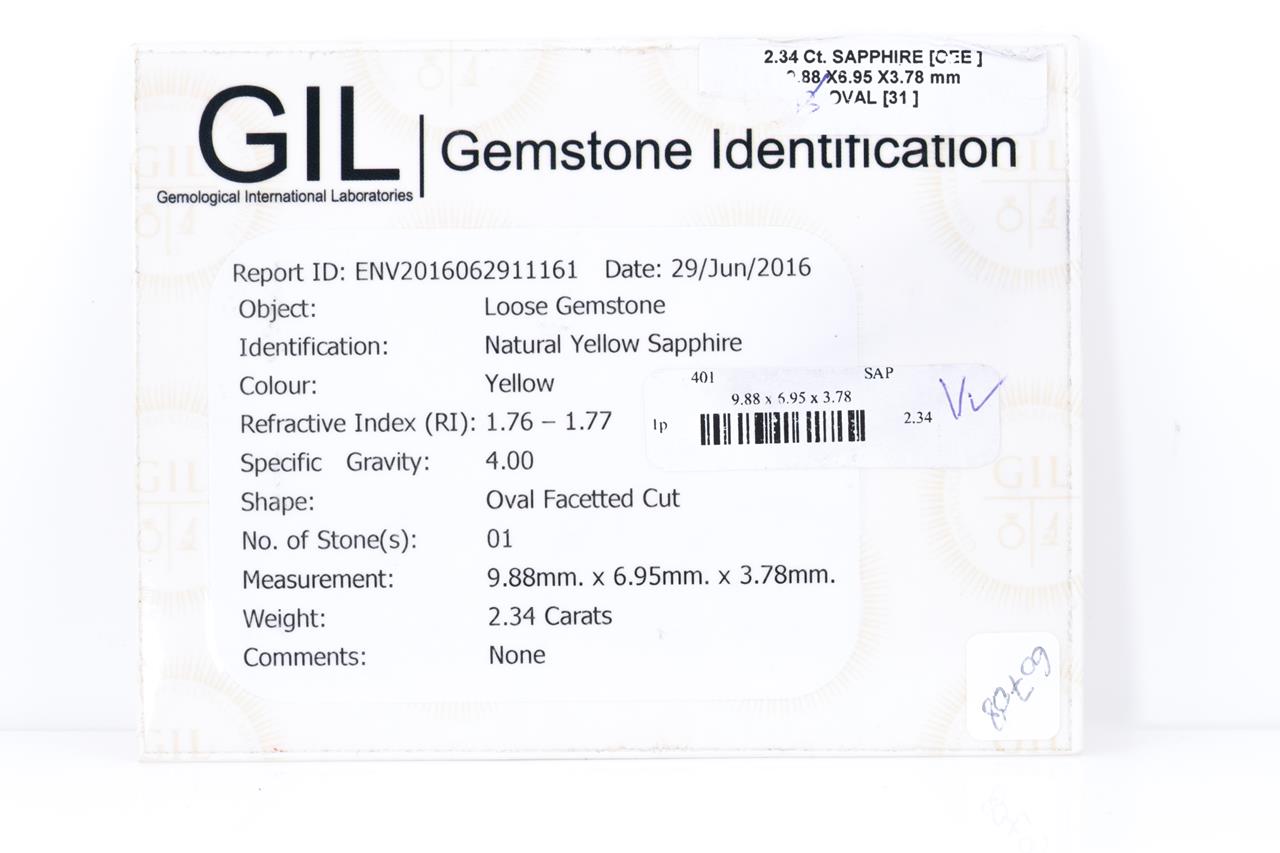 A loose oval cut yellow Sapphire of 2.34ct. With GIL certificate #ENV2016062911161. Size 9.88 x 6.95 x 3.78mm. (As New)