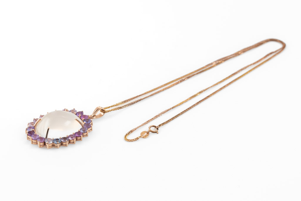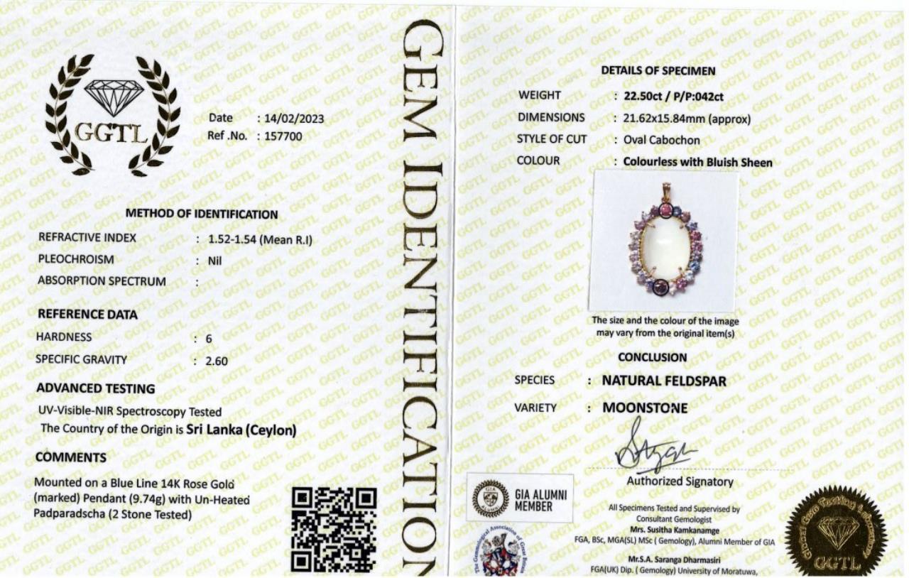 Moonstone and Sapphire Pendant with oval shape Moonstone of 22.50ct and round multi- coloured sapphires 4.53cts. 14ct rose gold with 18ct rose gold 45cm chain. With GGTL Certificate #157700. Weight: 10.8g - combined weight chain and pendant. (As New)