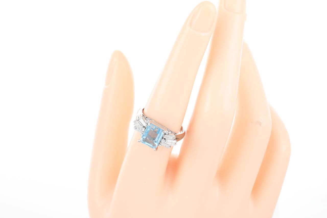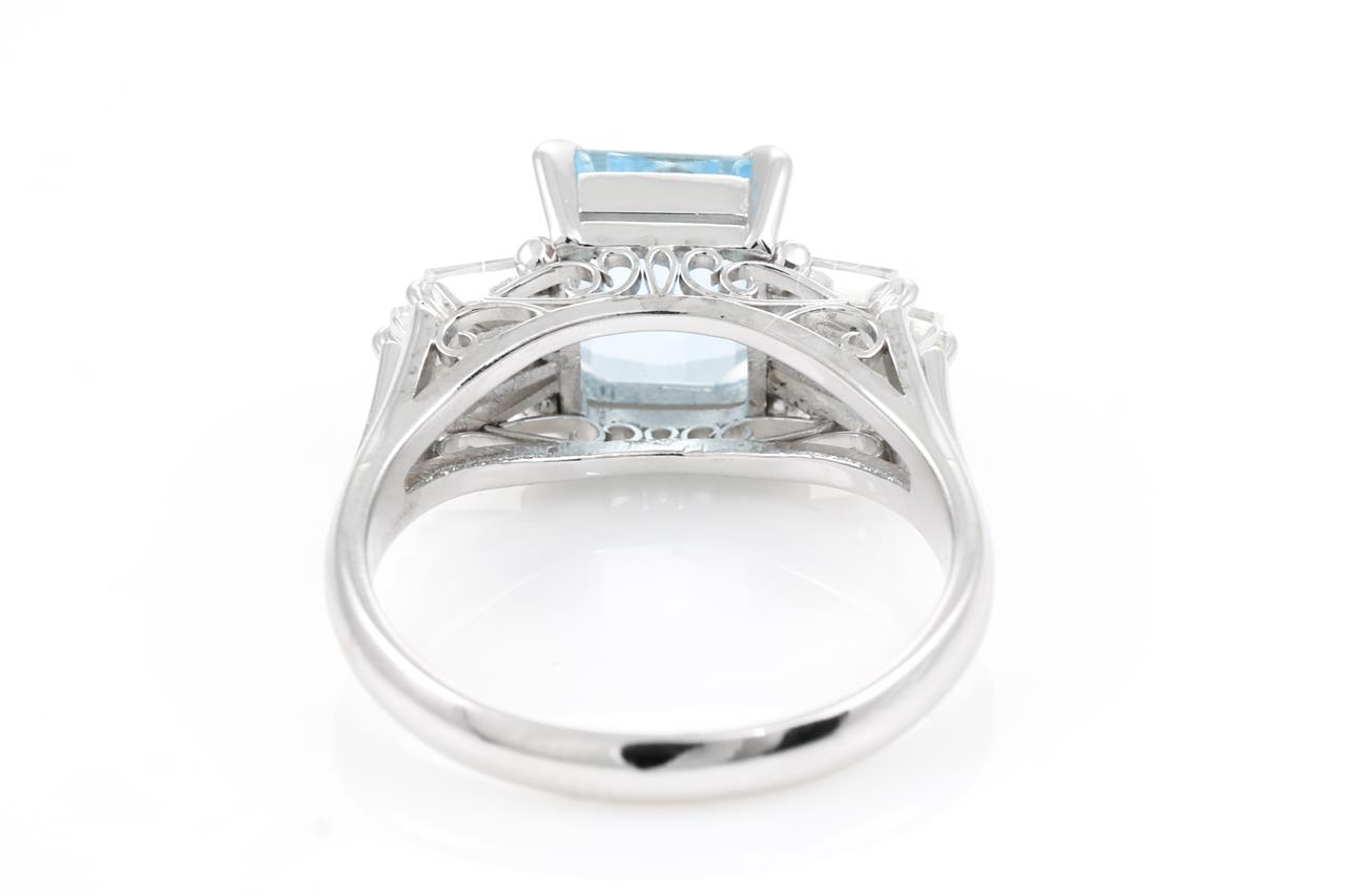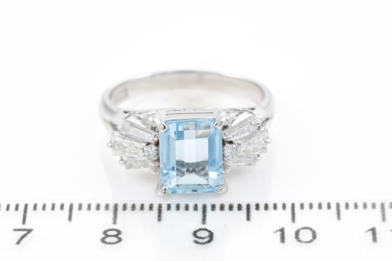 Aquamarine and Diamond ring with centre emerald cut Aquamarine of 2.25cts and round & baguette cut Diamonds totalling 0.61cts (Estimated grading: H-I SI). Platinum. Ring size: O1/2. Weight: 7.8g. (Pre-owned)