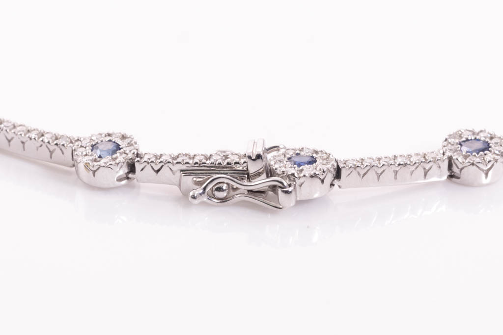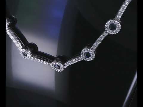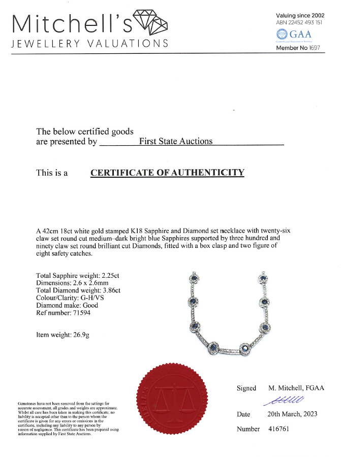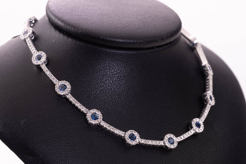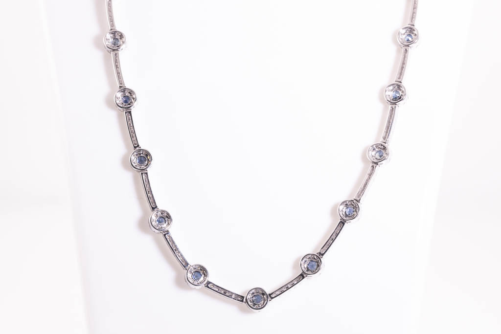 Sapphire and Diamond necklace with round Sapphires totalling 2.25cts and round Diamonds totalling 3.86cts (Estimated grading: G-H VS). 18ct white gold. Length: 42cm. Weight: 26.9g. With Certificate #416761. (Pre-owned)