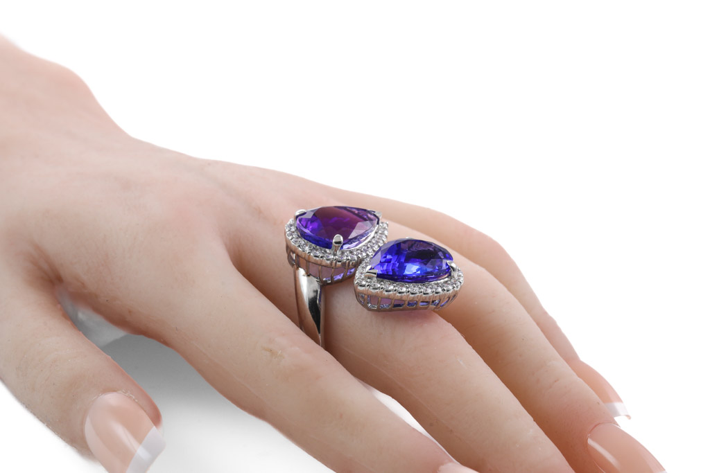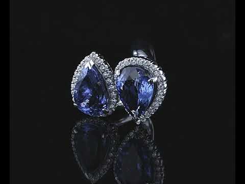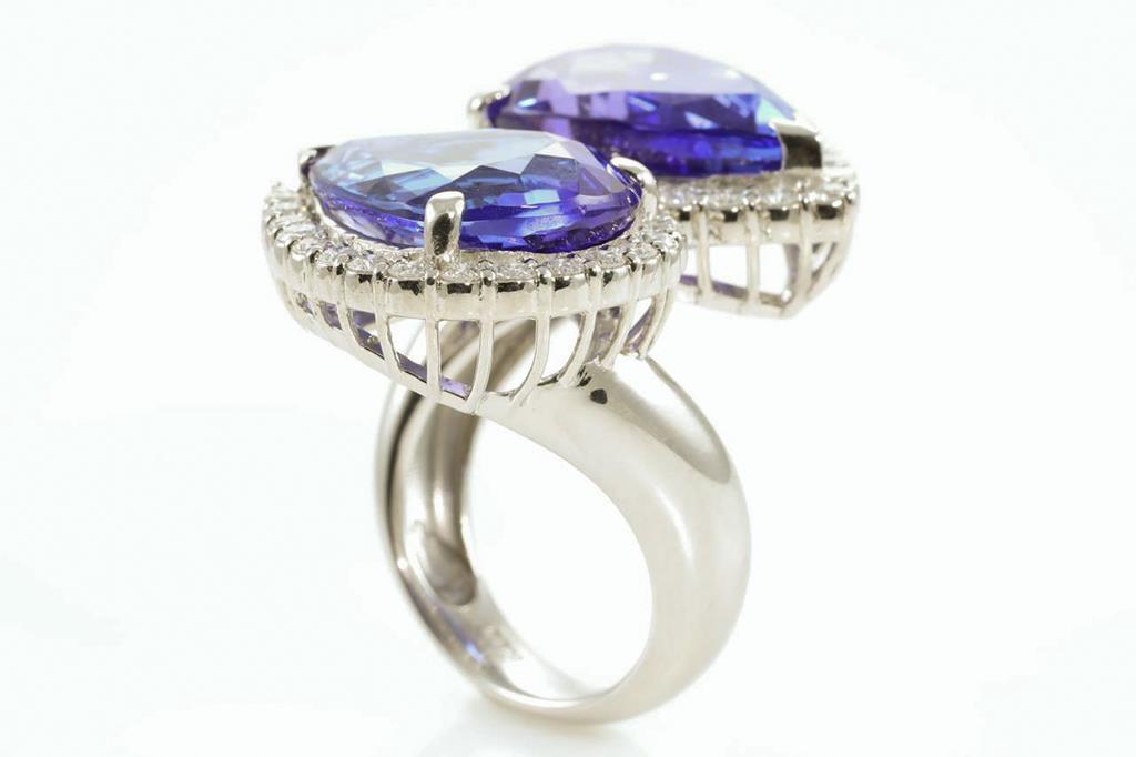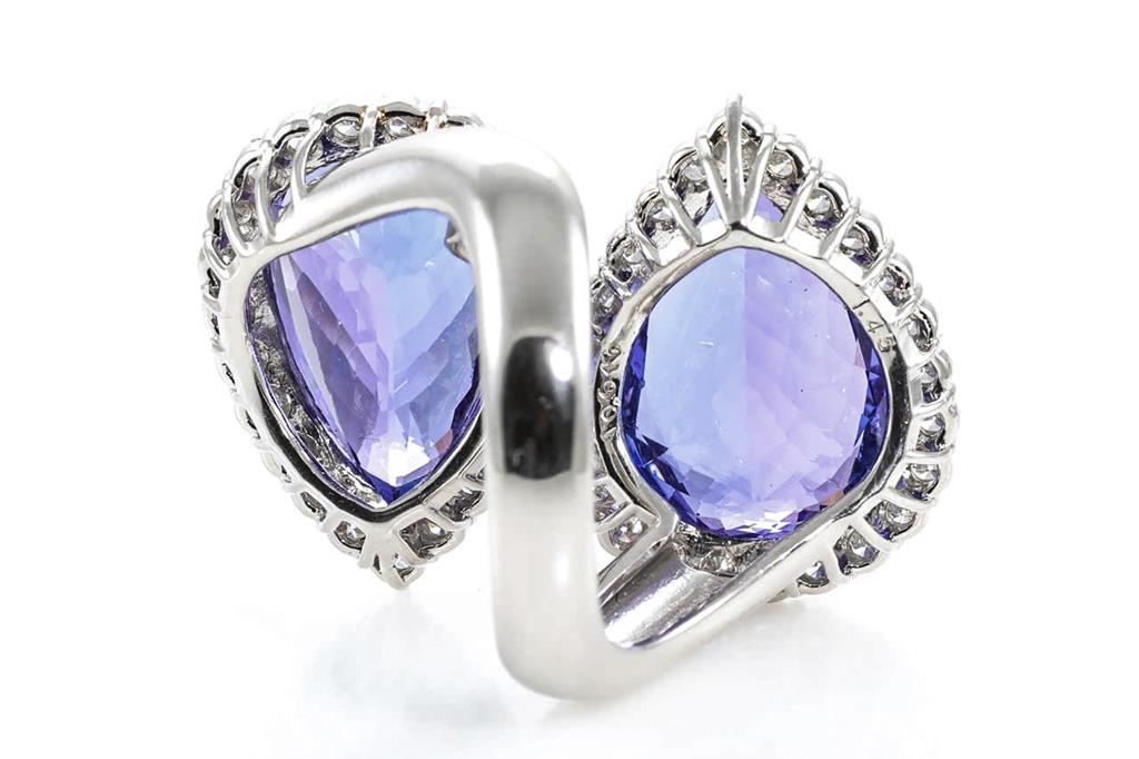 Tanzanite and Diamond ring with two pear shape Tanzanites of 12.01ct and 10.67cts and Diamonds totalling 1.45cts (Estimated grading: G-H SI). Platinum, weight: 20.58 grams. Ring size P. With certificate #413107. (Pre-owned)