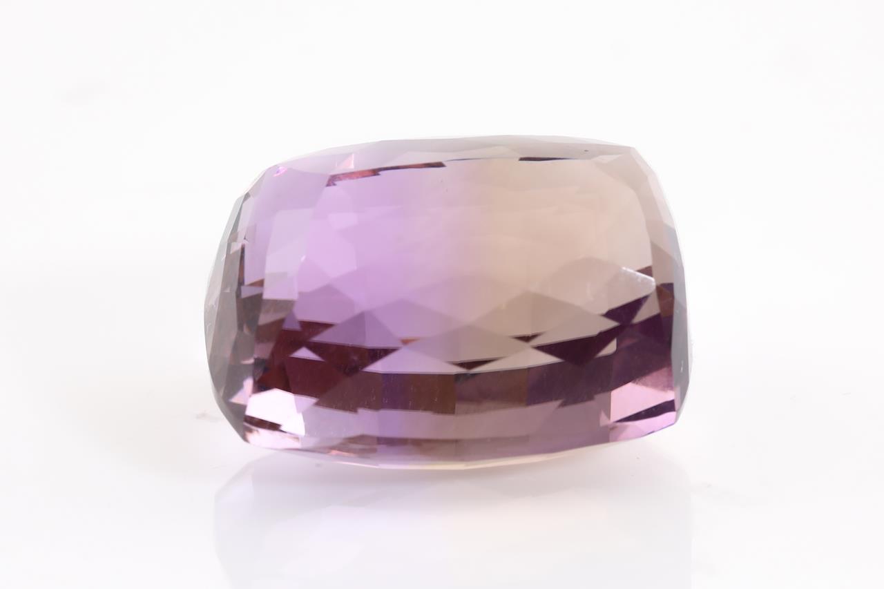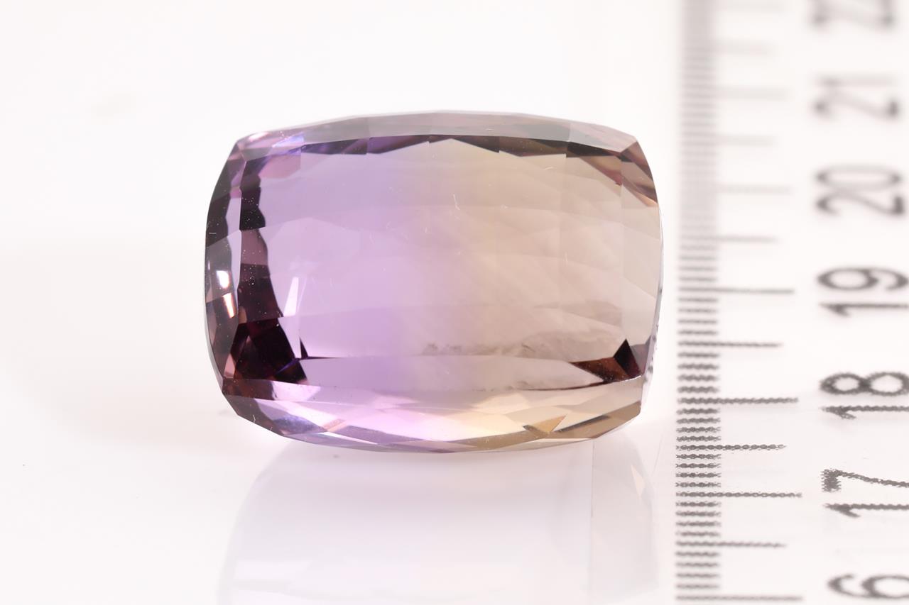 A loose cushion cut Ametrine of 22.69ct. Dimensions 17.68 x 14.17 x 11.25mm approximately. (As New)