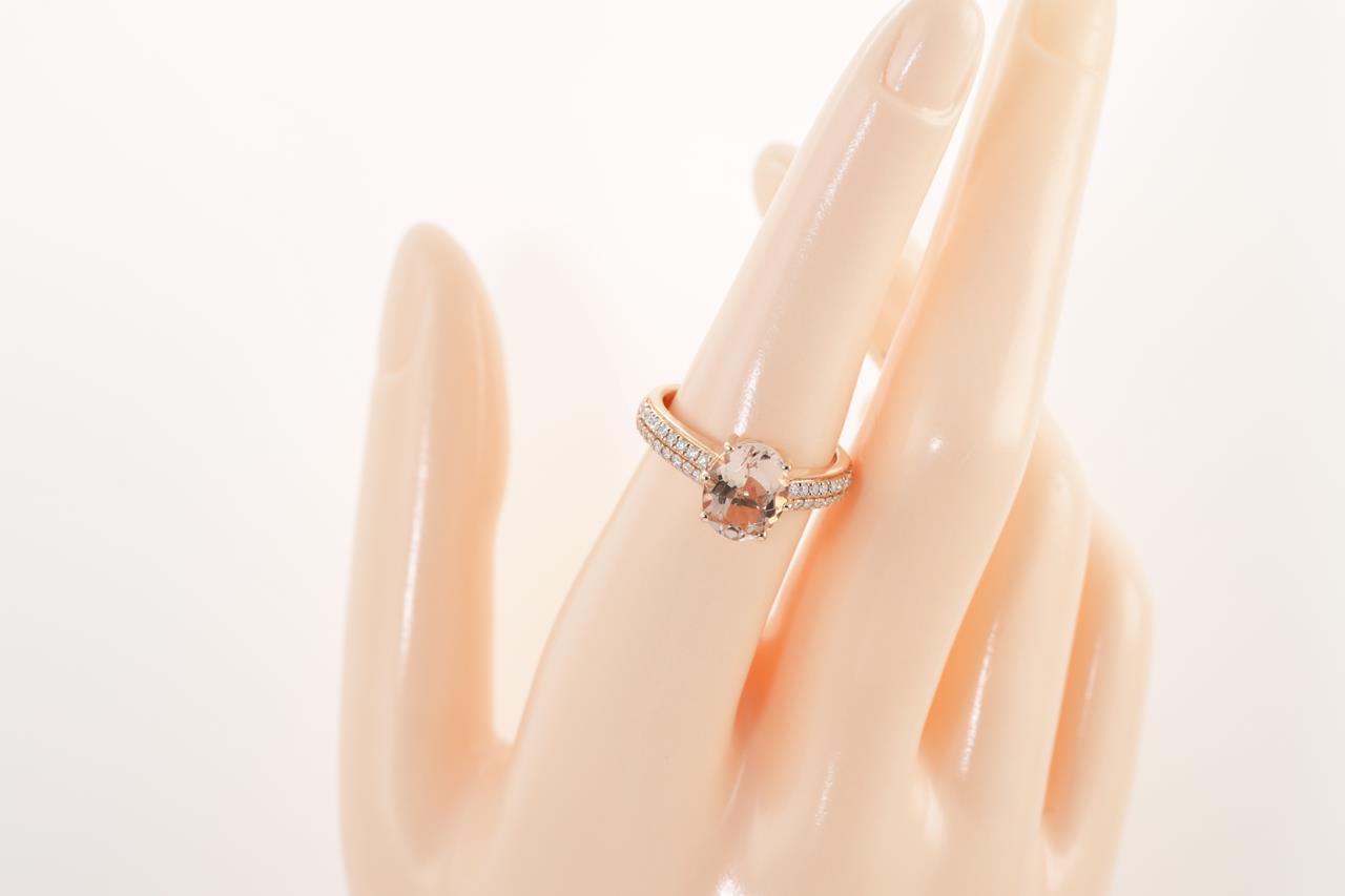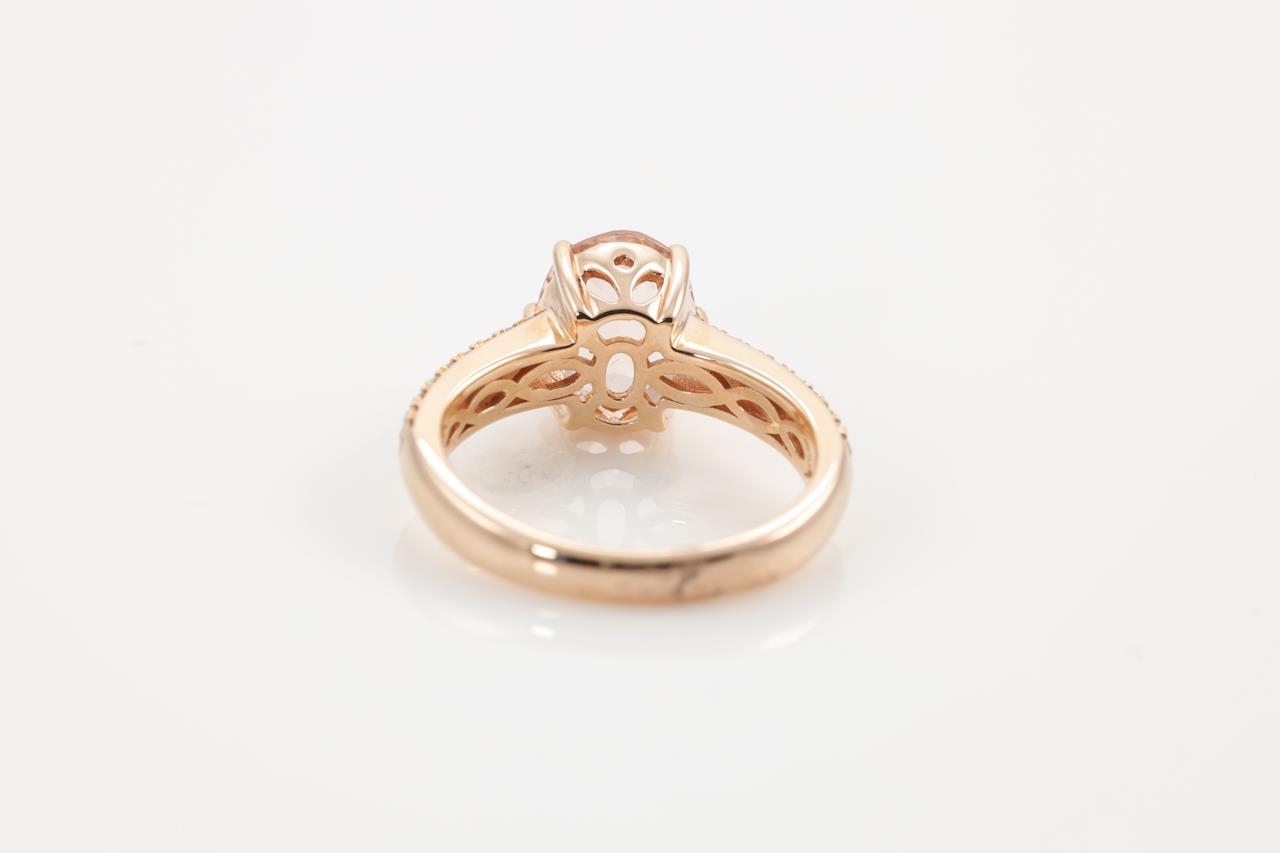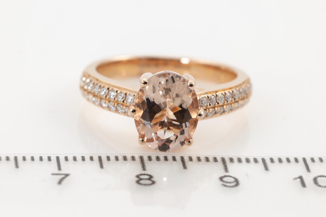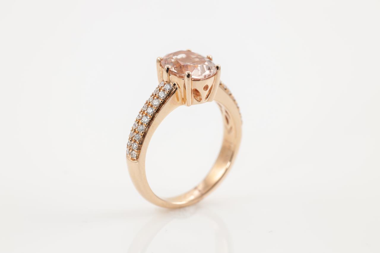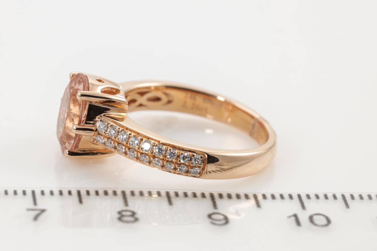 Morganite and Diamond ring with an oval checkerboard cut Morganite of 2.26ct and round Diamonds totalling 0.29cts. 14ct rose gold. Ring size N. Weight: 5.3g (As New)