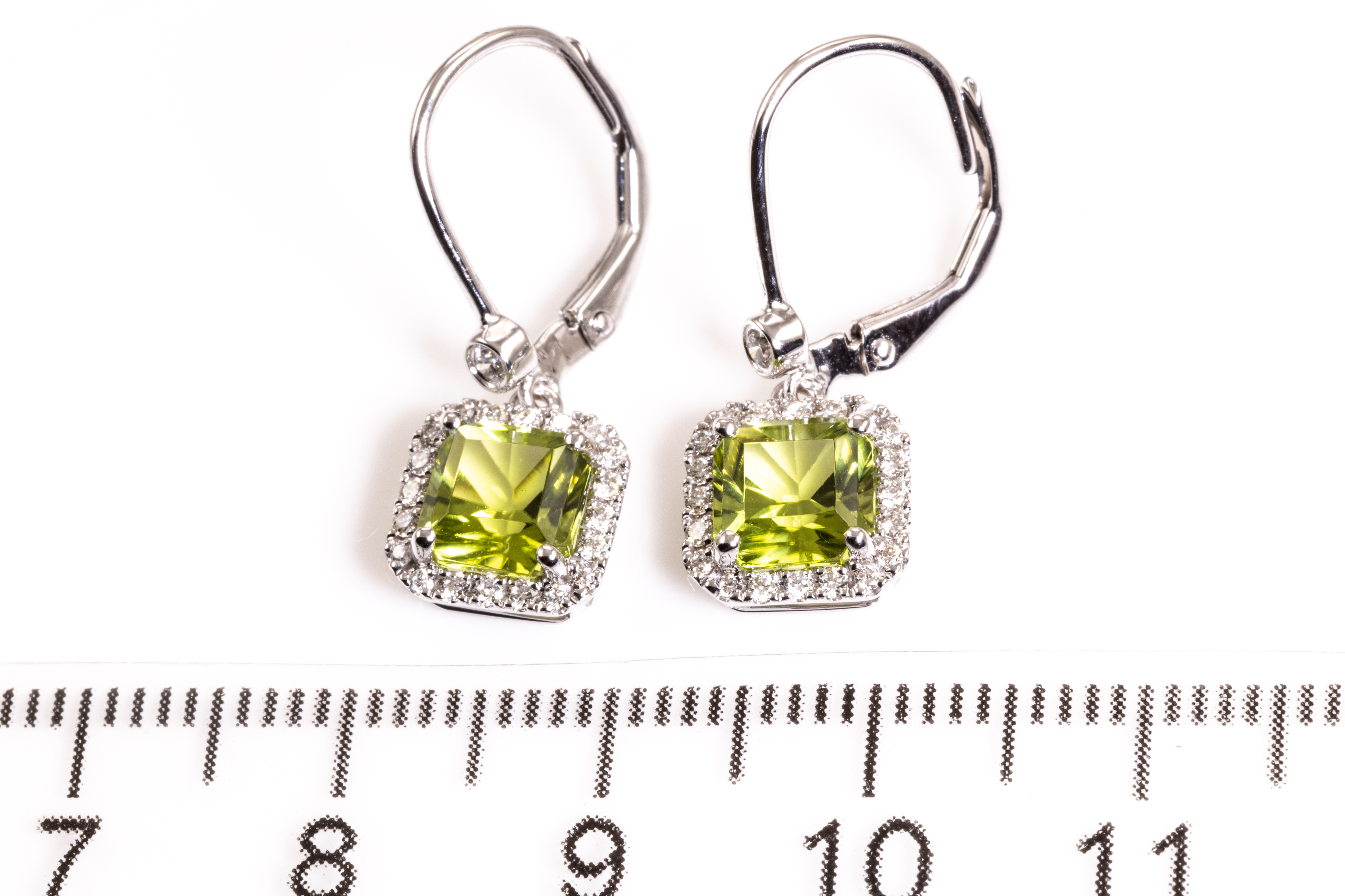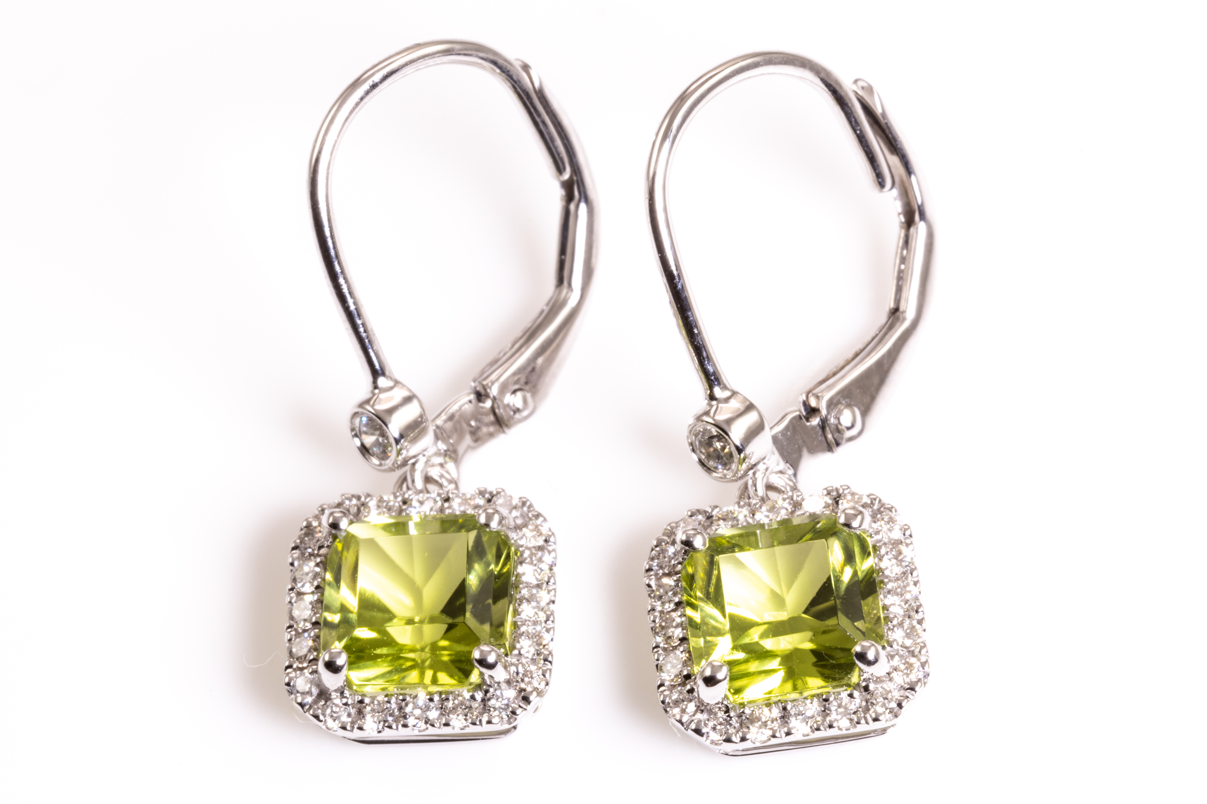 Peridot Diamond leverback earrings with emerald cut Peridot totalling 2.27cts and round Diamonds totalling 0.25cts. 14ct white gold. Weight: 2.4g. (New)
