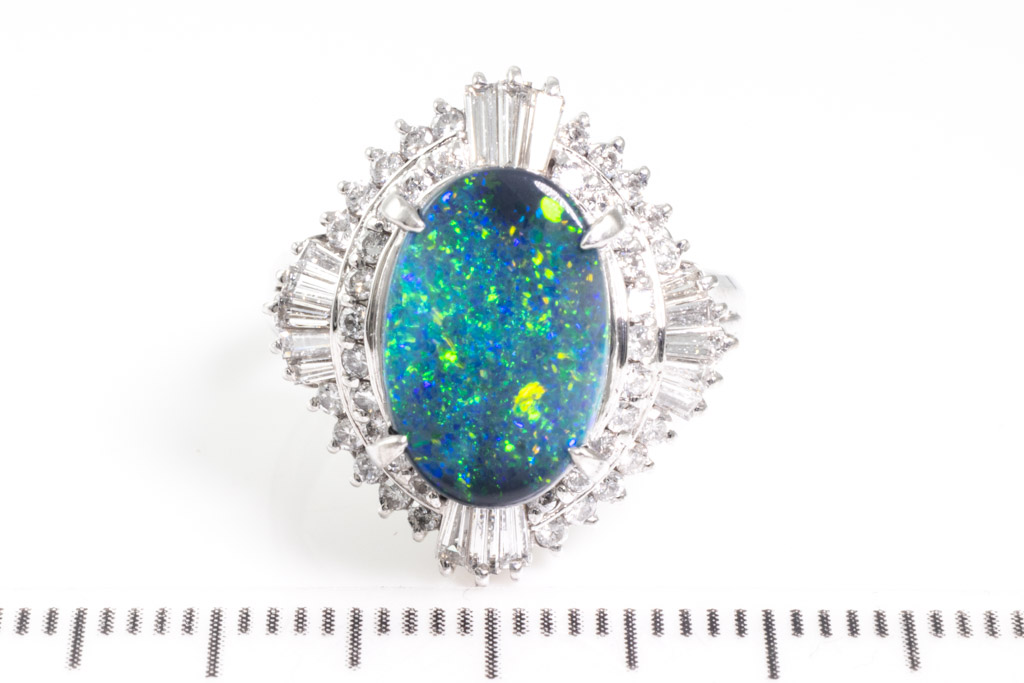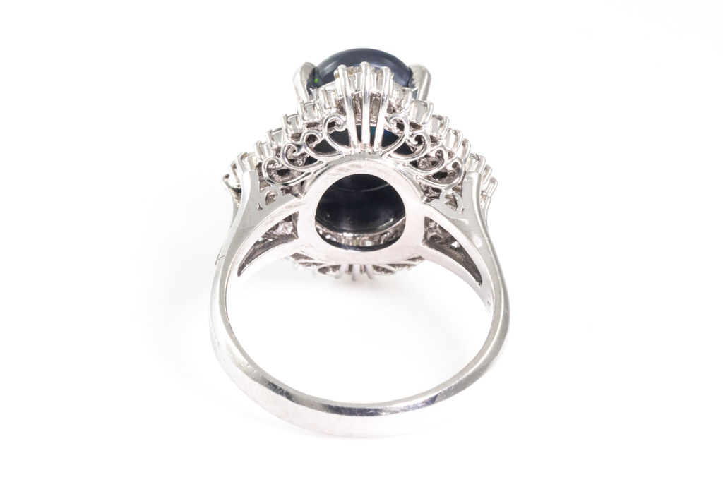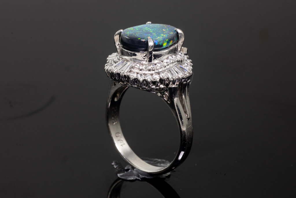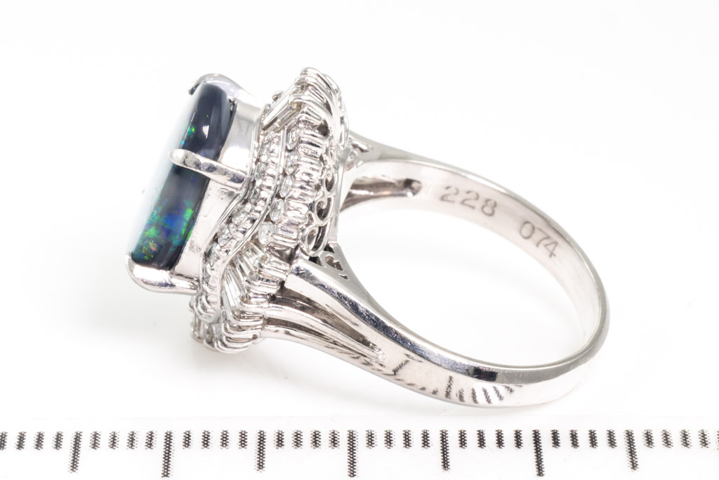Opal and Diamond ring with oval cabochon cut solid Black Opal of 2.28cts and round & baguette cut Diamonds totalling 0.74cts (Estimated grading: H-I SI). Platinum. Ring size L. Weight: 9.5g. (Pre-owned)