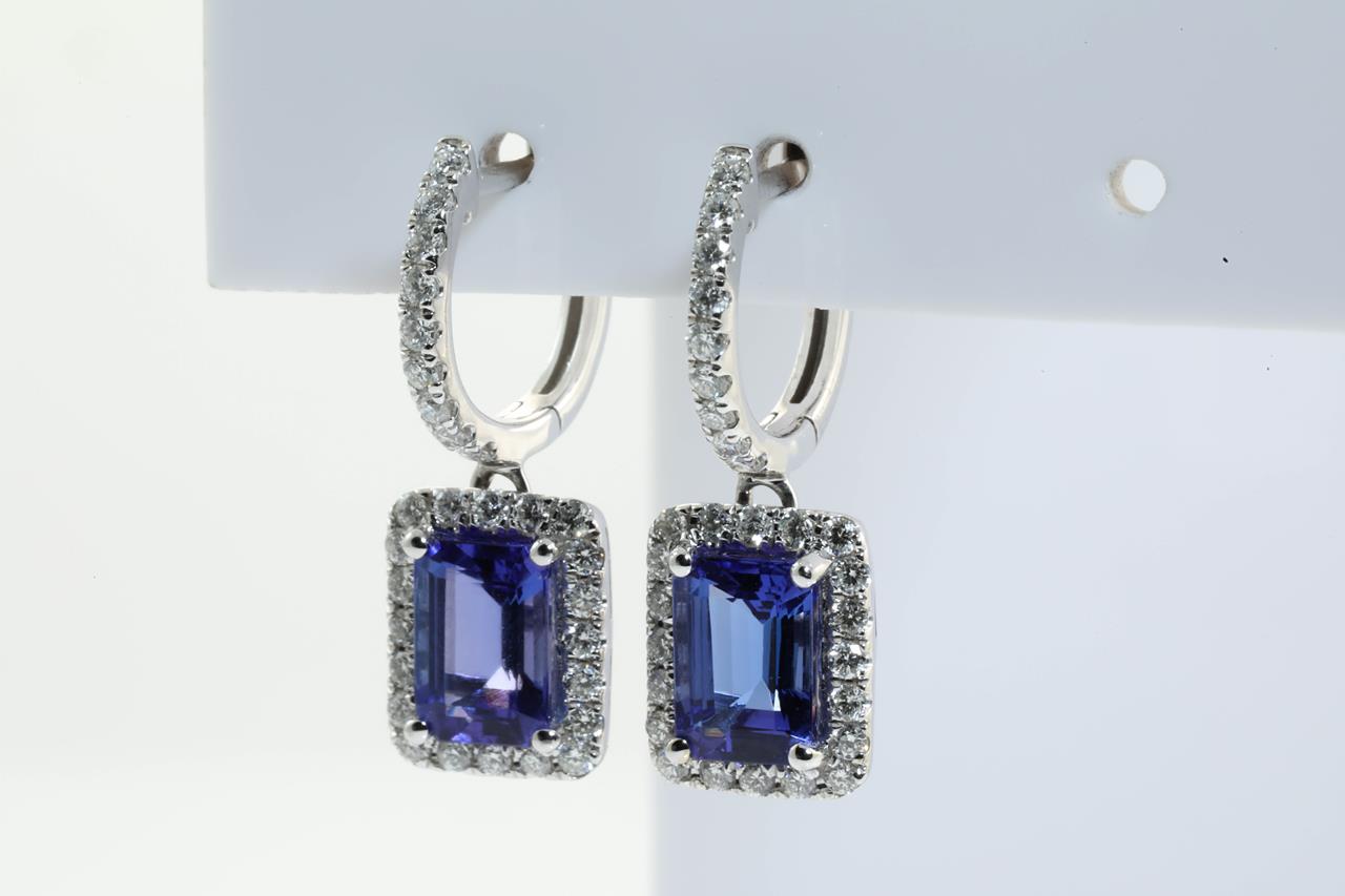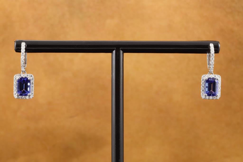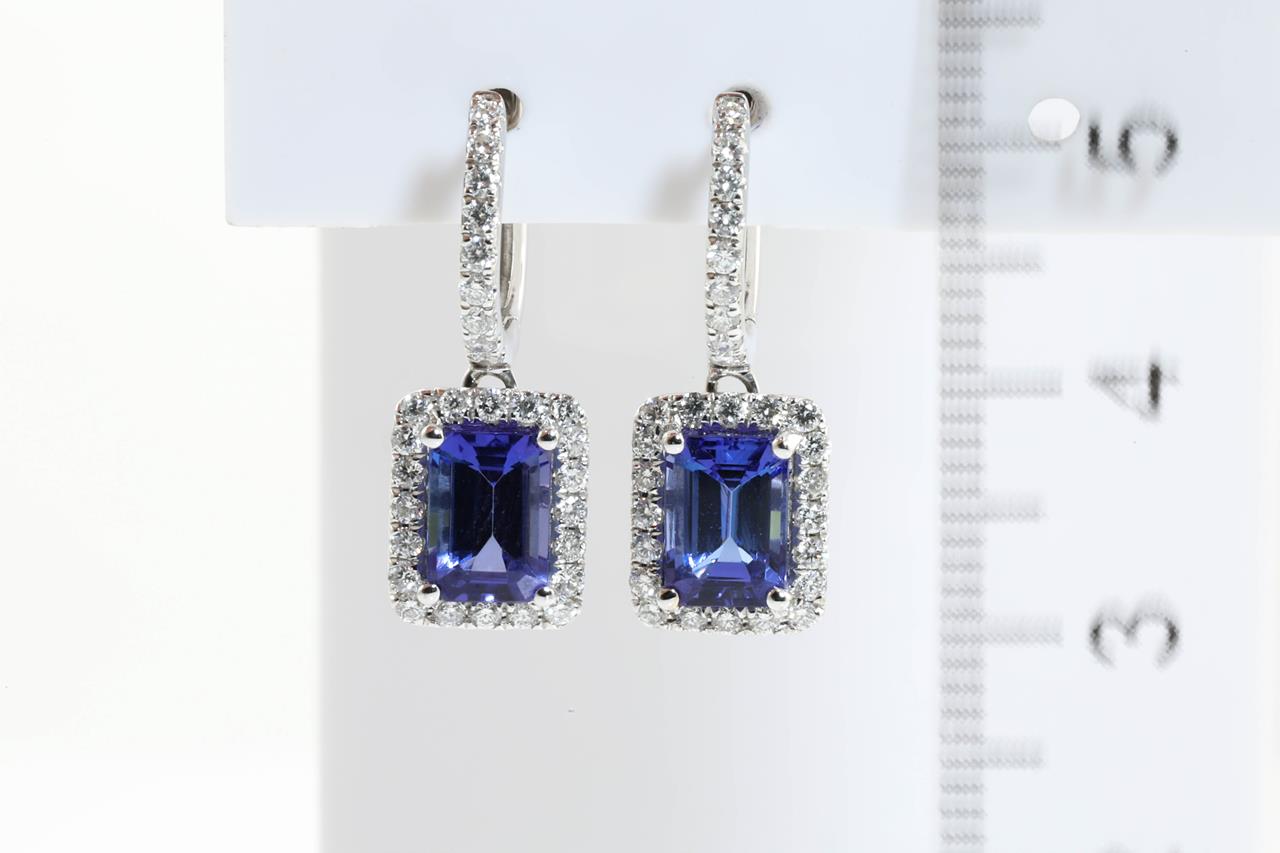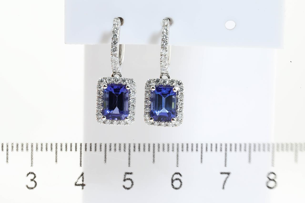 Tanzanite and Diamond earrings with emerald cut Tanzanite totalling 2.28cts and Diamonds totalling 0.57cts (Estimated grading: G SI). 14ct white gold. Weight: 3.7g. (As new)