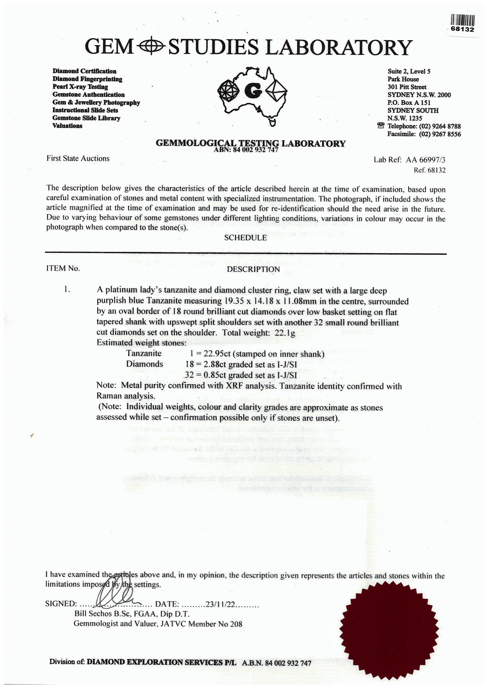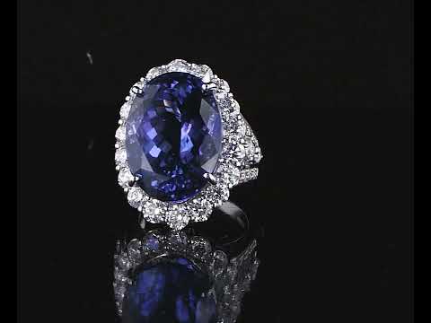 Tanzanite and Diamond ring with oval shape tanzanite of 22.95ct and round Diamonds totalling 3.73cts (Estimated grading: I-J SI). Platinum. Ring size M - ring resizing is not recommended. Weight: 22.1g. With GSL Description Report #AA66997/3. (Pre-owned)