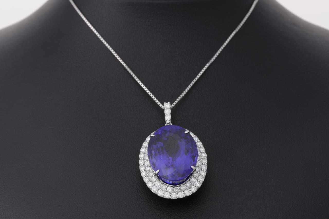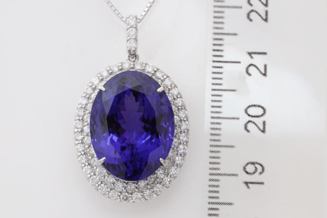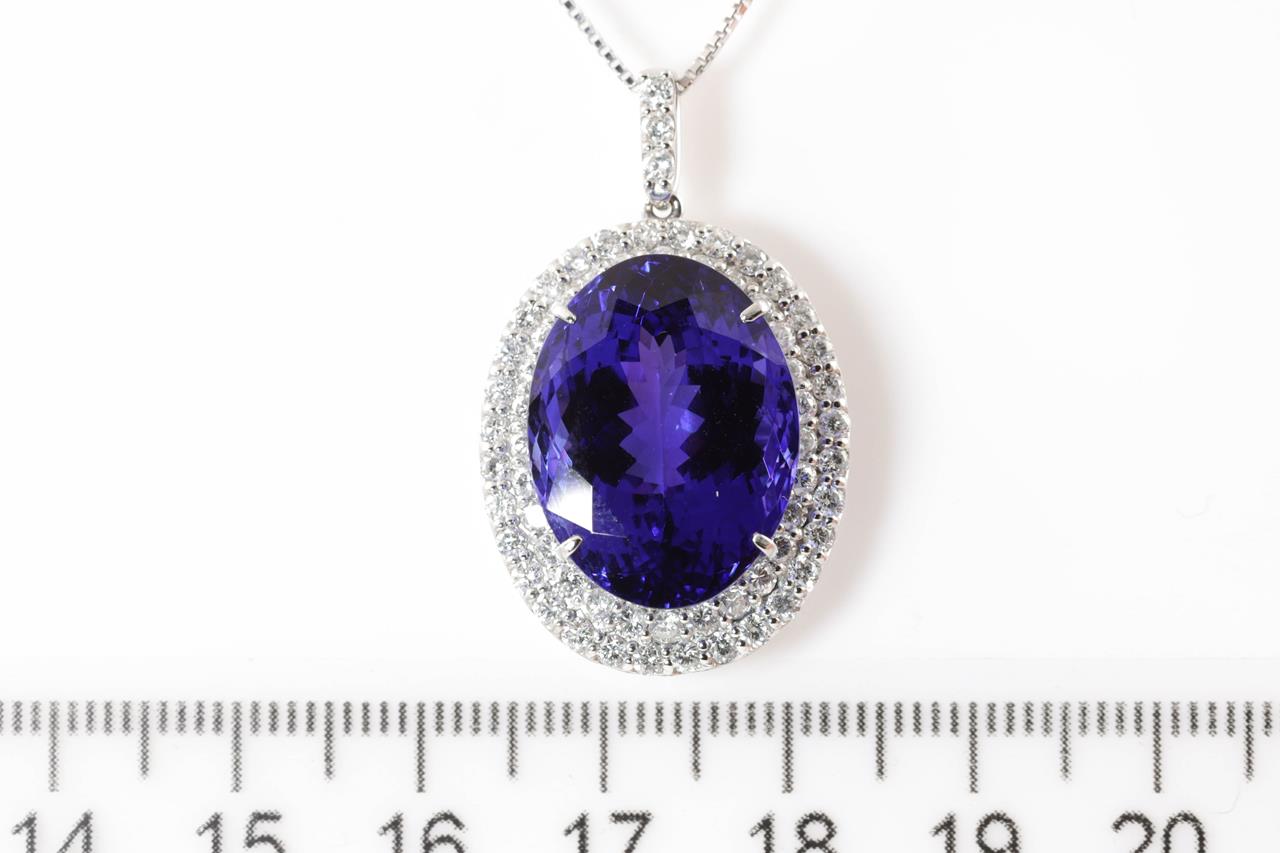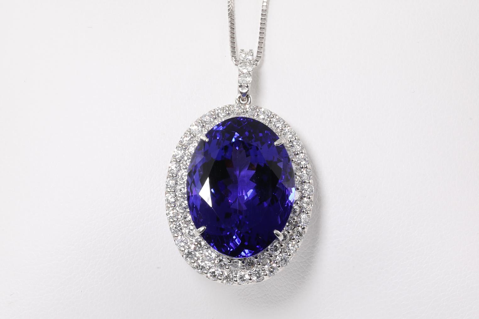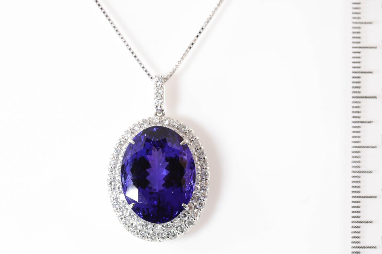 Tanzanite and Diamond pendant with an oval shape Tanzanite of 22.97ct and Diamonds totalling 1.57cts (Estimated grading: G-H SI). Platinum with 18ct white gold 44cm adjustable chain. Weight: 11.7g. With certificate #414820. (Pre-owned)