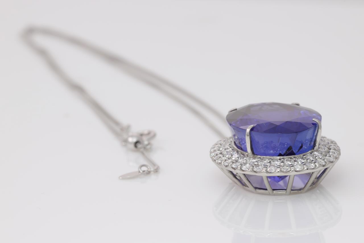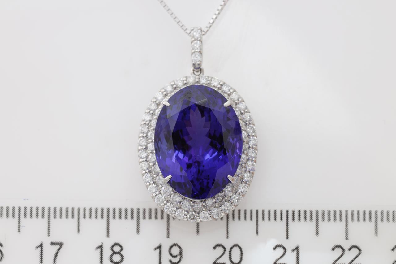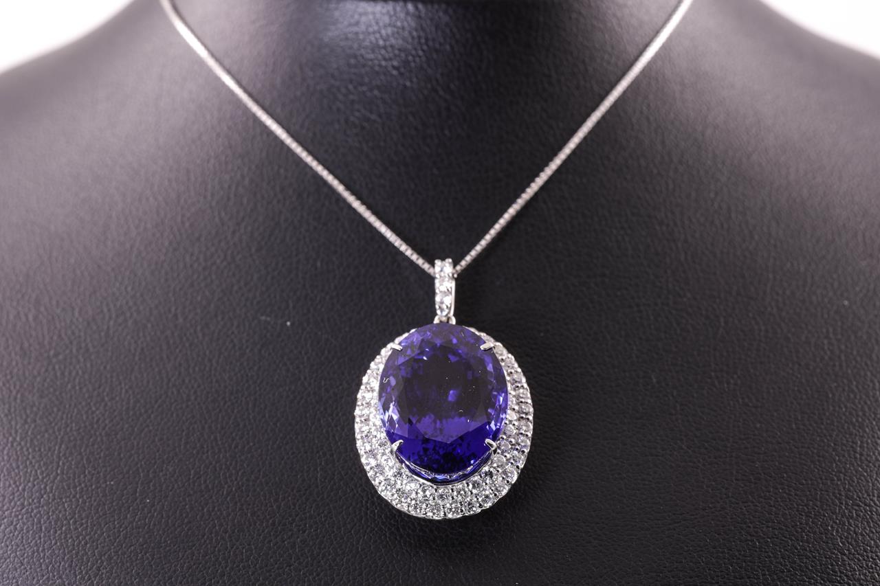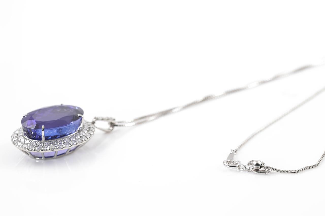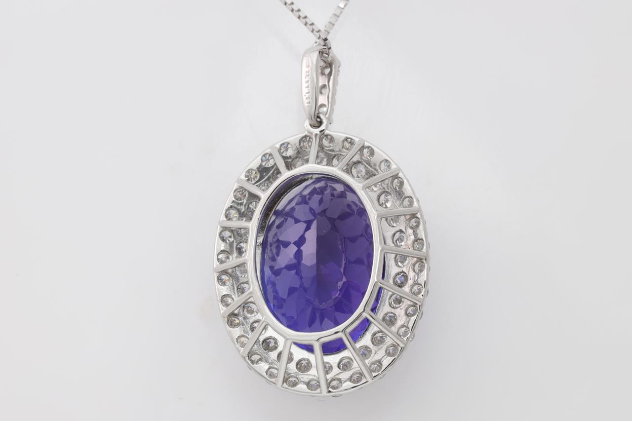 Tanzanite and Diamond pendant with an oval shape Tanzanite of 22.97ct and Diamonds totalling 1.57cts (Estimated grading: G-H SI). Platinum with 18ct white gold 44cm adjustable chain. Weight: 11.7g. With certificate #414820. (Pre-owned)