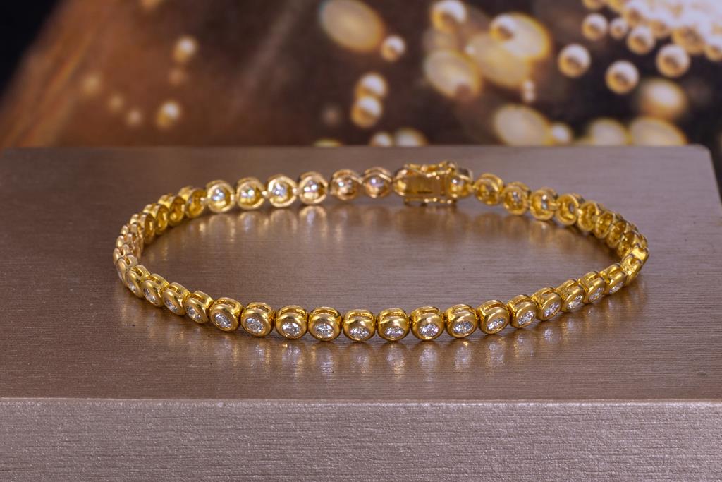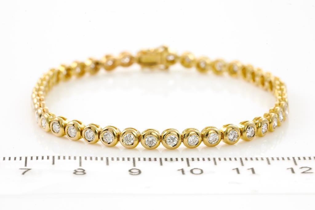 Tennis bracelet with round cut Diamodns totalling approximately 2.20cts (Estimated grading: H SI). 18ct yellow gold. Length 17.3cm. Weight 9.9g. (Pre-owned)