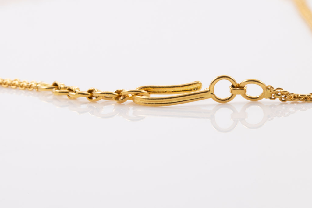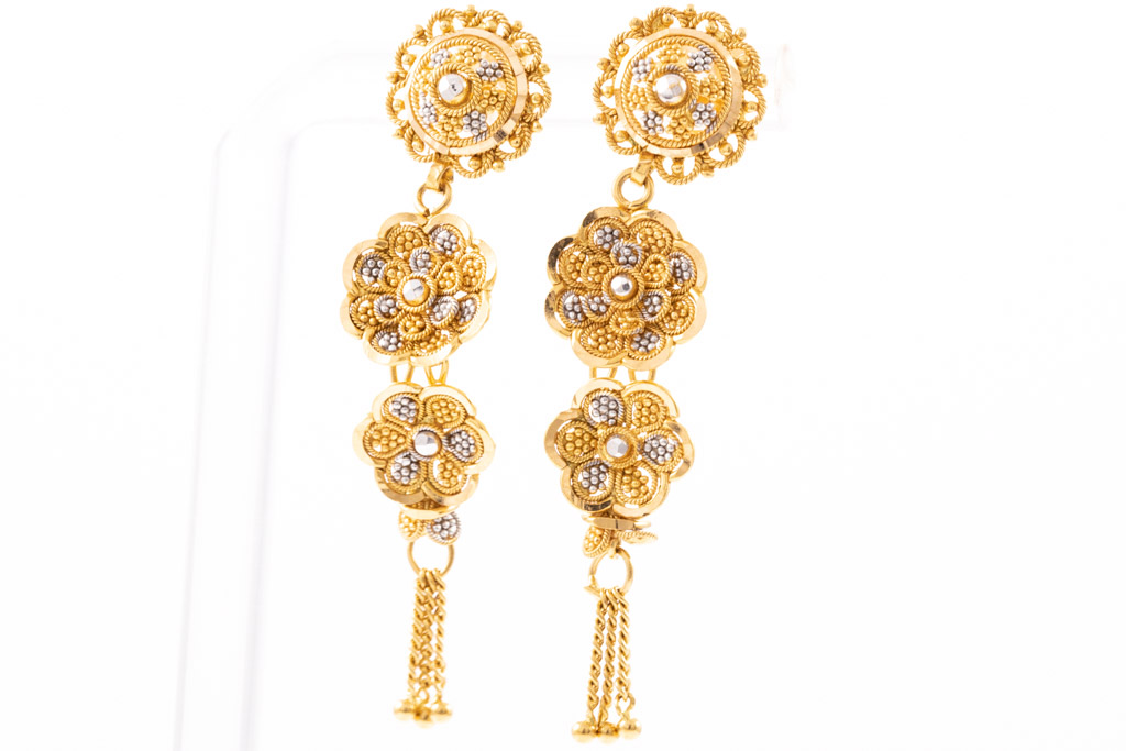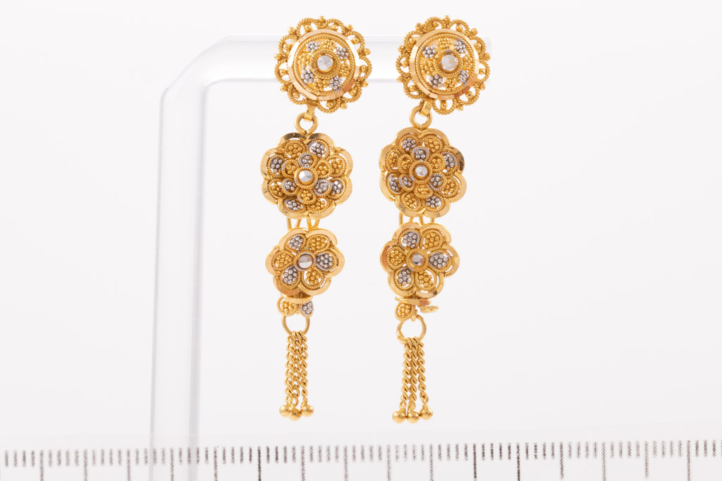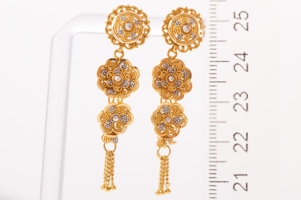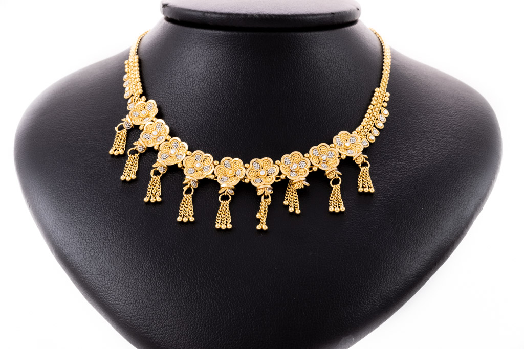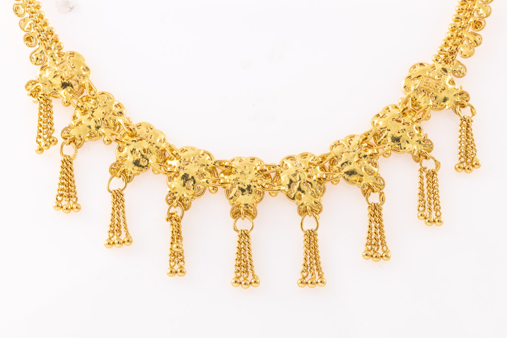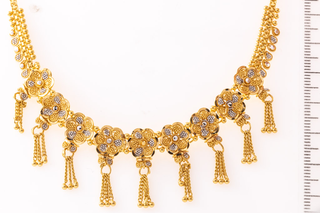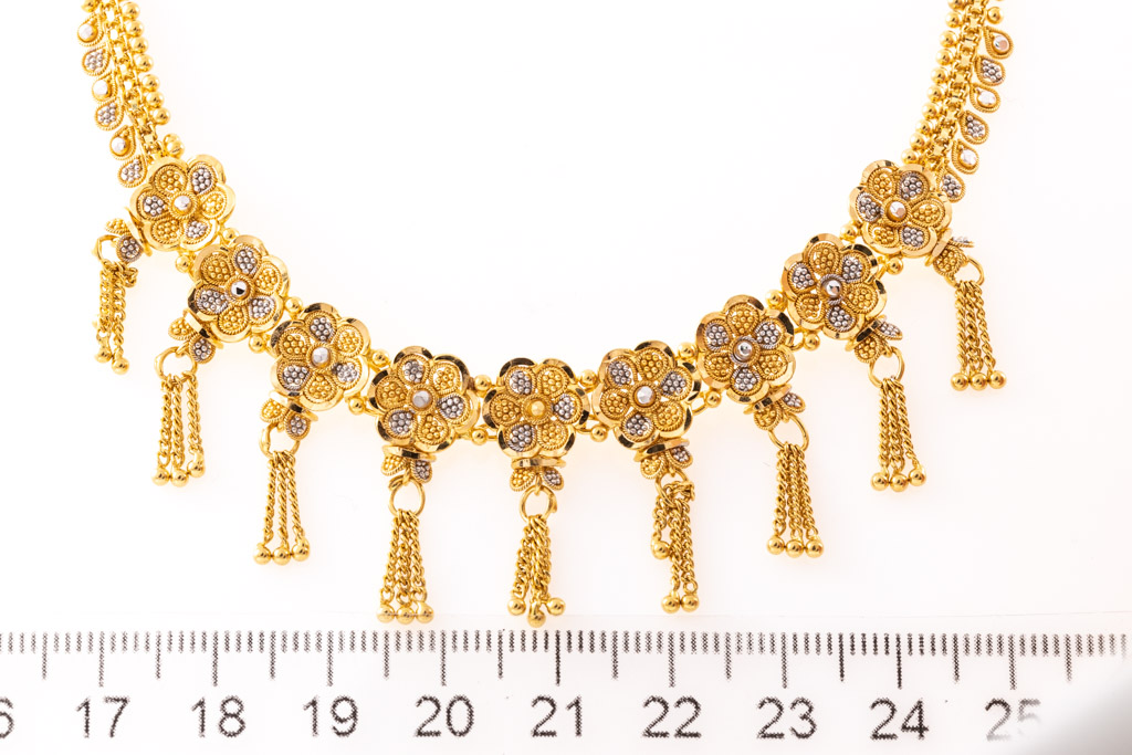22ct Gold set comprising necklace and drop earrings. 22ct yellow and white gold. Weight 29.4g. Length 40.5cm. (Pre-owned)