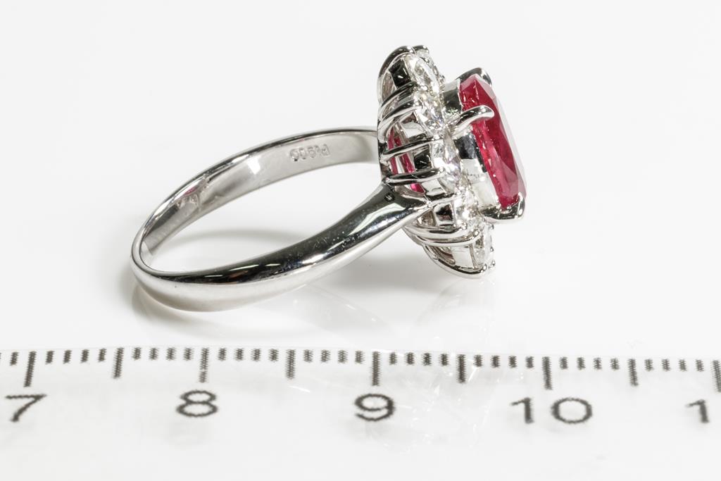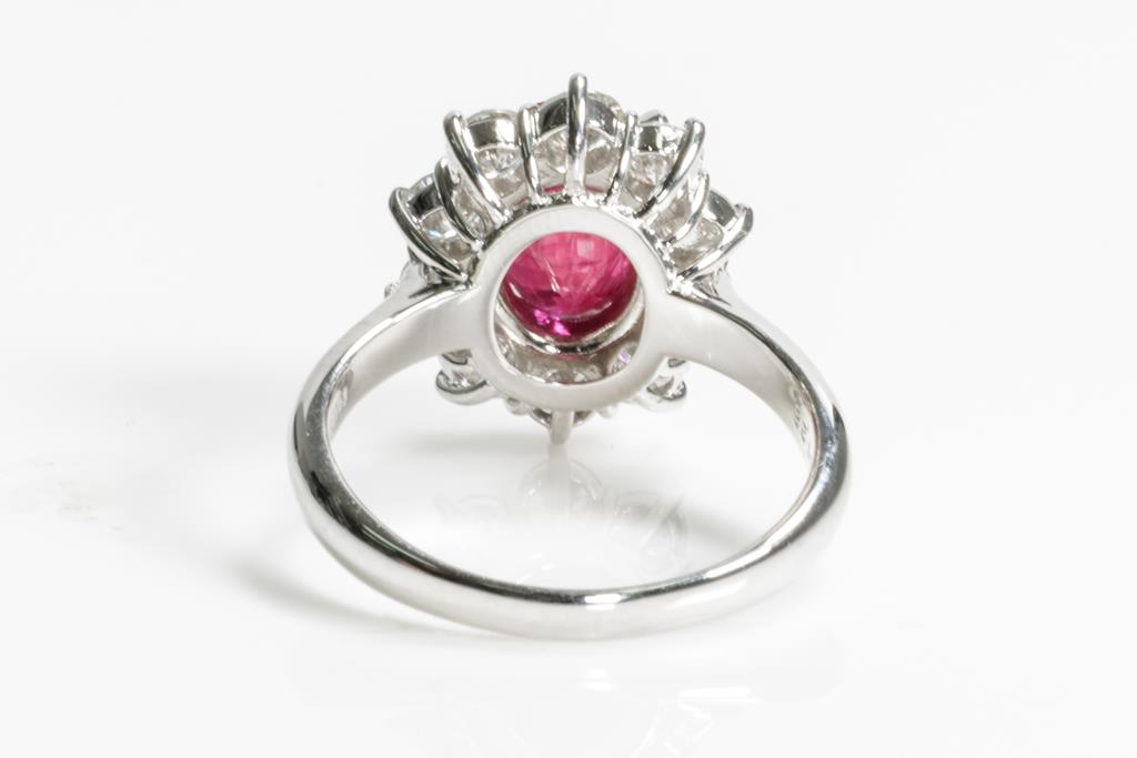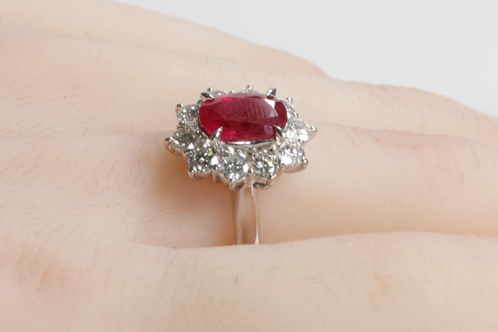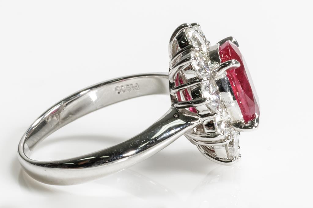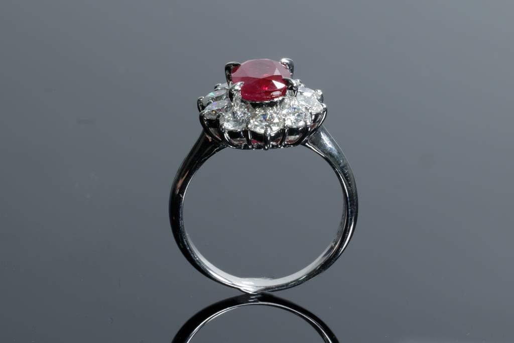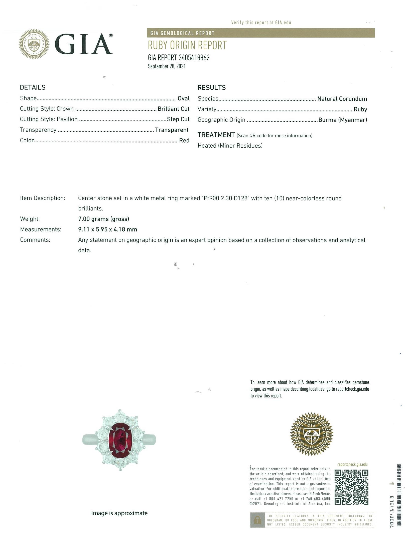 Ruby and Diamond ring with an oval shape Burmese Ruby of 2.30ct (with GIA report #3405418862) and round Diamonds totalling 1.28cts (Estimated grading: G-H SI). Platinum. Ring size L. Weight: 6.7g. (Pre-owned)