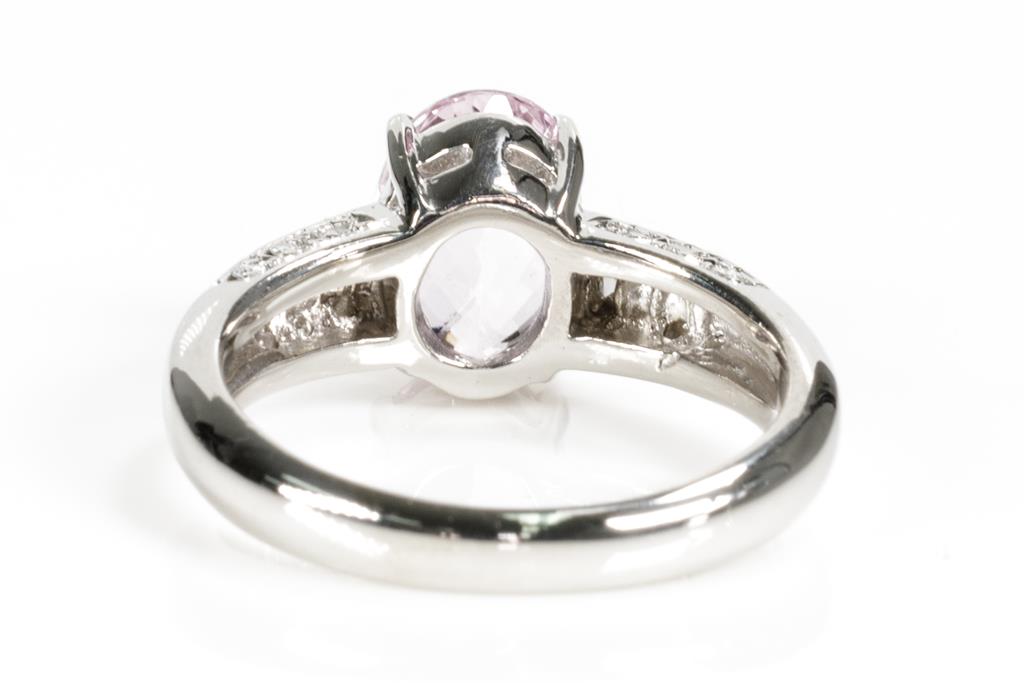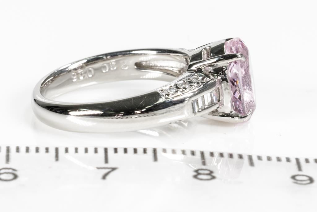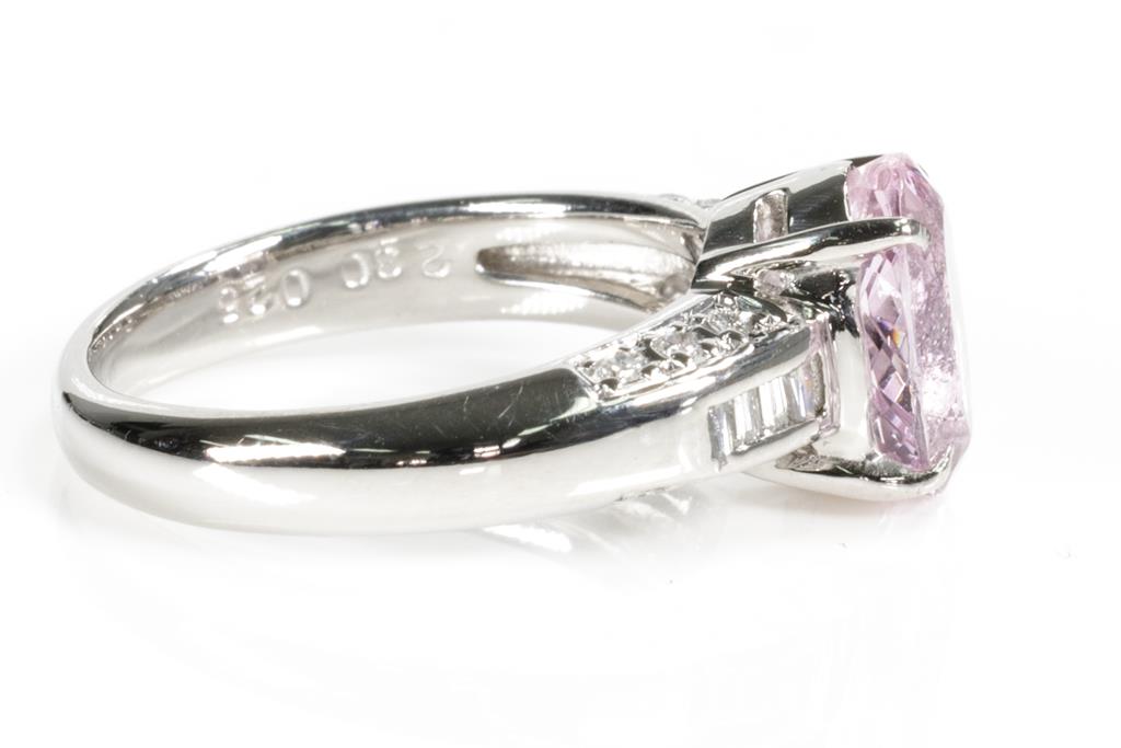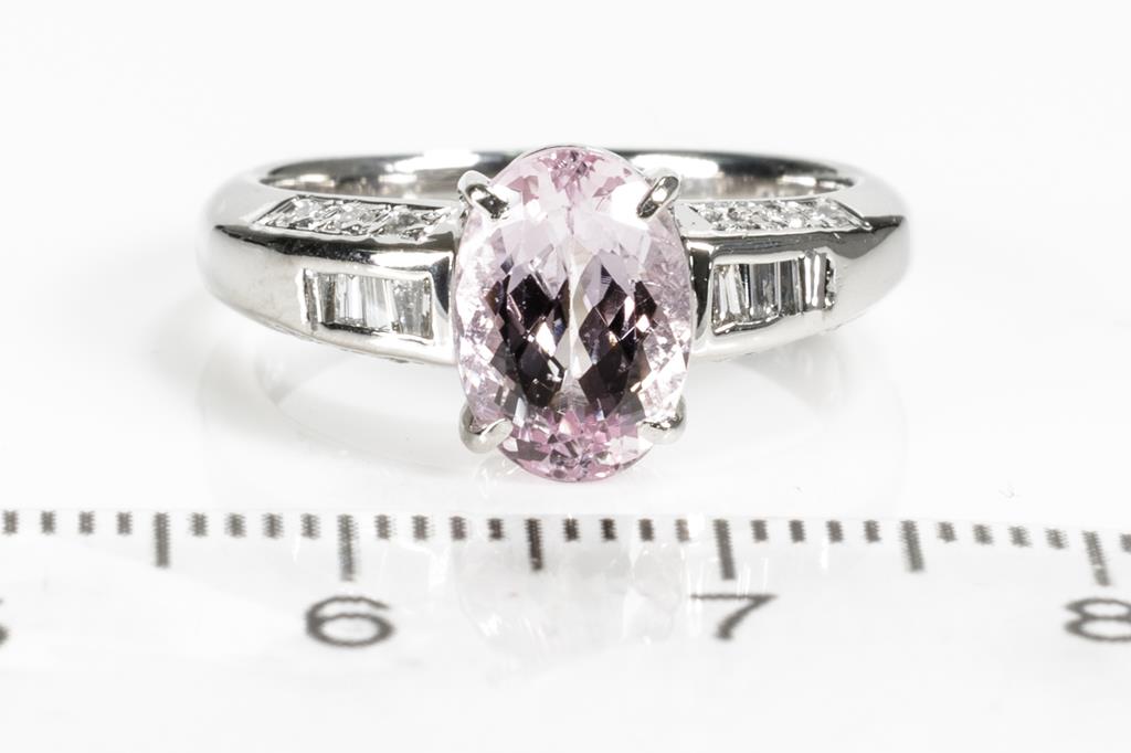 Kunzite and Diamond ring with an oval shape Kunzite of 2.30ct and round & baguette cut Diamonds totalling 0.25cts. Platinum. Ring size: L. Weight: 7g. (Pre-owned)