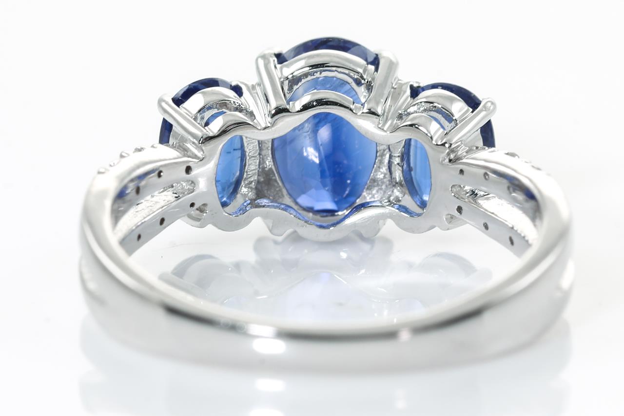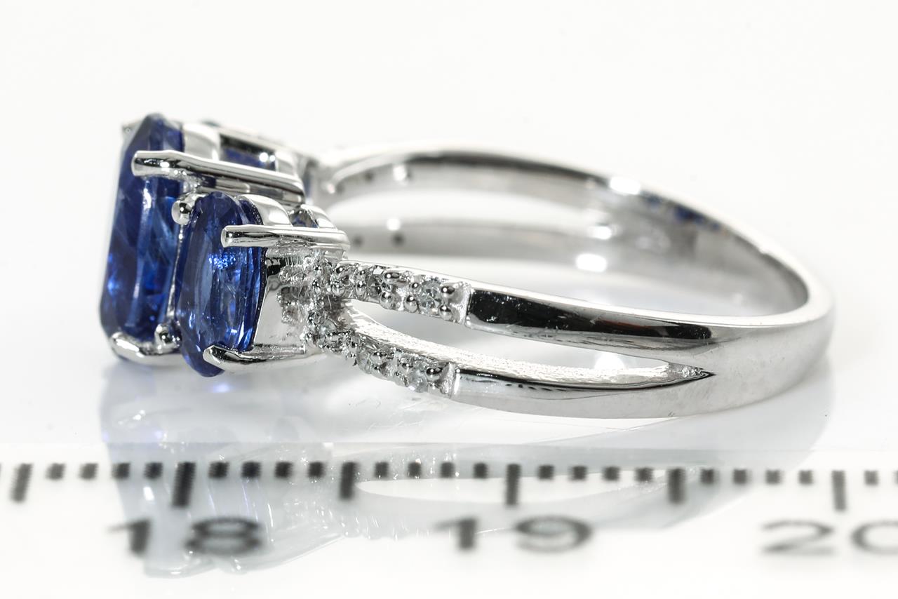 Kyanite and Diamond ring with 3 oval Kyanites totalling approximately 2.30cts and round Diamonds totalling approximately 0.06cts. 14ct white gold. Ring size L - ring resizing is not recommended. Weight: 3.4g. (As New)