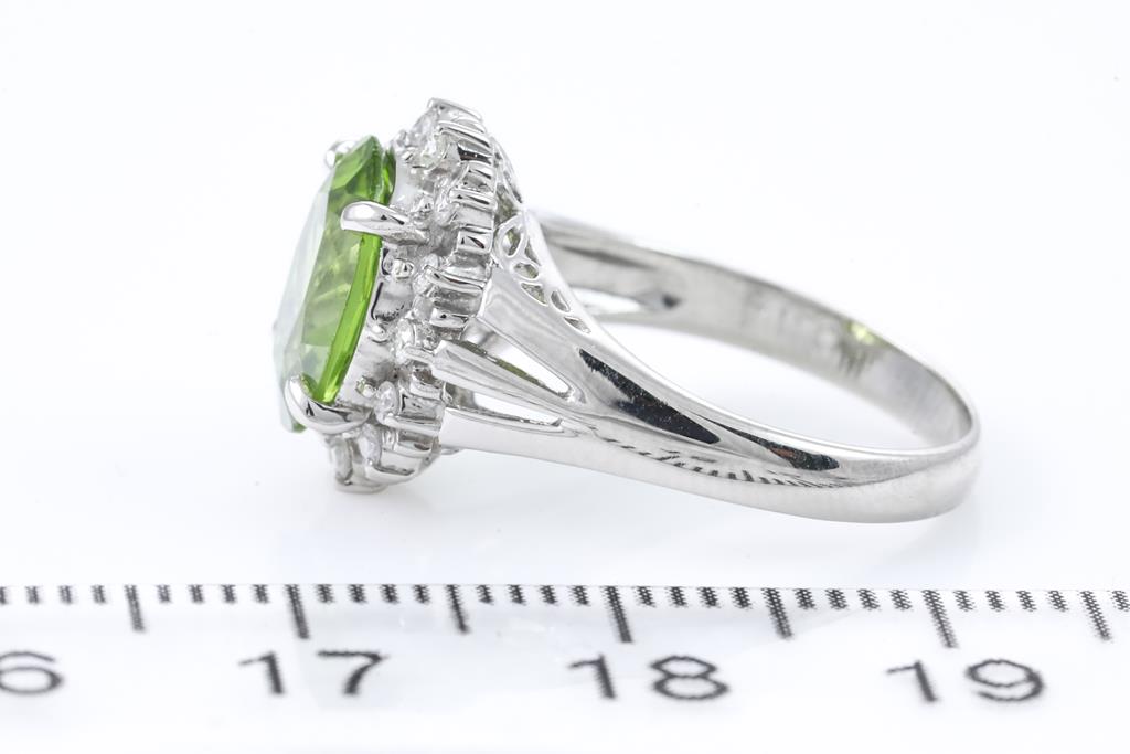 Peridot and Diamond ring with an oval shape Peridot of 2.30ct (note minor wear marks on stone) and round Diamonds totalling 0.14cts. Platinum. Ring size I. Weight: 5.1g. (Pre-owned)