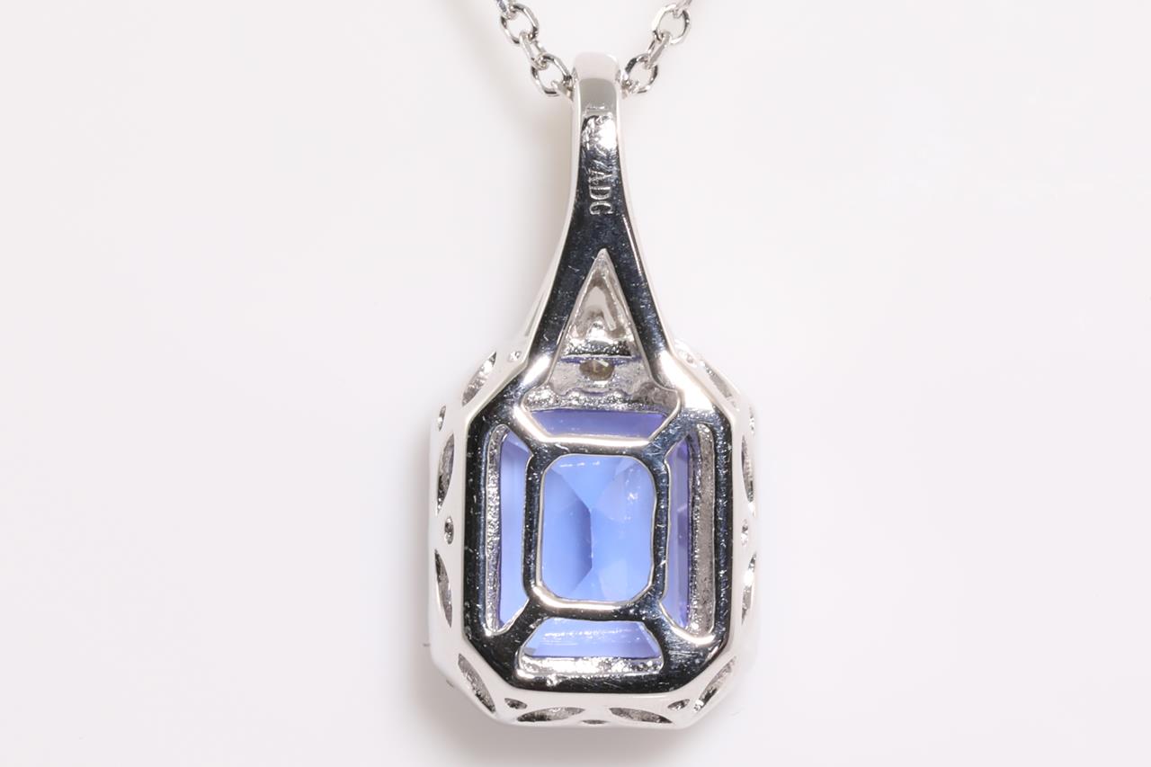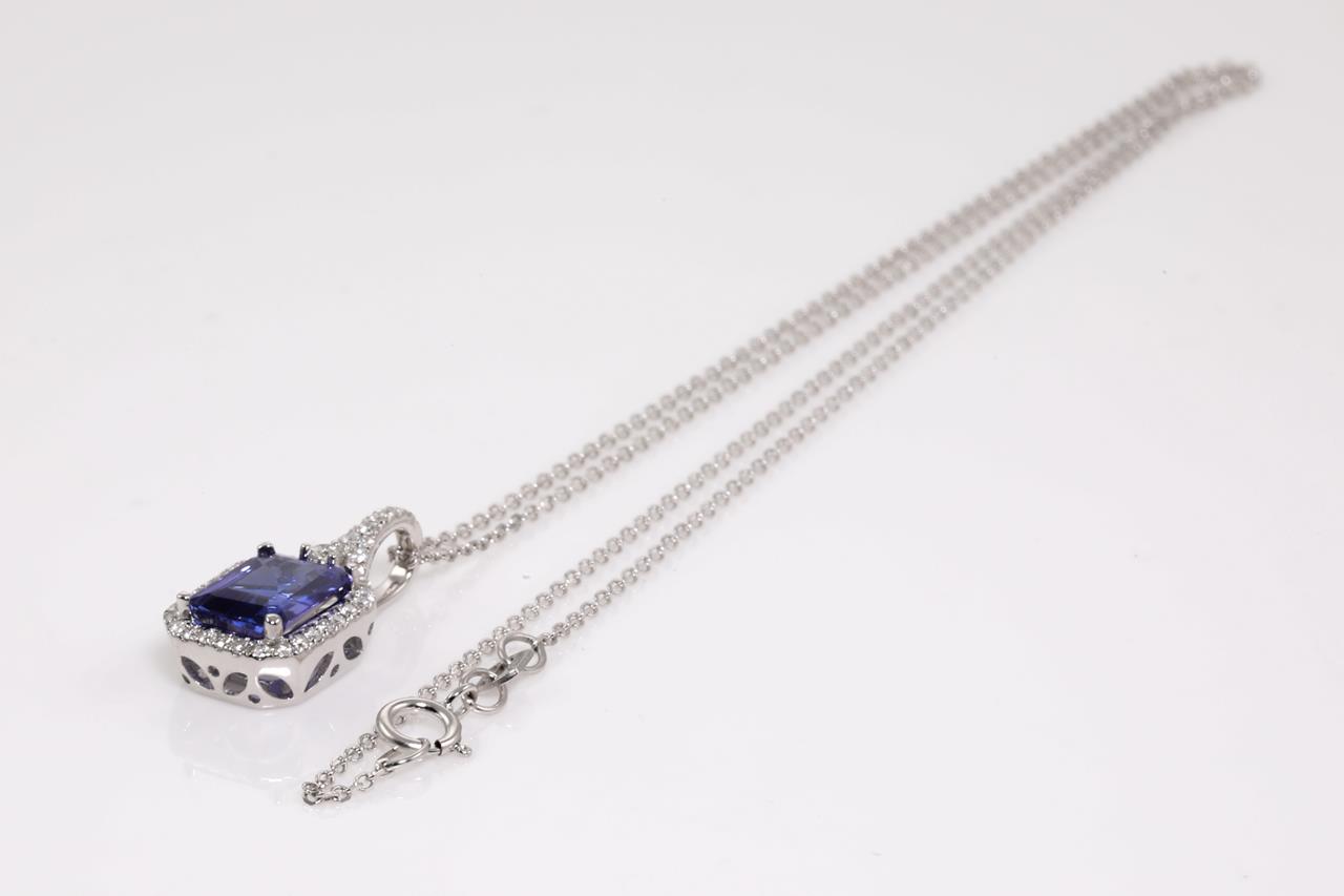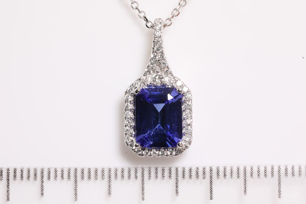 Tanzanite and Diamond pendant with an emerald cut Tanzanite of 2.30ct and Diamonds totalling 0.21cts. 14ct white gold with 45cm chain. Weight: 3.7g. (As new)