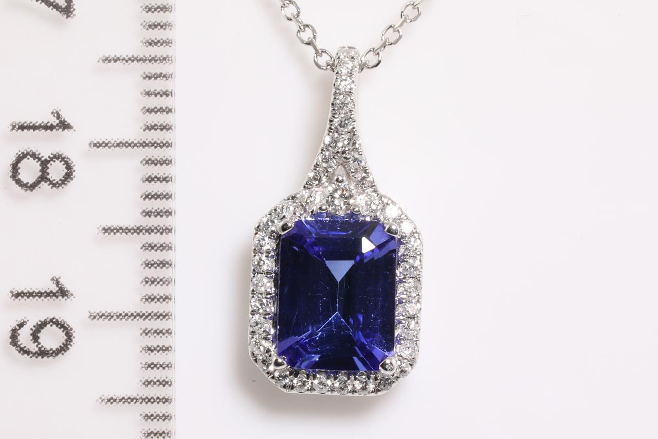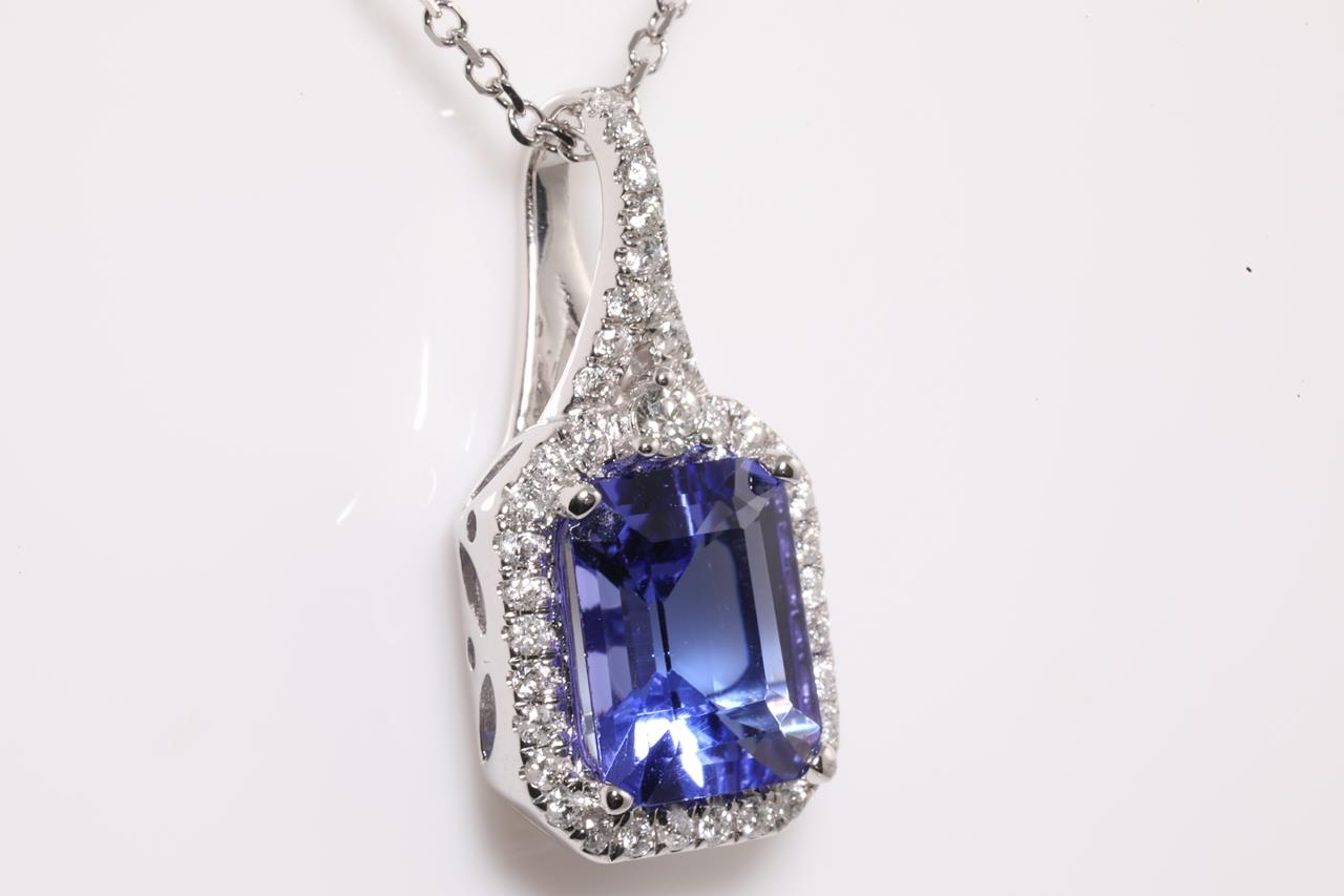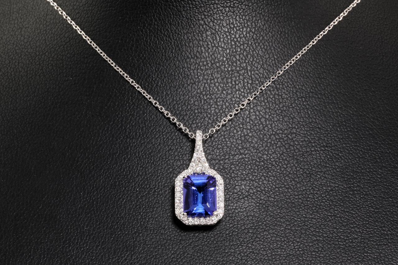Tanzanite and Diamond pendant with an emerald cut Tanzanite of 2.30ct and Diamonds totalling 0.21cts. 14ct white gold with 45cm chain. Weight: 3.7g. (As new)
