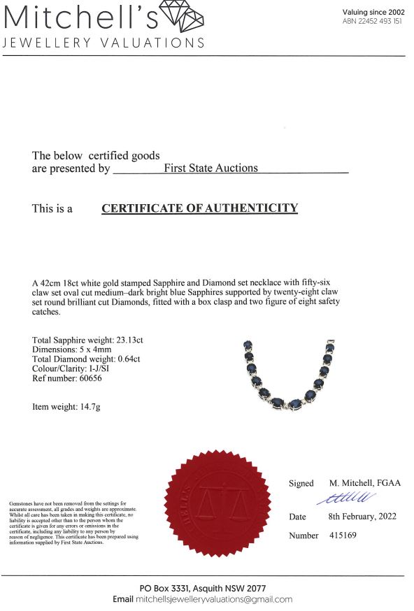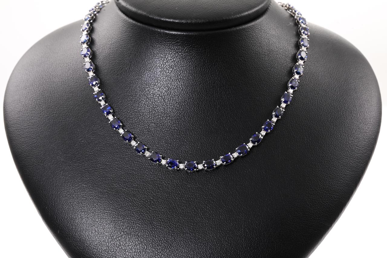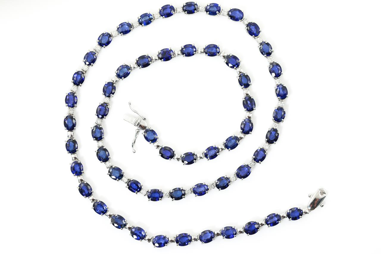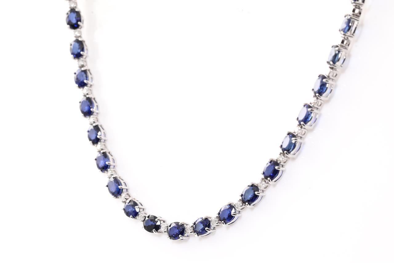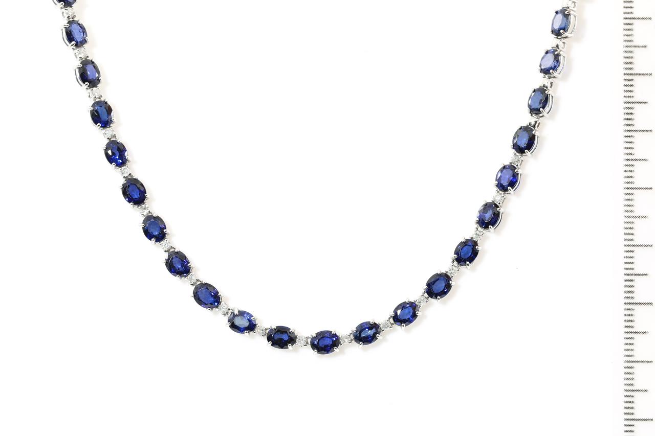 Sapphire and Diamond necklace with oval shape blue Sapphires totalling 23.13cts and round Diamonds totalling 0.64cts (Estimated grading: I-J SI). 18ct white gold. Length: 42cm. Weight: 14.7g. With Certificate #415169 (Pre-owned)