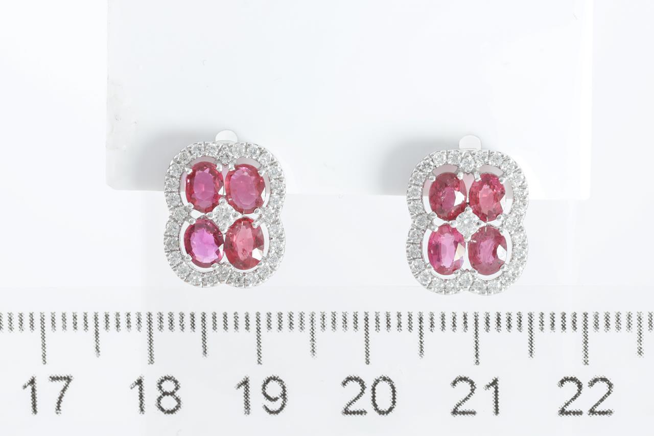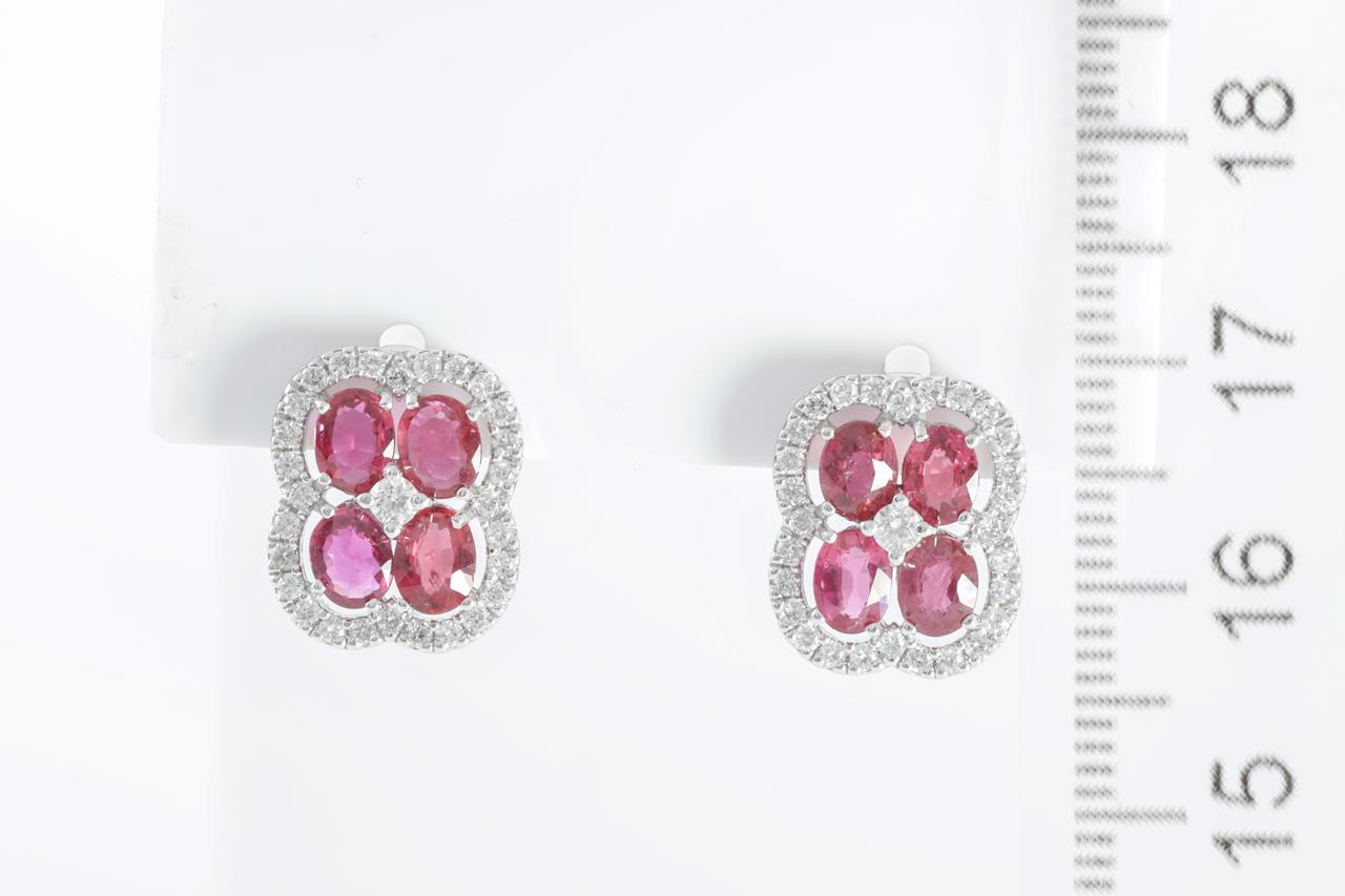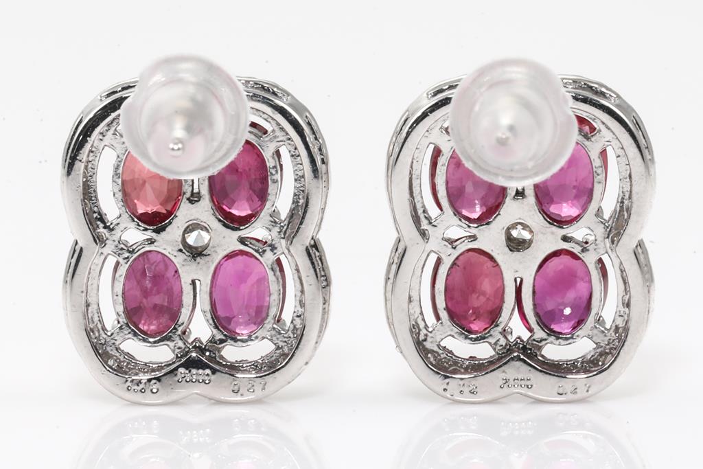 Ruby and Diamond Earrings with oval Rubies totalling 2.31cts andround Diamonds totalling 0.54cts (Estimated grading: G-H SI). Platinum with silicon backs. Weight: 4.7g (Pre-owned)