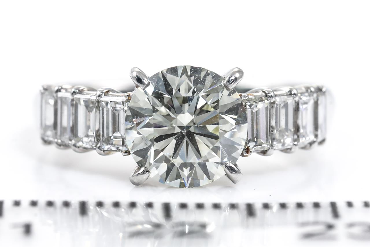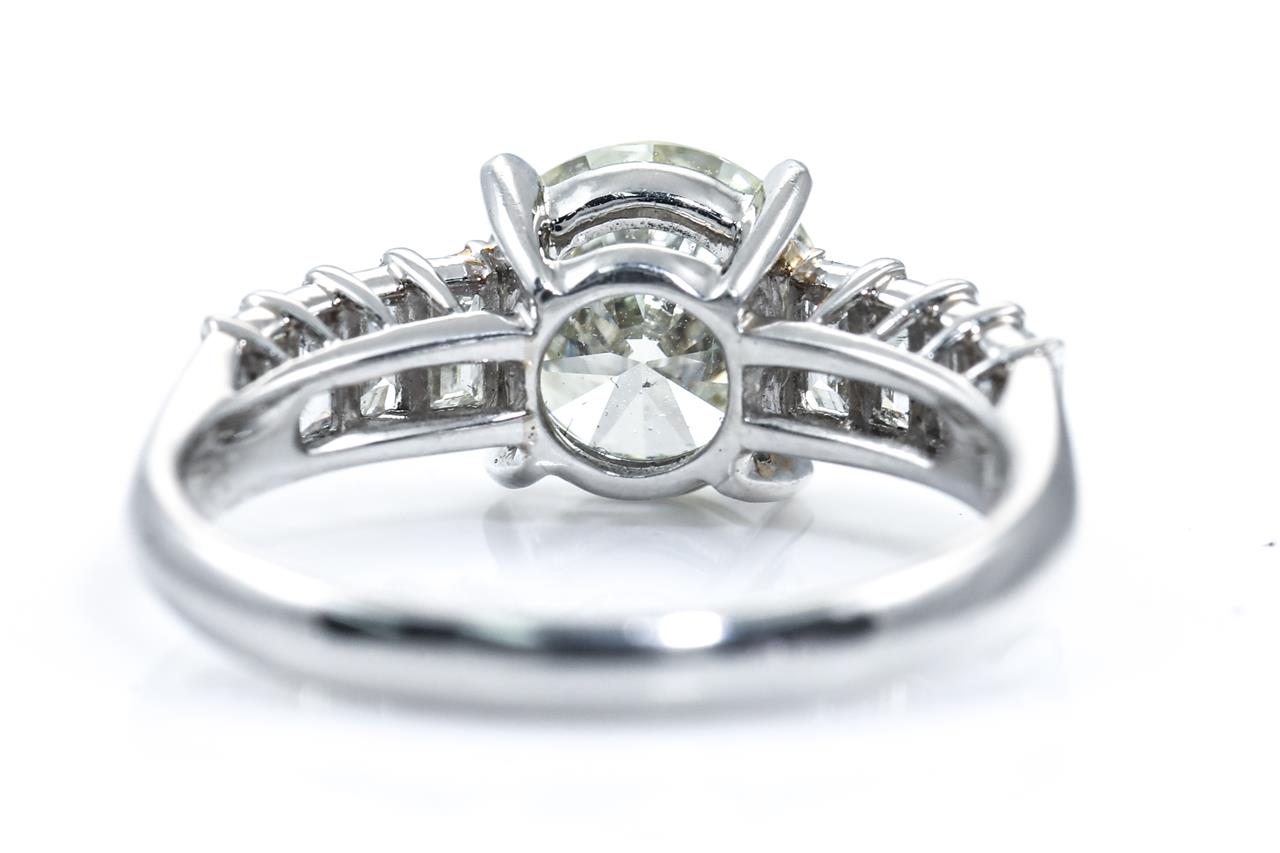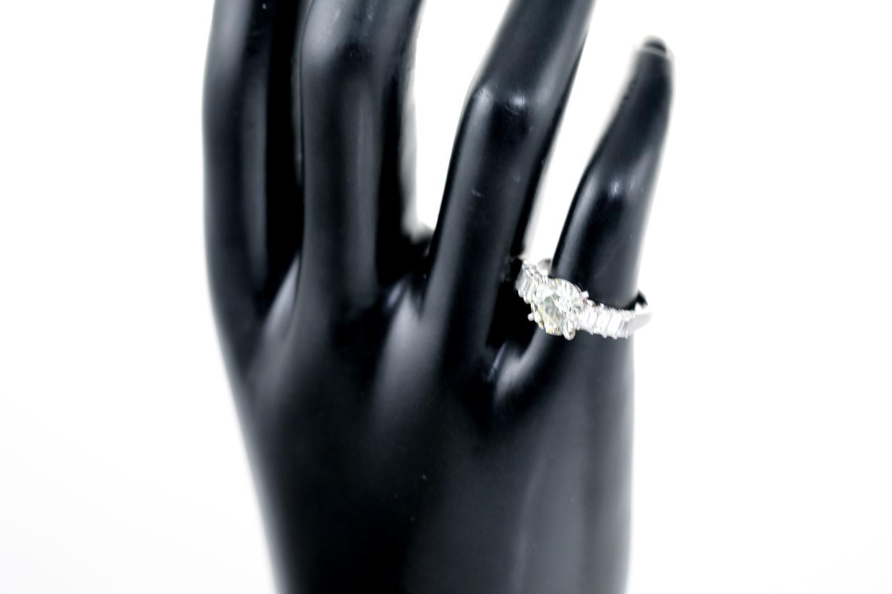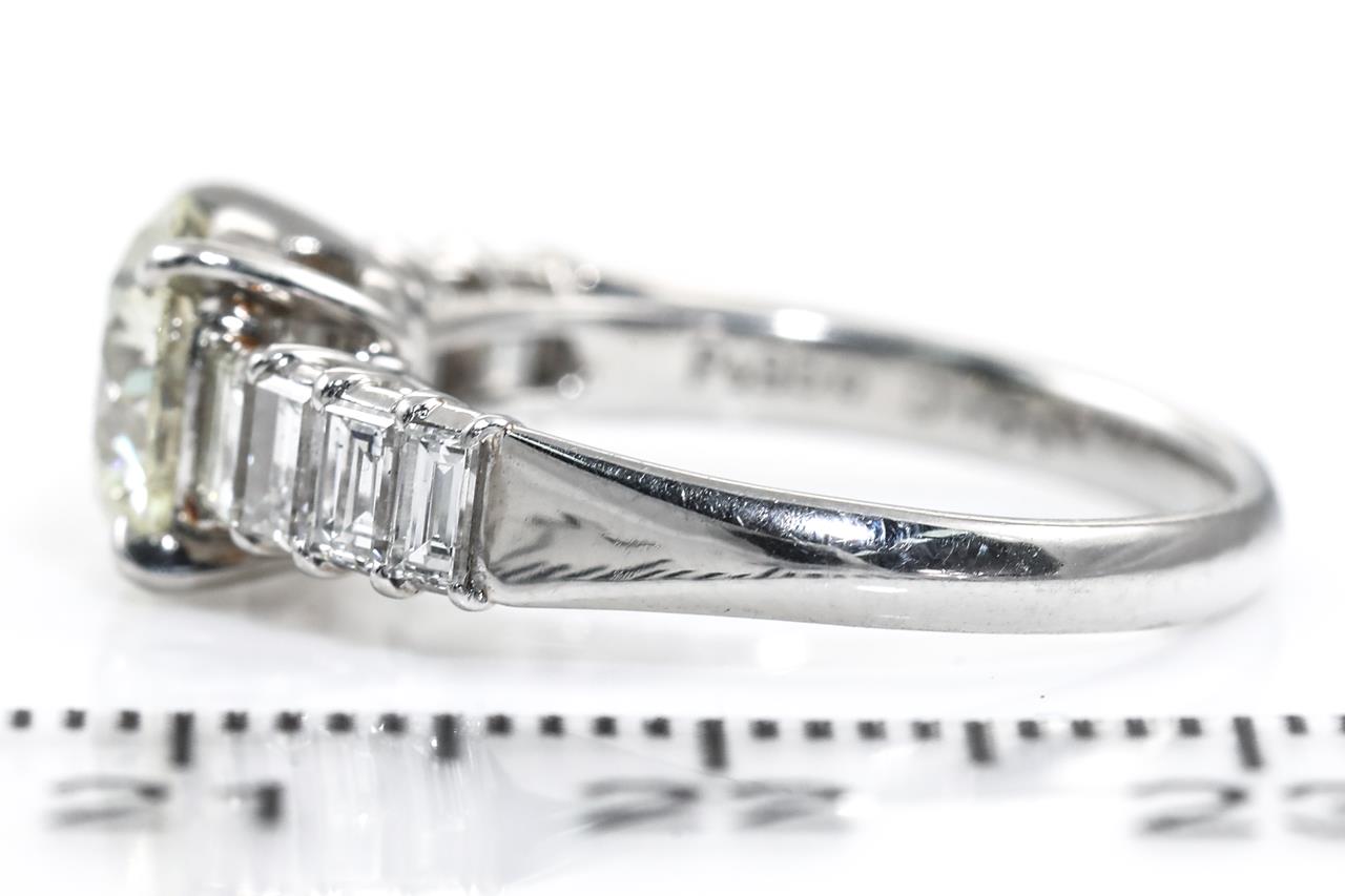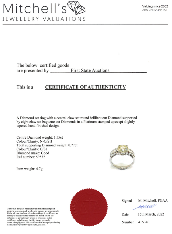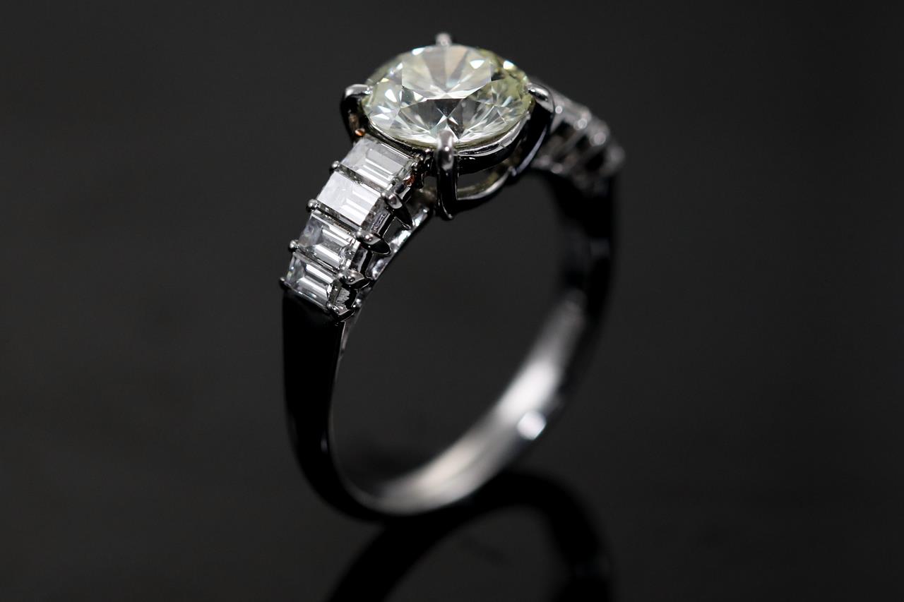Diamond ring with a centre round brilliant cut Diamond of 1.55ct (Estimated grading: N-O SI1) and 8 shoulder baguette cut Diamonds totalling 0.77cts (Estimated grading: G SI). Platinum - 950. Ring size K. Weight: 4.7g. With Certificate #415340. (Pre-owned)