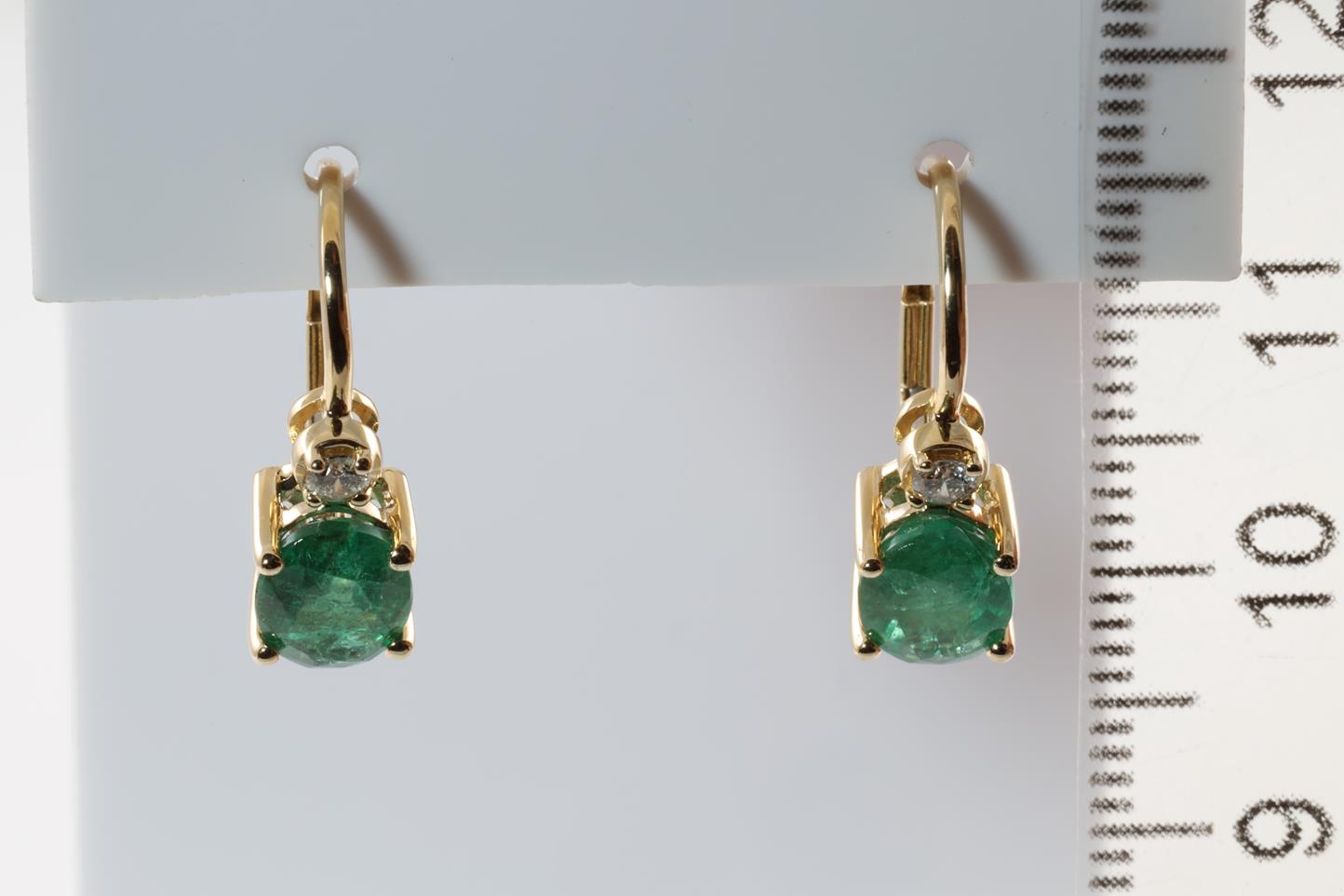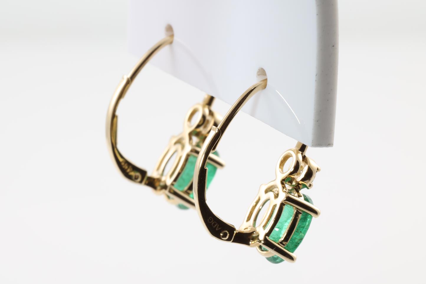 Emerald and Diamond leverback earrings with oval shape Emeralds totalling 2.32cts and 2 round Diamonds totalling 0.11cts. 14ct yellow gold. Weight: 2.7g (As New)
