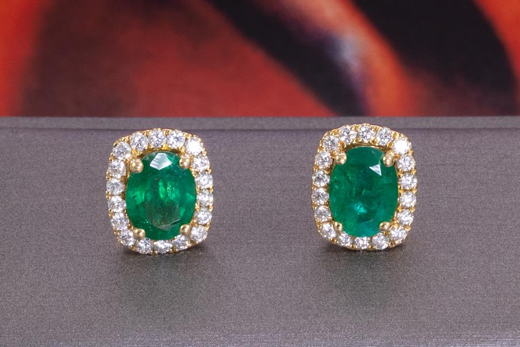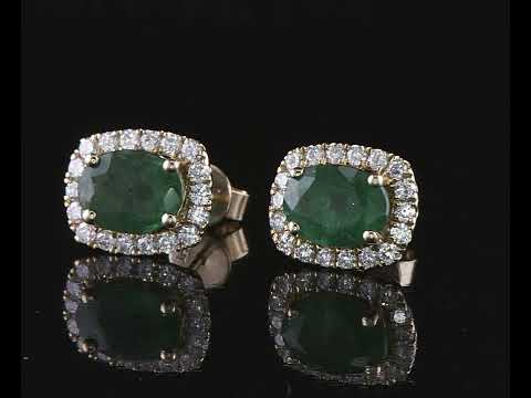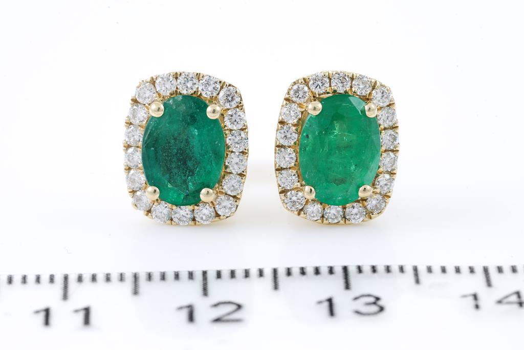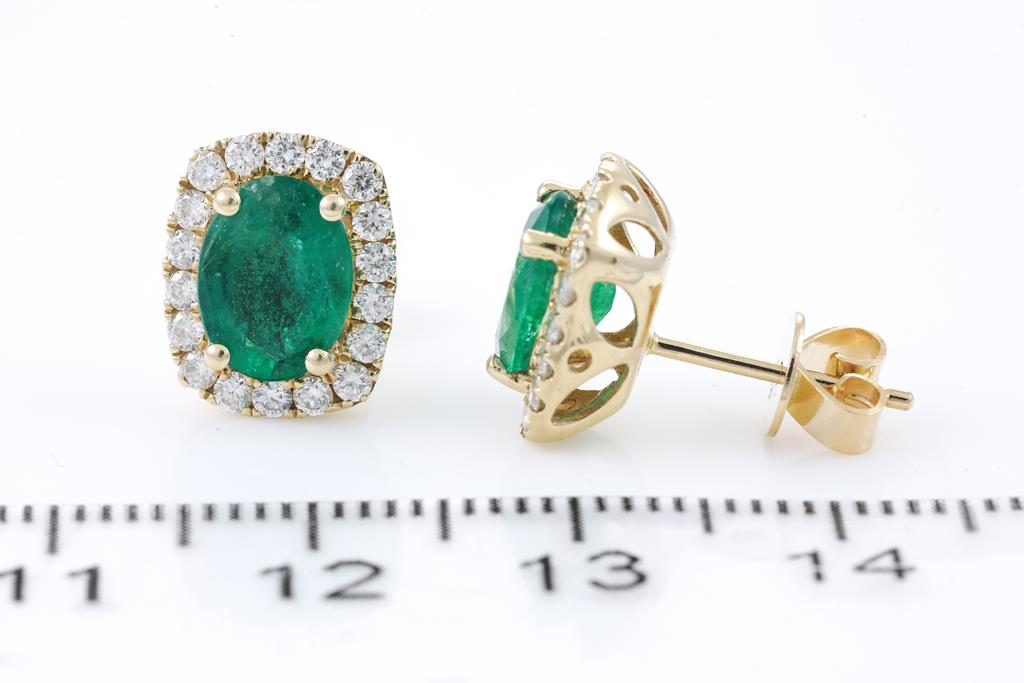 Emerald and Diamond earrings with oval shape Emeralds totalling 2.32cts and round Diamonds totalling 0.49cts (Estimated grading: H SI). 14ct yellow gold with 18ct yellow gold backs. Weight: 2.8g. (As new)