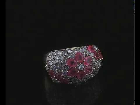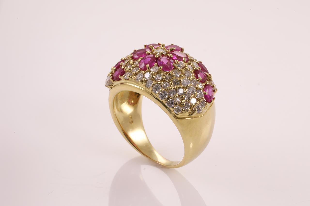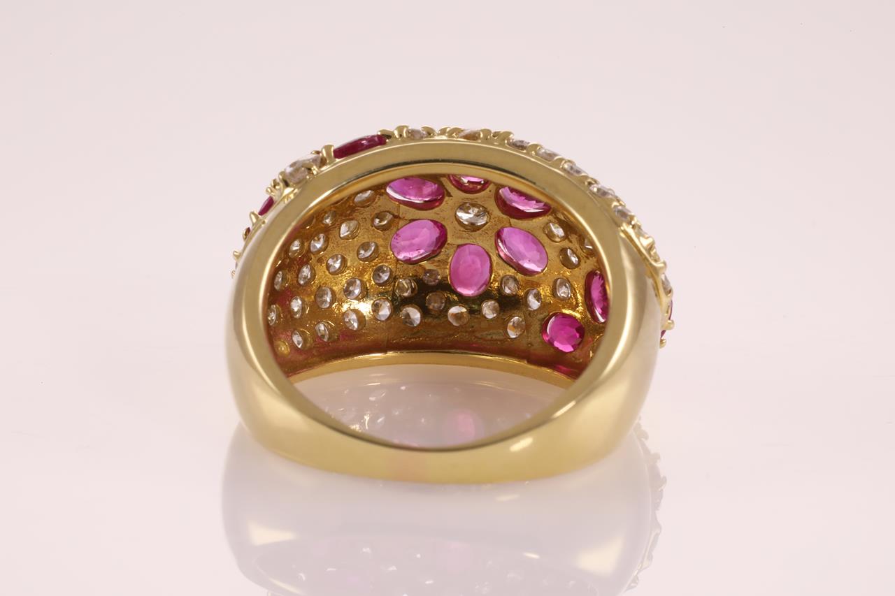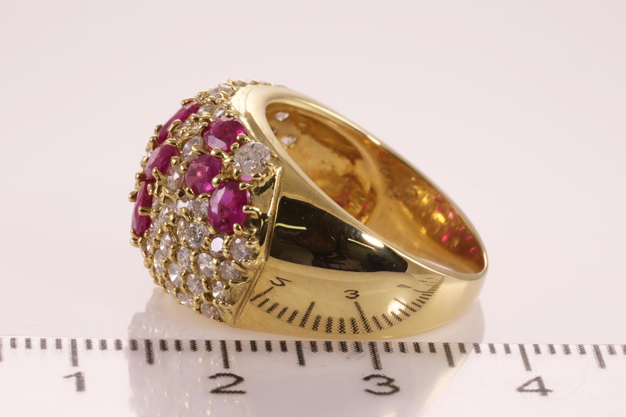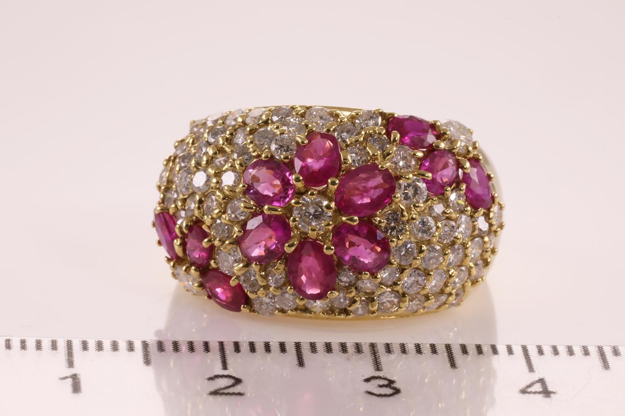 Ruby and Diamond ring with oval rubies totalling 2.32cts and Diamonds totalling 1.60cts (Estimated grading : H SI-P1). 18ct yellow gold. Ring size O1/2. Weight: 10.4g (Pre-owned)