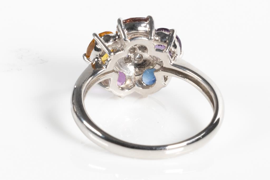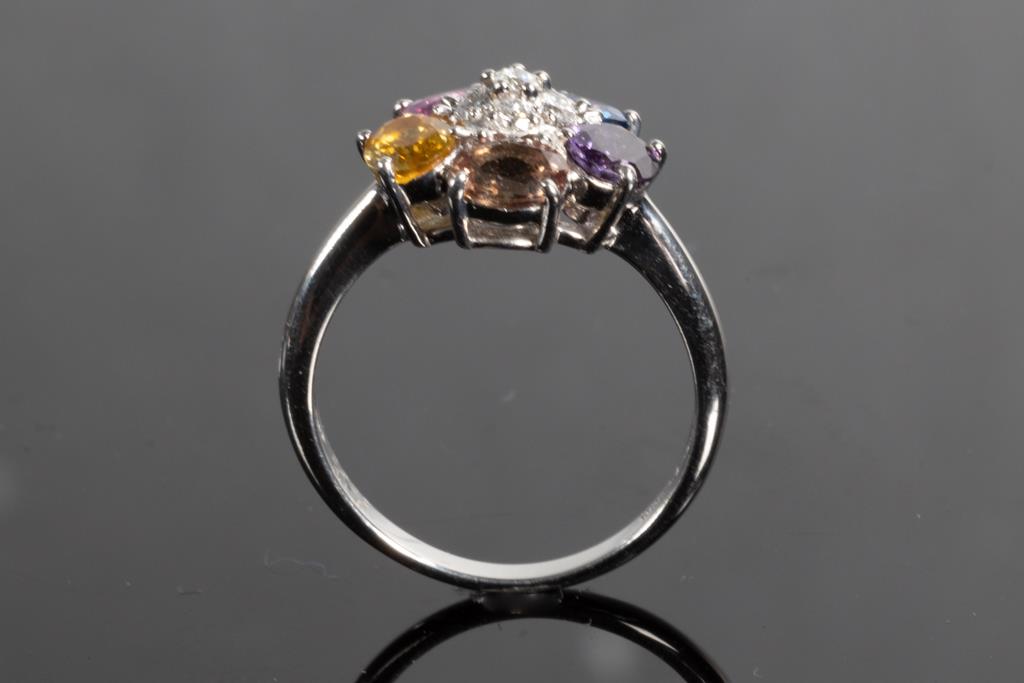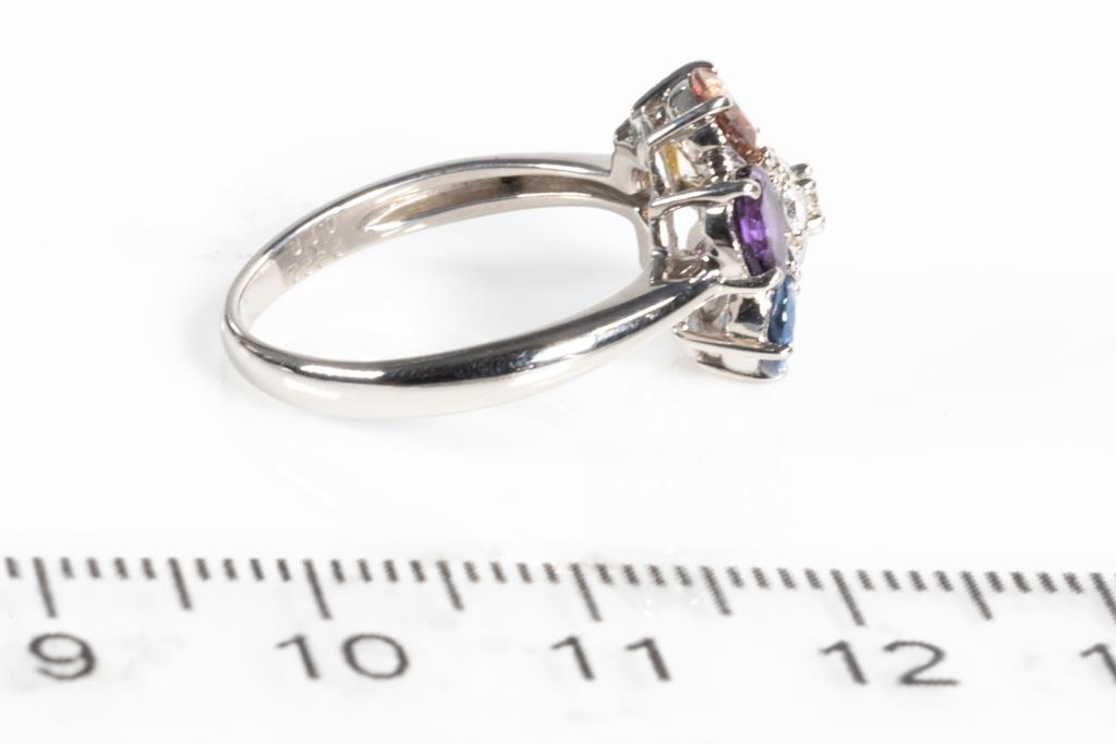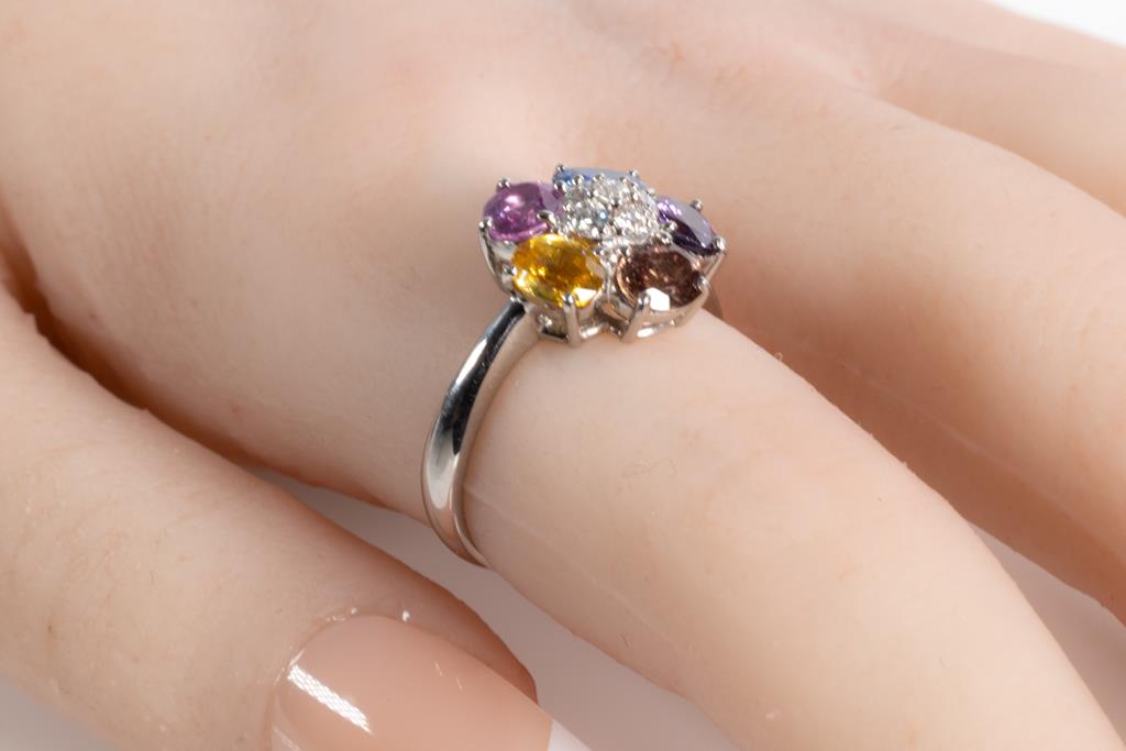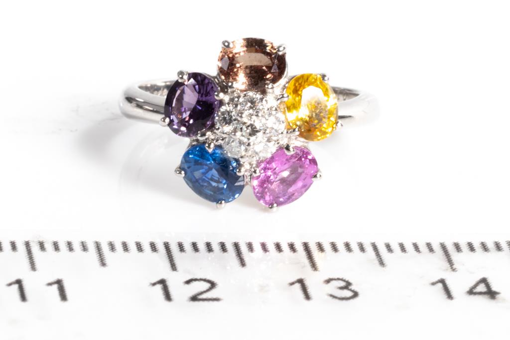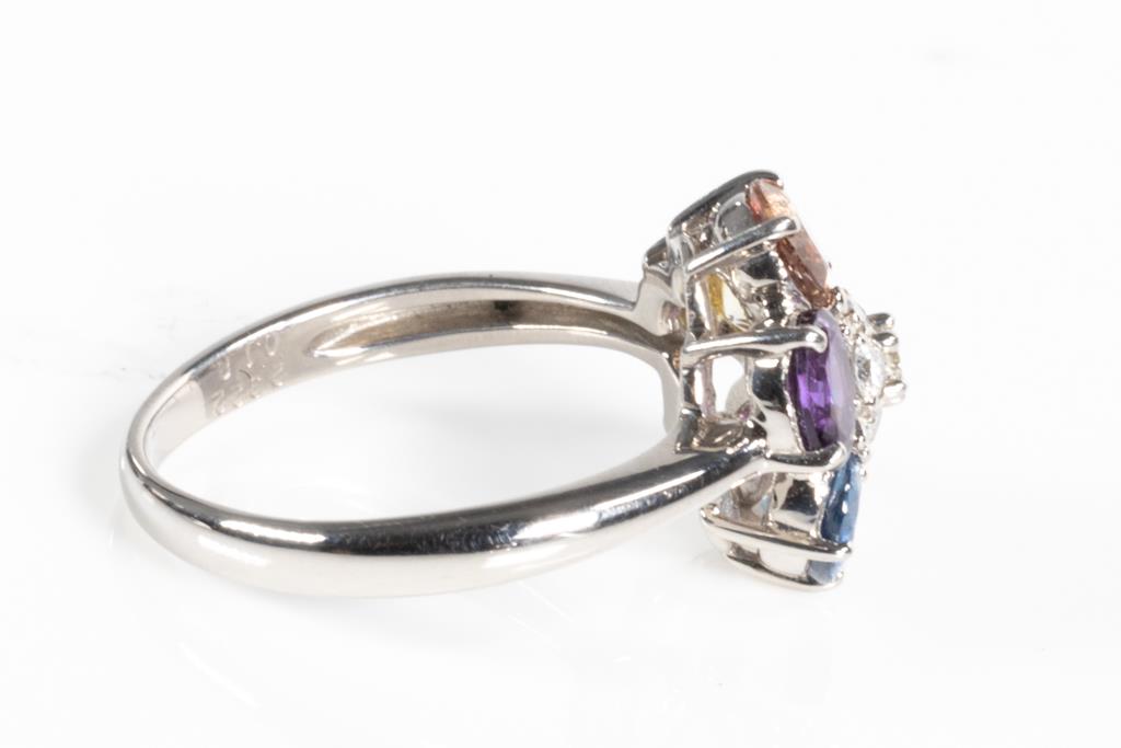 Sapphire and Diamond ring with oval shape multi-colour Sapphires totalling 2.32cts and round Diamonds totalling 0.18cts. Platinum. Ring size L. Weight: 5.3g. (Pre-owned)
