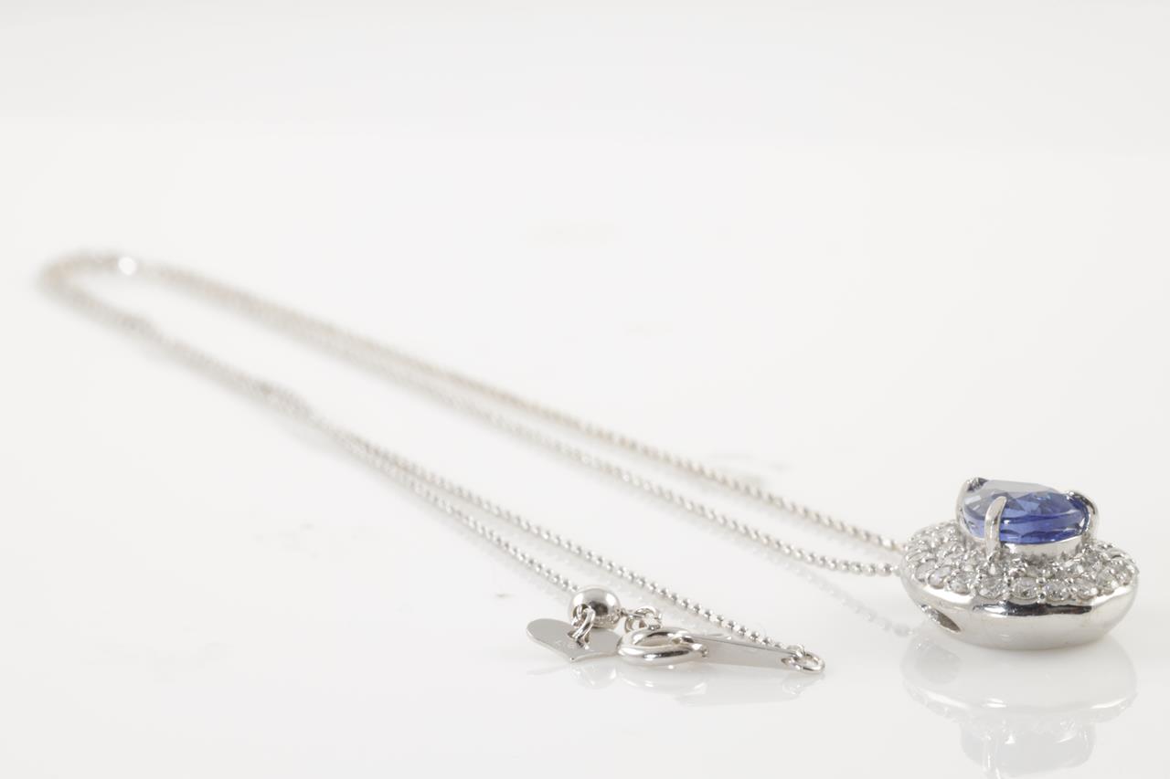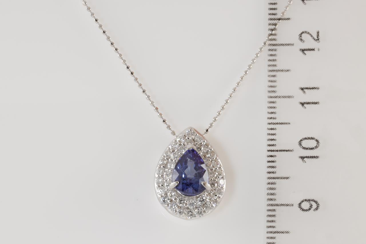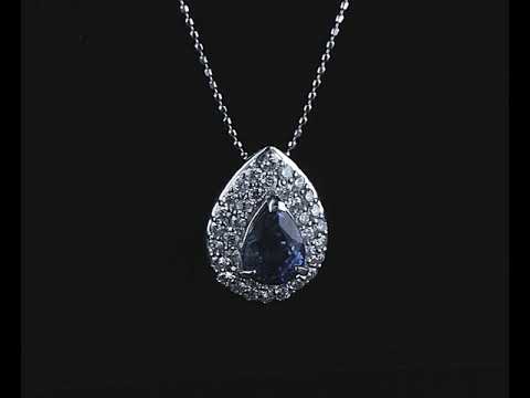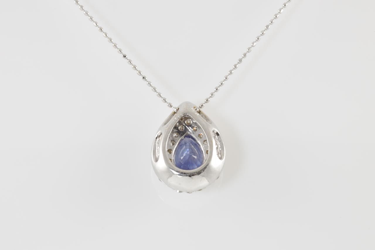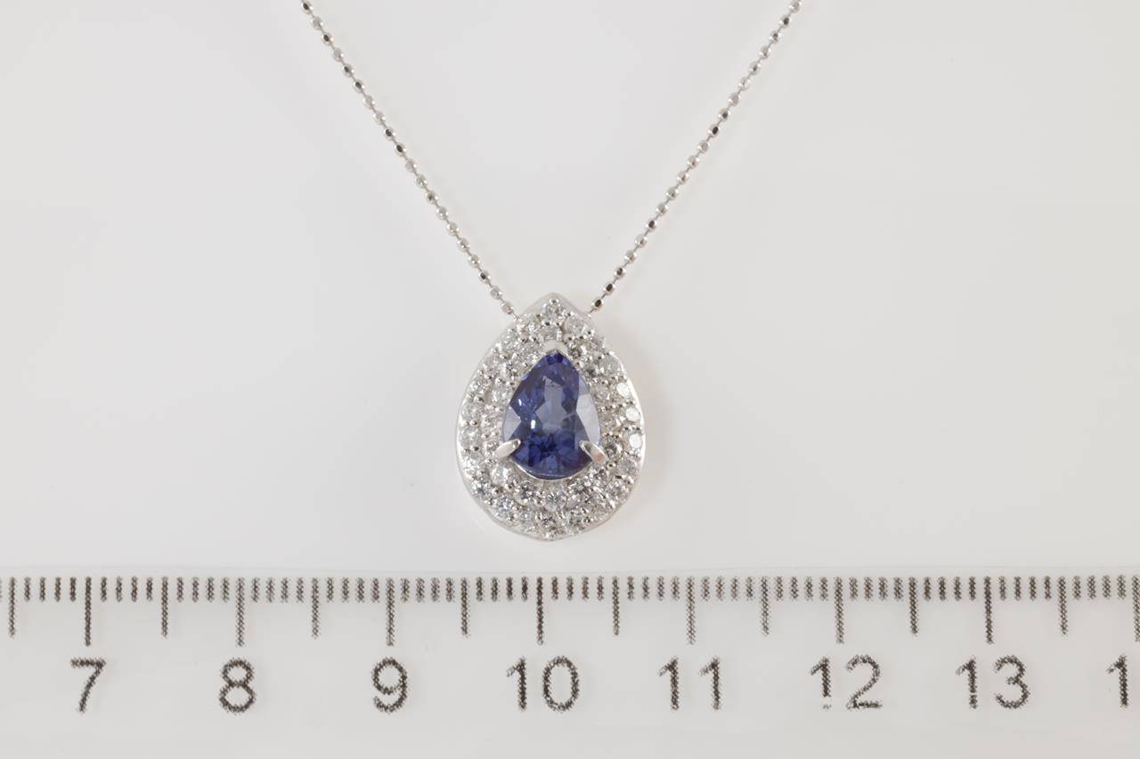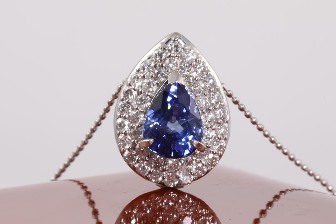Sapphire and Diamond pendant with a pear shape blue Sapphire of 2.33ct and Diamonds totalling 0.71cts (Estimated grading: G-H SI-P1). 18ct white gold with 18ct gold adjustable 45cm chain. Weight: 5.6g (Pre-owned)