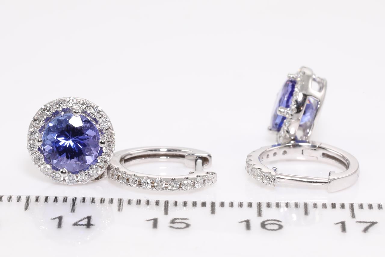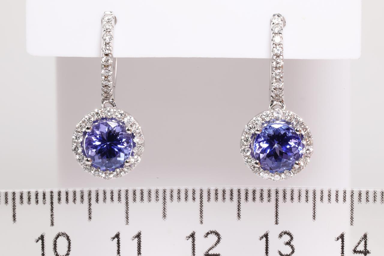 Tanzanite and Diamond earrings with round Tanzanite totalling 2.33cts and Diamonds totalling 0.49cts (Estimated grading: G-H SI-P1). 14ct white gold. Weight: 4g. (As new)