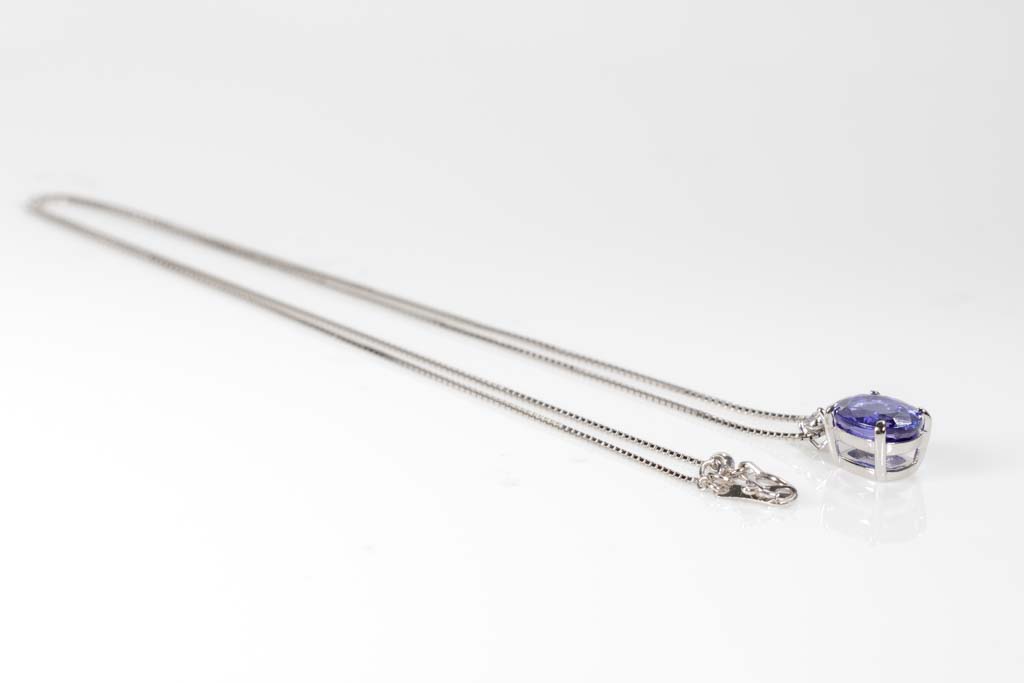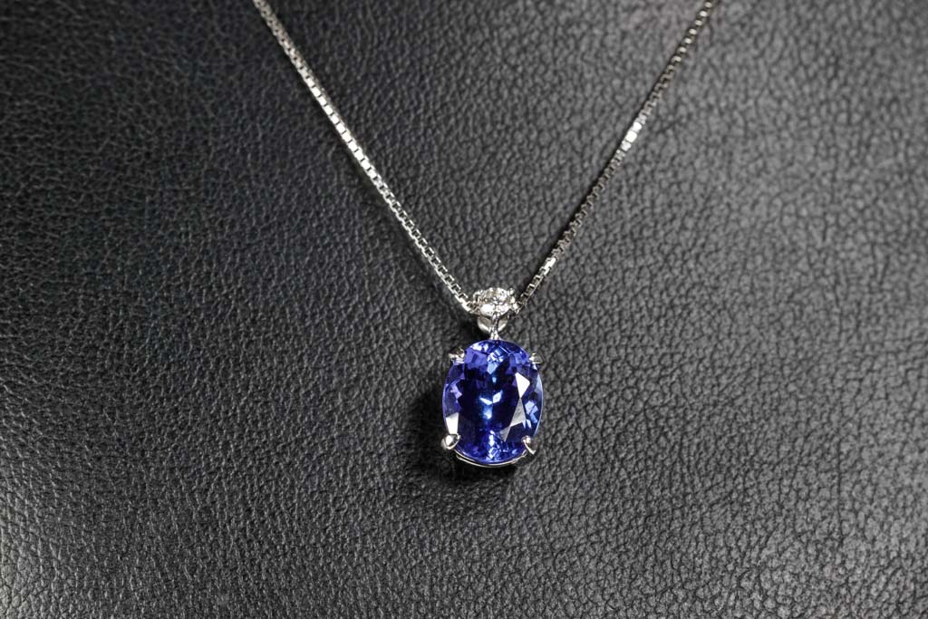 Tanzanite and Diamond pendant with an oval shape Tanzanite of 2.33ct and a round Diamond of 0.04ct. Platinum with 18ct white gold adjustable 44cm chain. Weight: 3.7g. (Pre-owned)