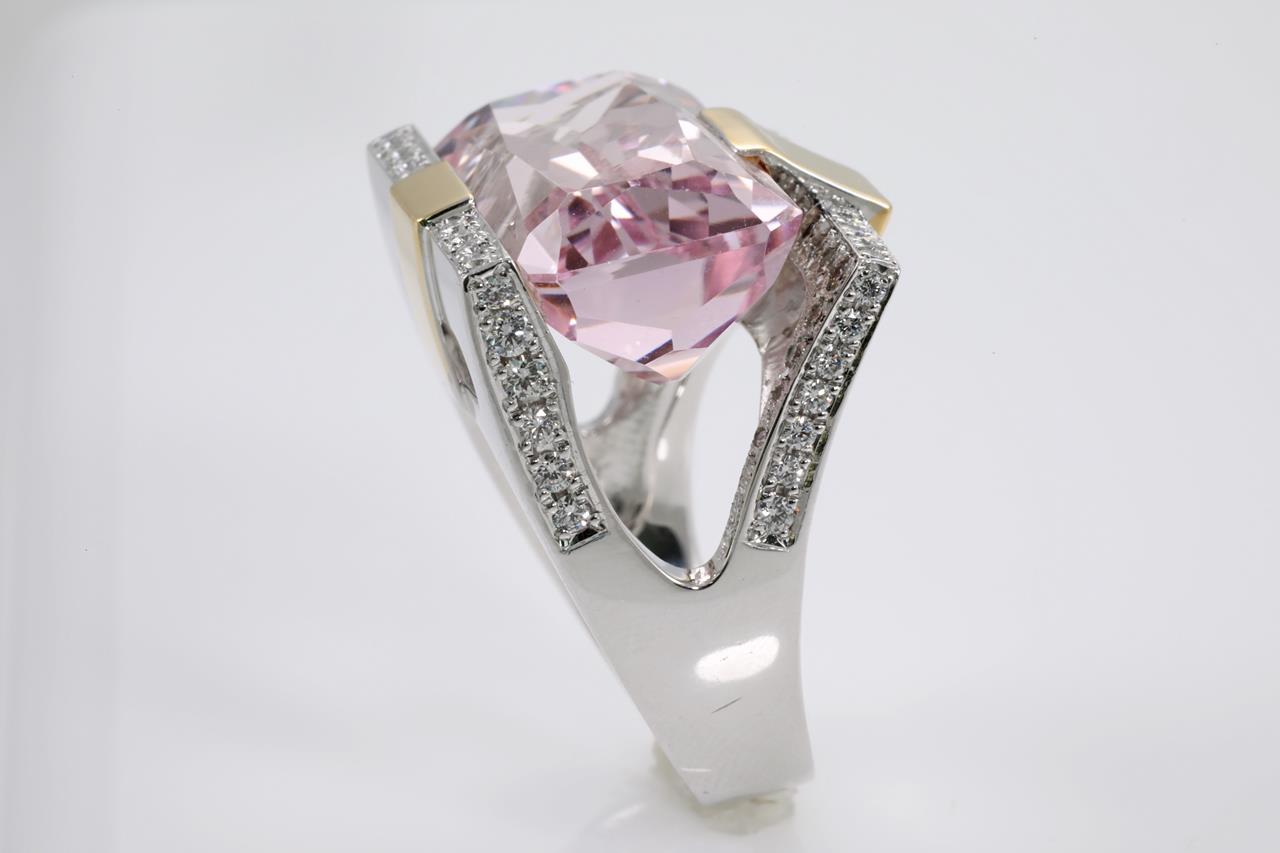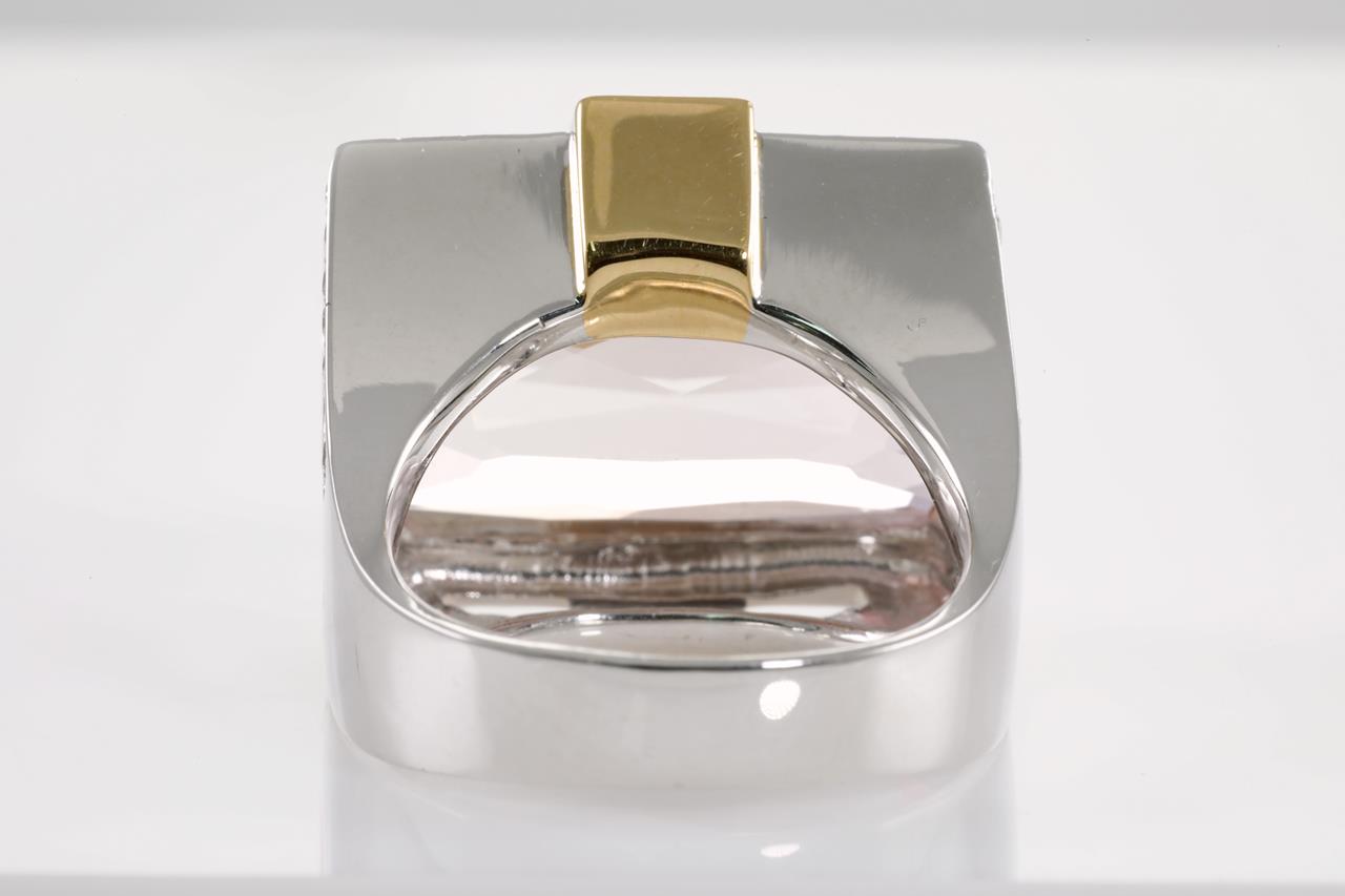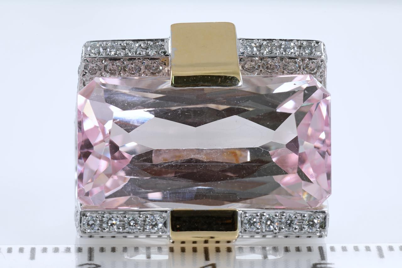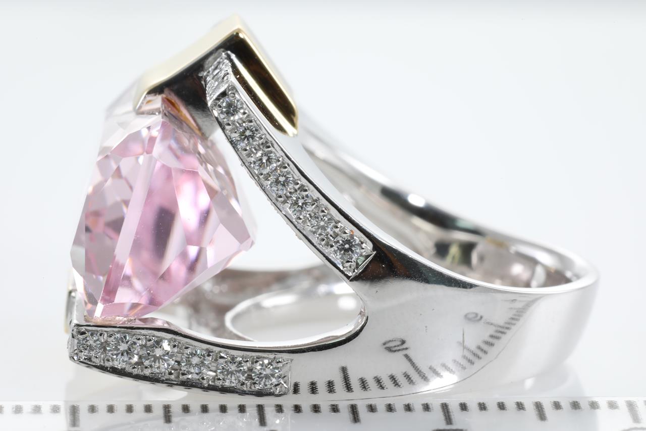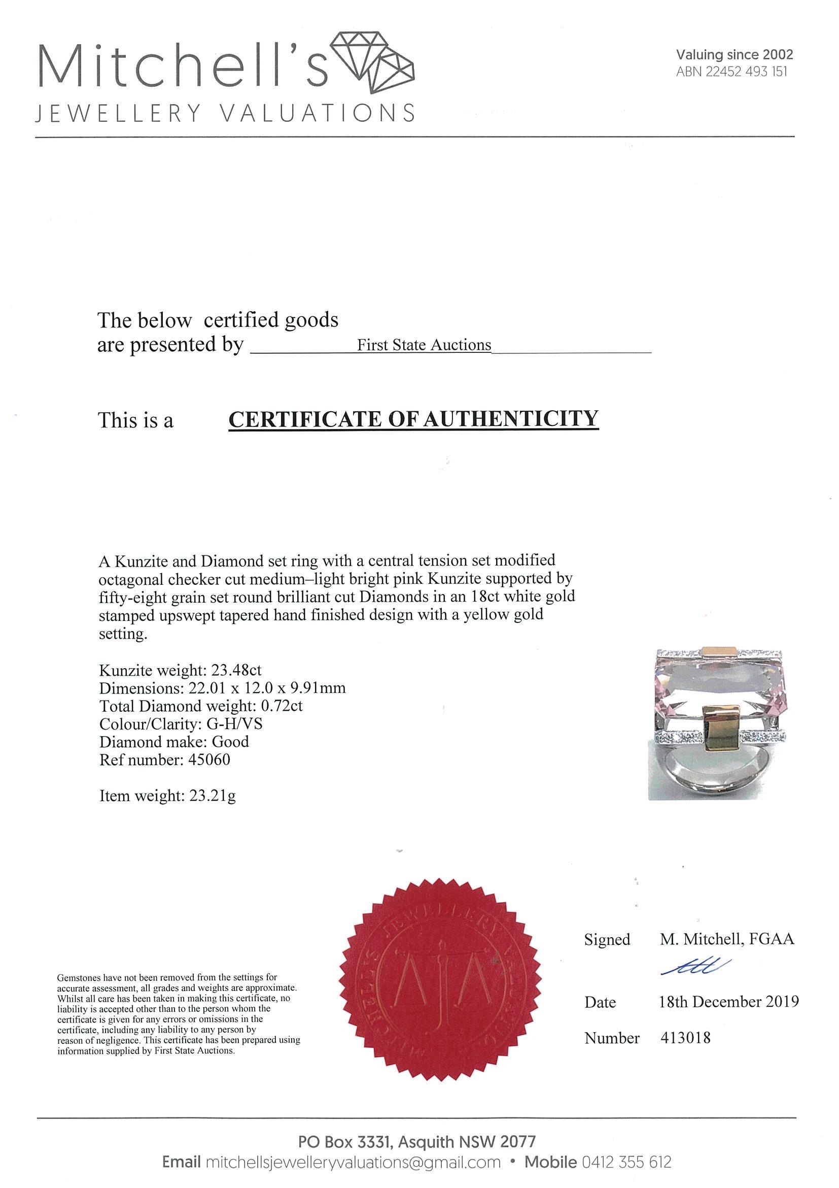 Kunzite and Diamond ring with octagonal cut Kunzite of 23.48ct and Diamonds totalling 0.72cts (Estimated grading: G-H VS). 18ct white and yellow gold. Ring size O - Ring resizing is not recommended. With certificate #413018. Weight: 23.2g (Pre-owned)