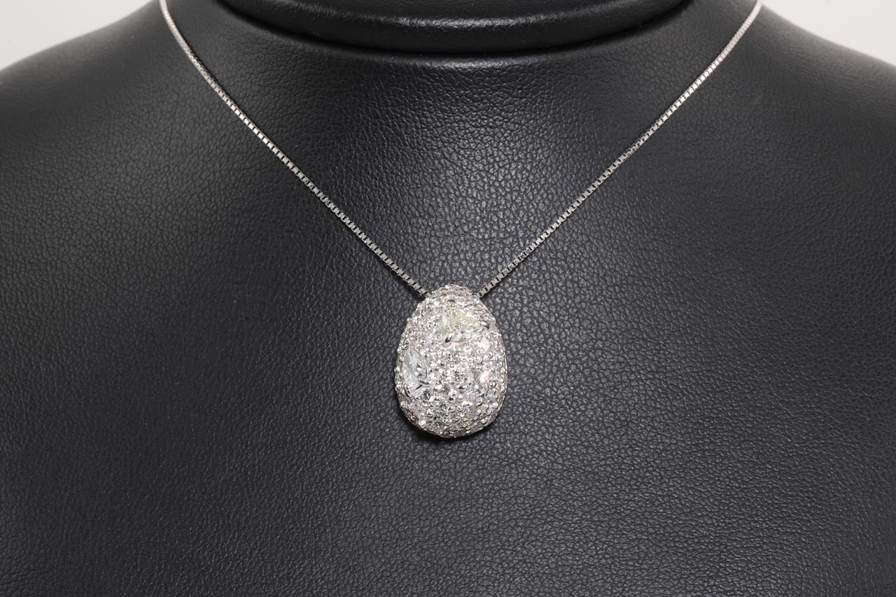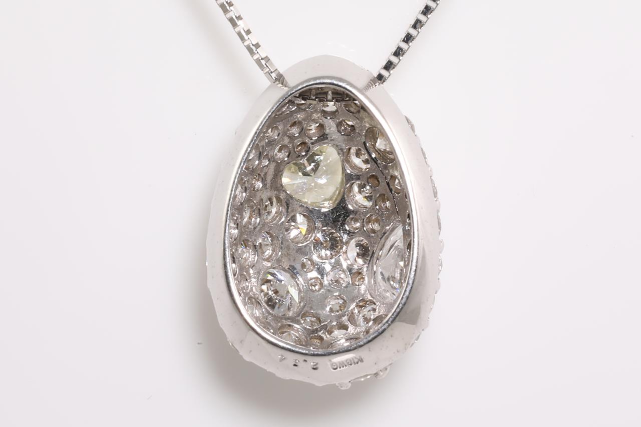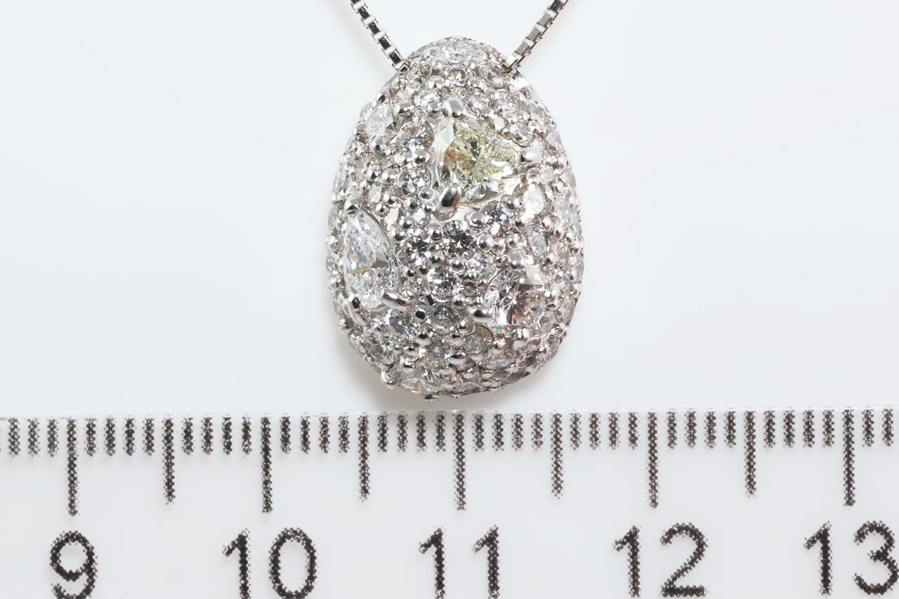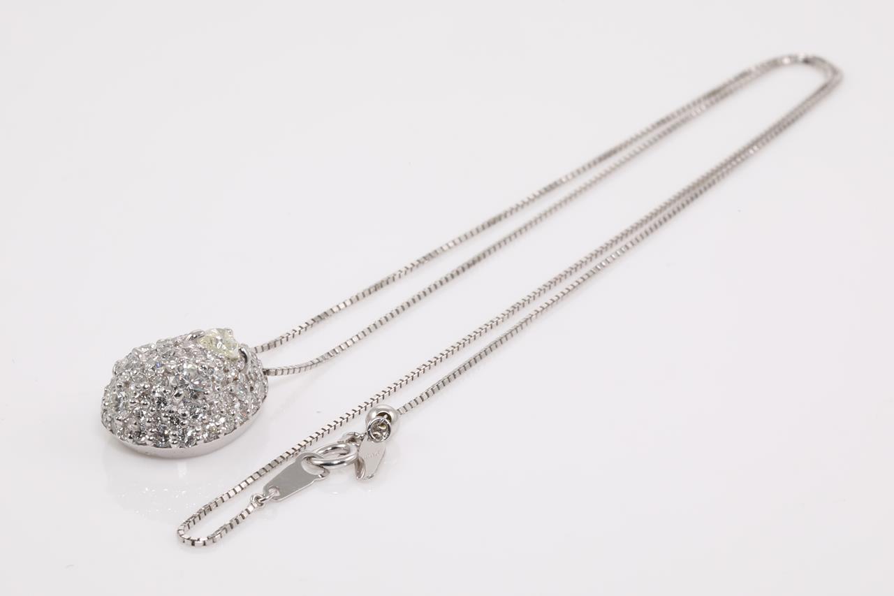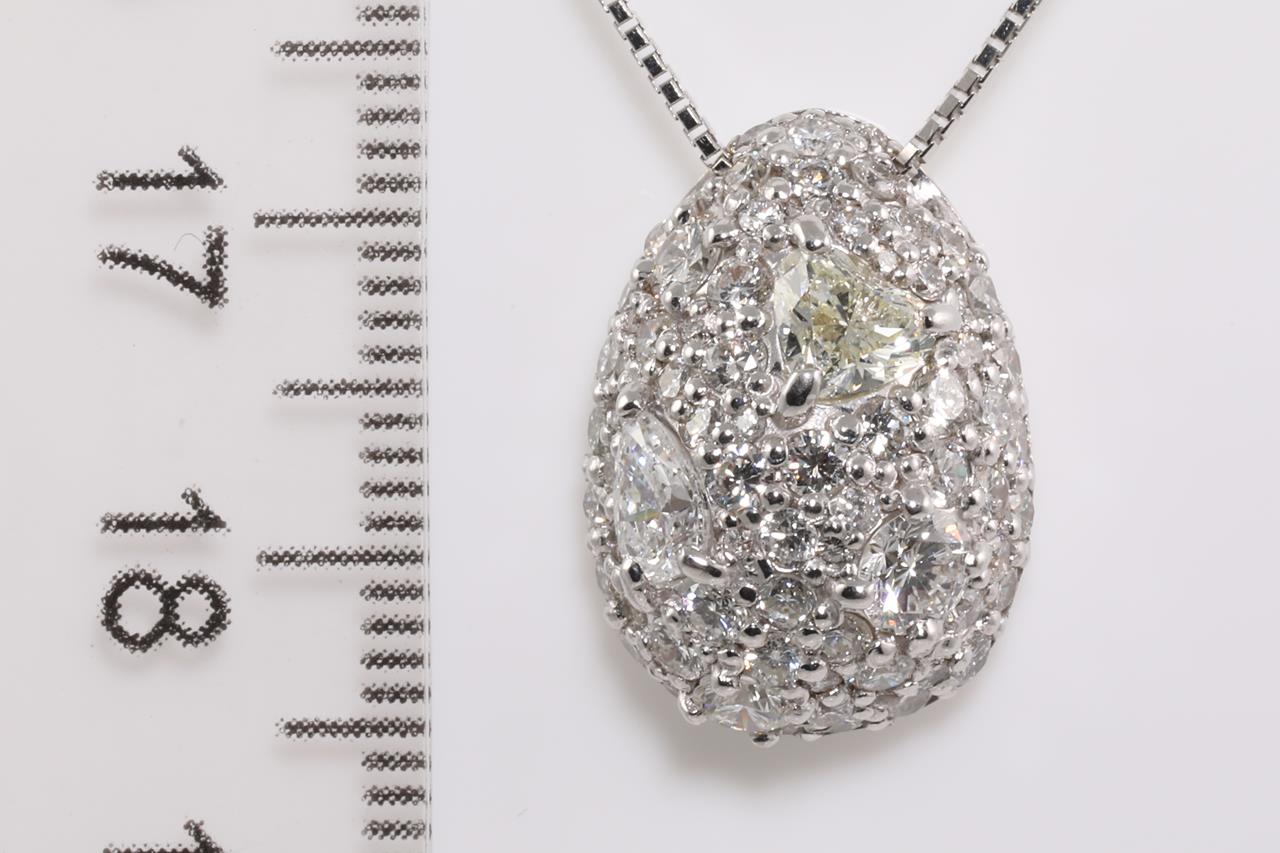 Diamond dress pendant with mixed shape Diamonds (heart, pear and rounds) totalling 2.34cts (Estimated grading: Heart Light Yellow SI, Pear F-G P1, Rounds G-H VS-SI). 18ct white gold with adjustable 45cm chain. Weight: 5.8g (Pre-owned)