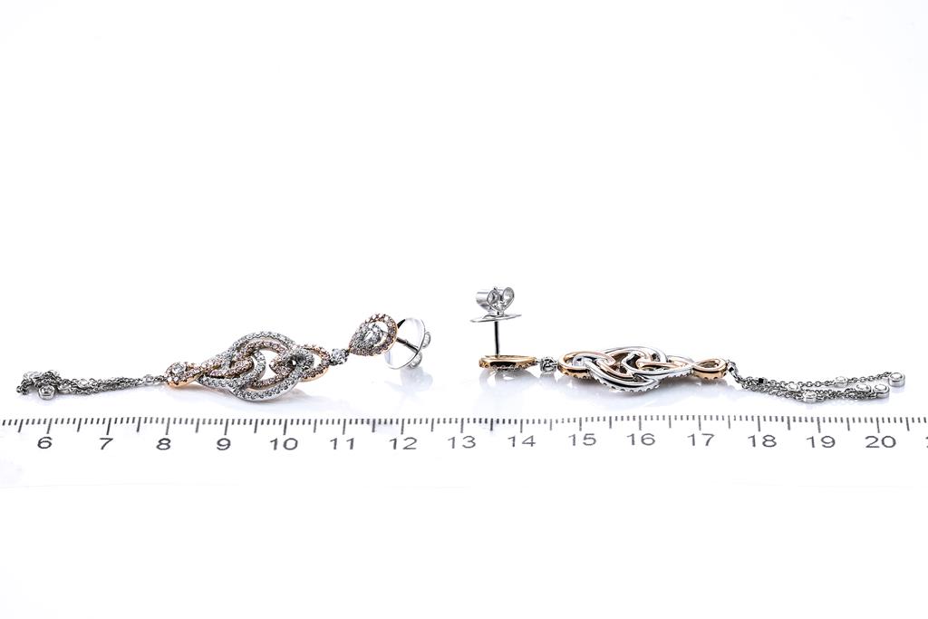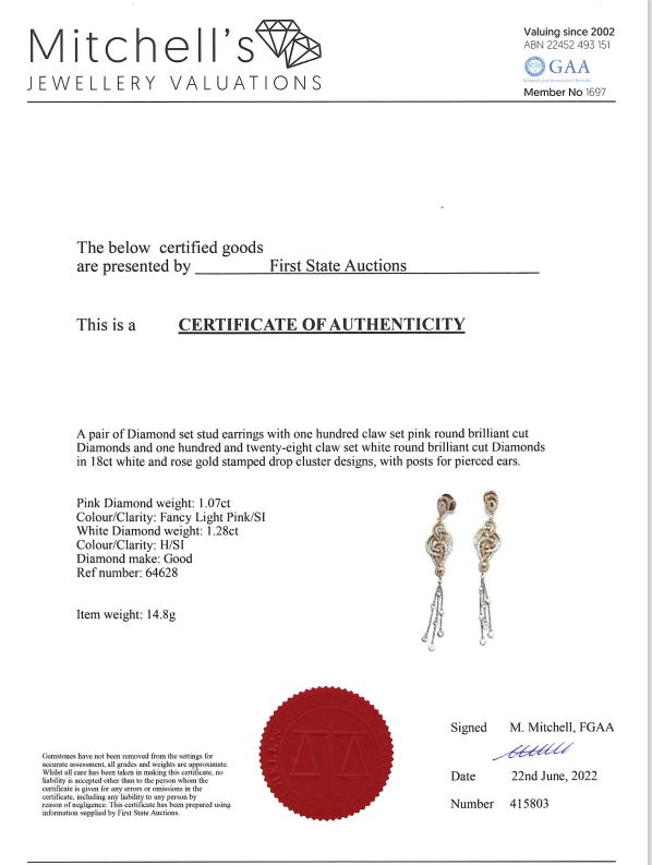 Pink and white Diamond drop earrings with round cut pink Diamonds totalling approximately 1.07cts (Estimated grading: Fancy Light Pink SI) and round Diamonds totalling approximately 1.28cts (Estimated grading H SI). 18ct rose and white gold. Weight 14.8g. With certificate #415803 (As New)