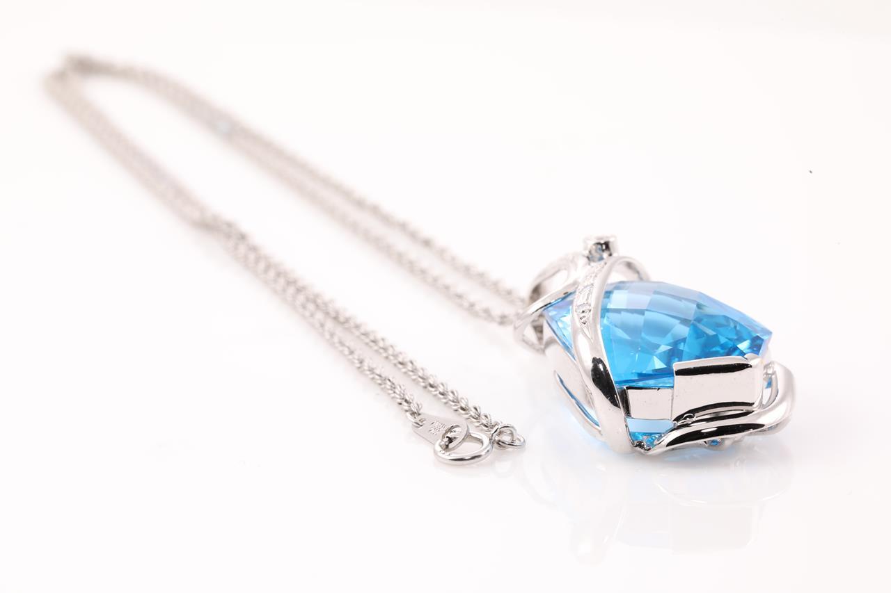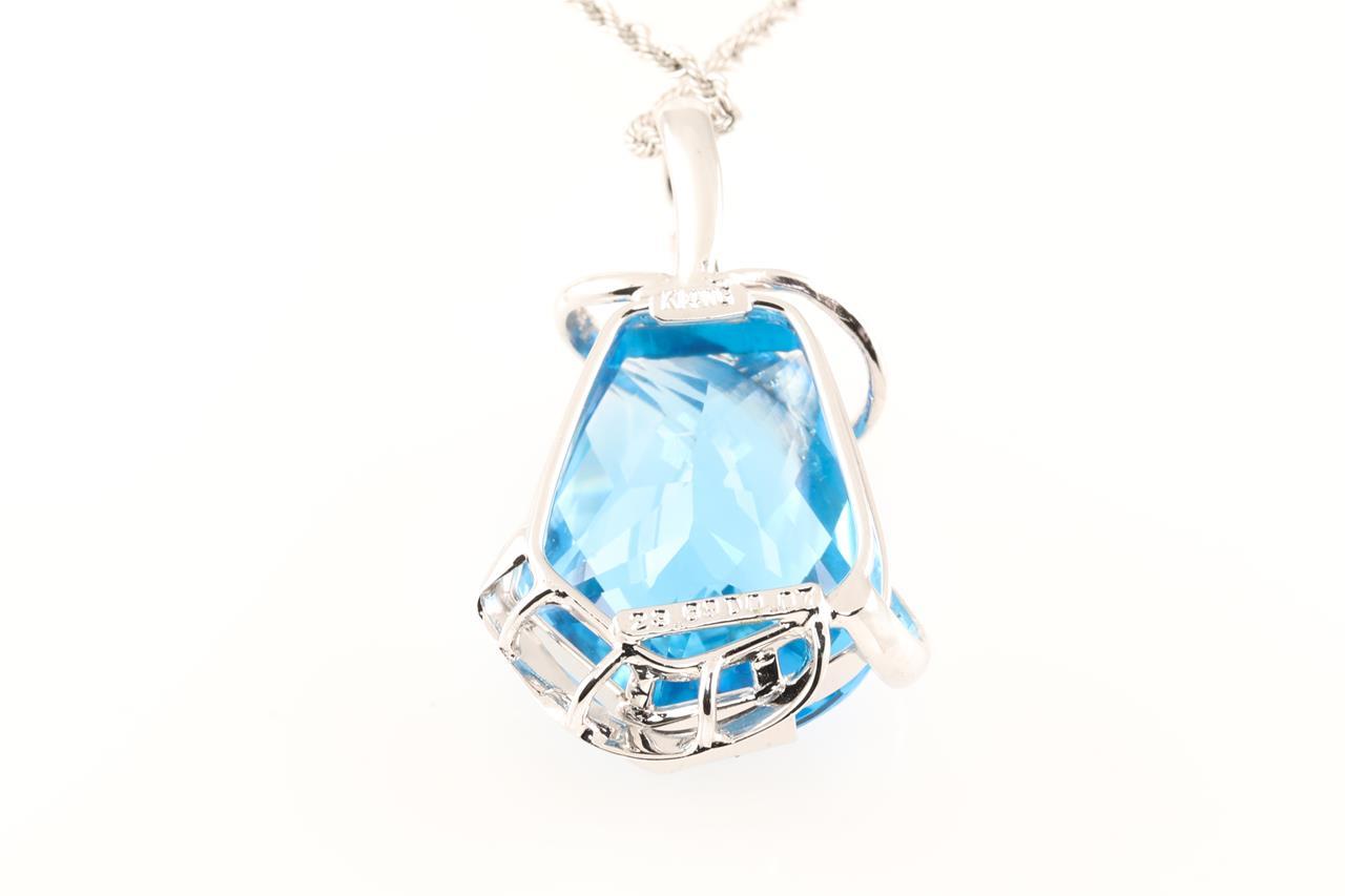 Topaz and Diamond pendant with a fancy checkerboard cut Topaz of 23.69ct and Diamonds 0.07cts. 14ct white gold with 45cm chain. Weight: 11.4g (Pre-owned)