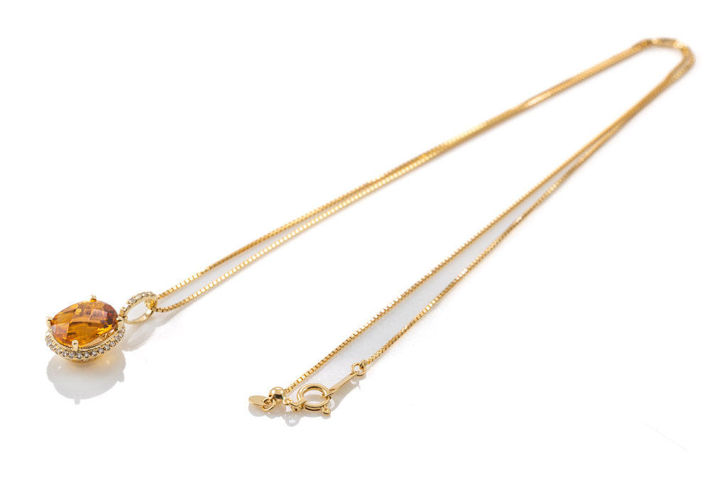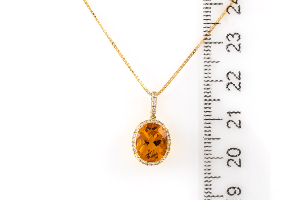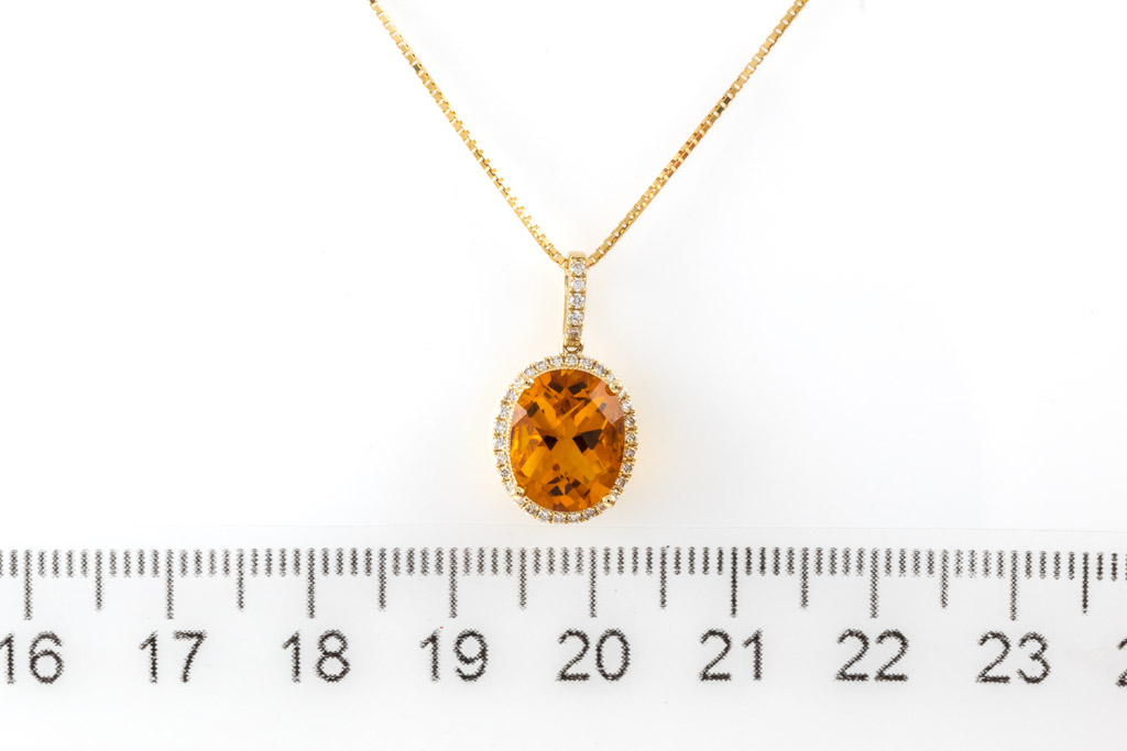 Citrine and Diamond pendant with oval shape Citrine of 2.36ct and round Diamonds totalling 0.15cts. 14ct yellow gold with 18ct yellow gold adjustable 44cm chain. Weight: 3.2g. (New)