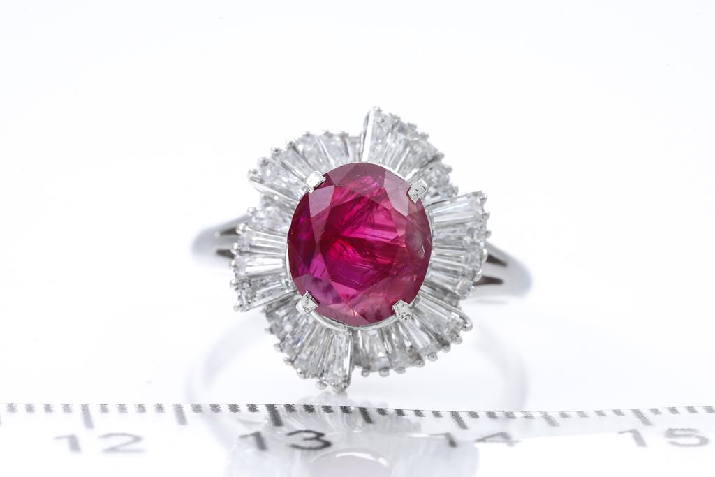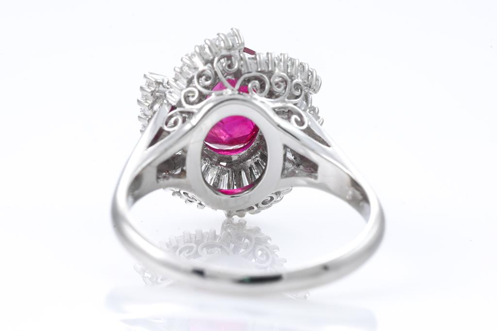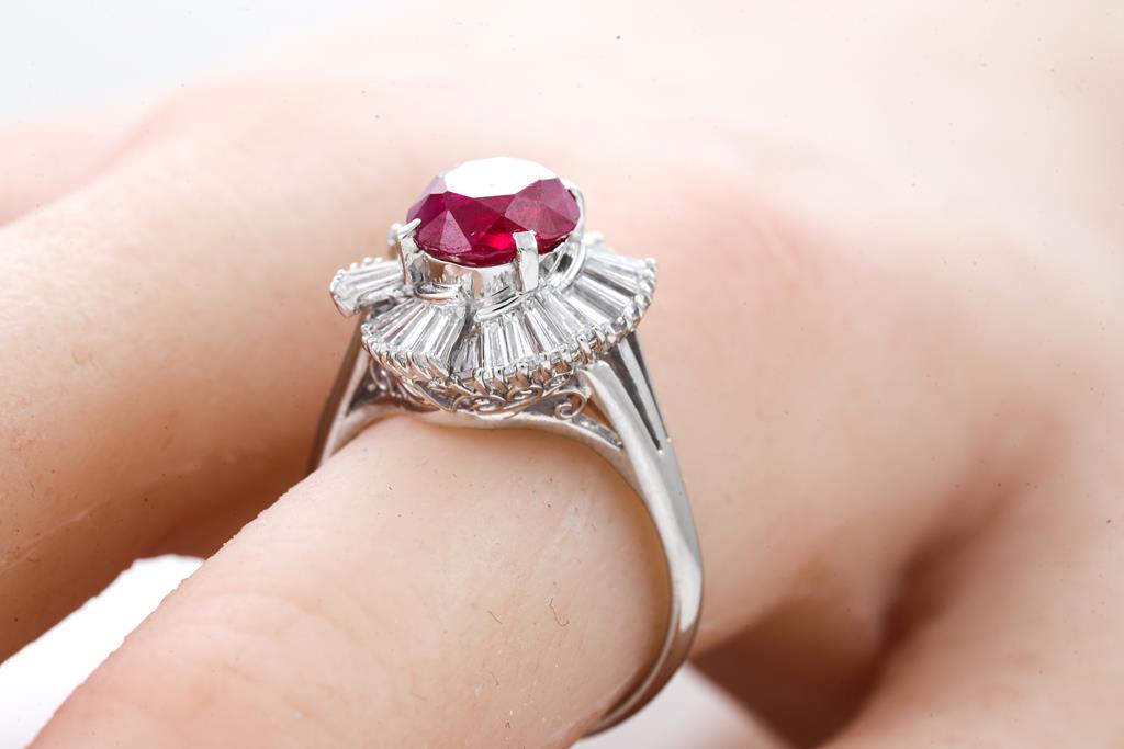 Ruby and Diamond ring with an oval shaped unheated purplish red Burmese Ruby of 2.37ct (With GIA report #632795598, note minor wear marks on stone) and baguette cut Diamonds totalling 1.38cts (Estimated grading: G-H SI-P1). Platinum. Ring size N. Weight: 7.2g. (Pre-owned)