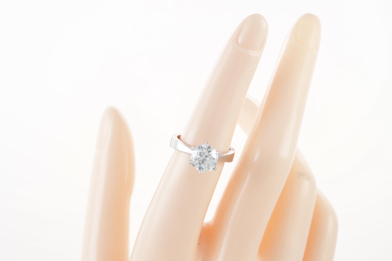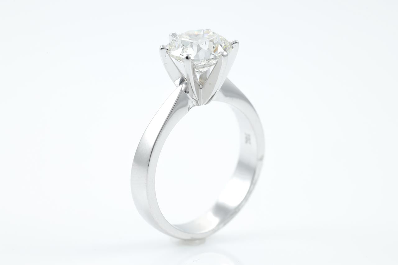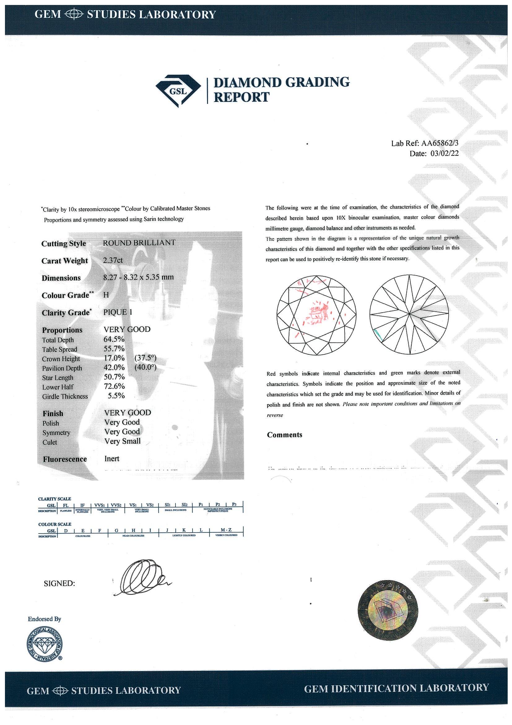 Diamond solitaire ring with centre round brilliant cut Diamond totalling 2.37cts (with GSL report graded as H P1 #AA65862/3). 18ct white gold. Ring size M. Weight 6.1g (New)