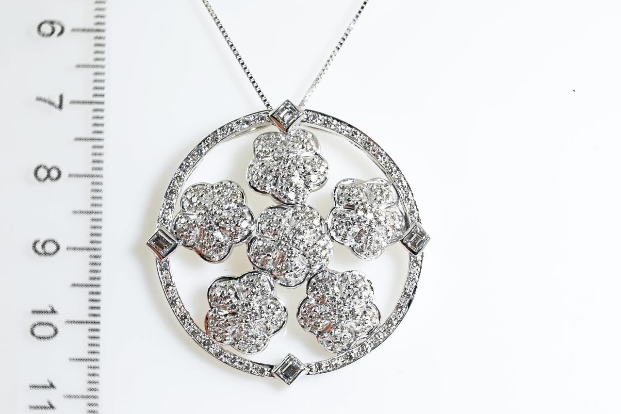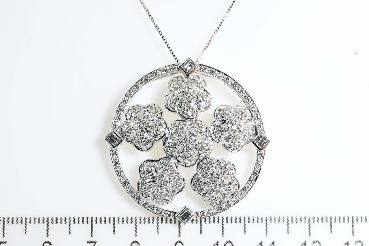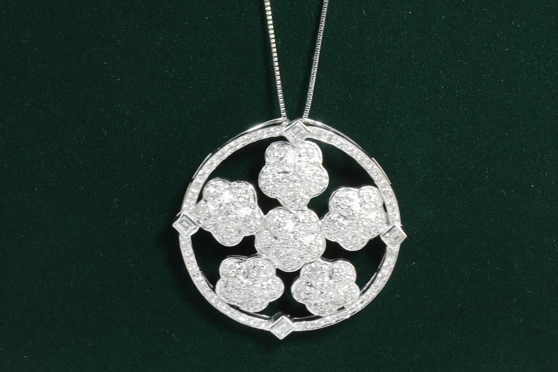 Diamond pendant with Diamonds totalling 2.38cts (Estimated grading: G-H SI). 18ct white gold with 45cm adjustable chain. Weight: 17g. With certificate#414179. (Pre-owned)