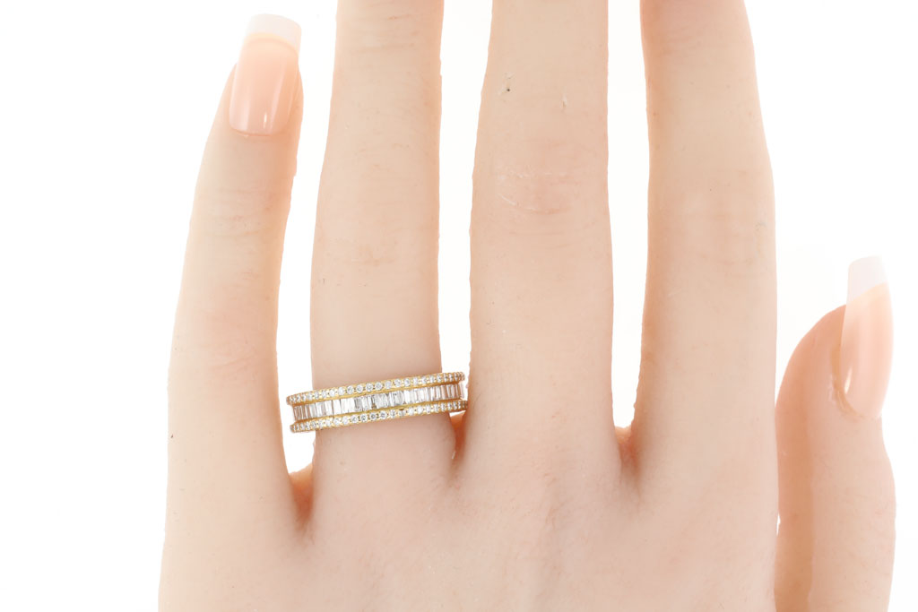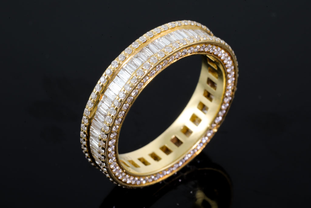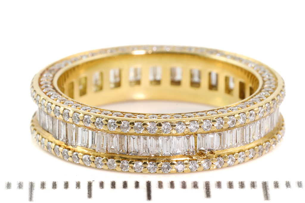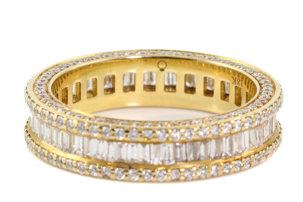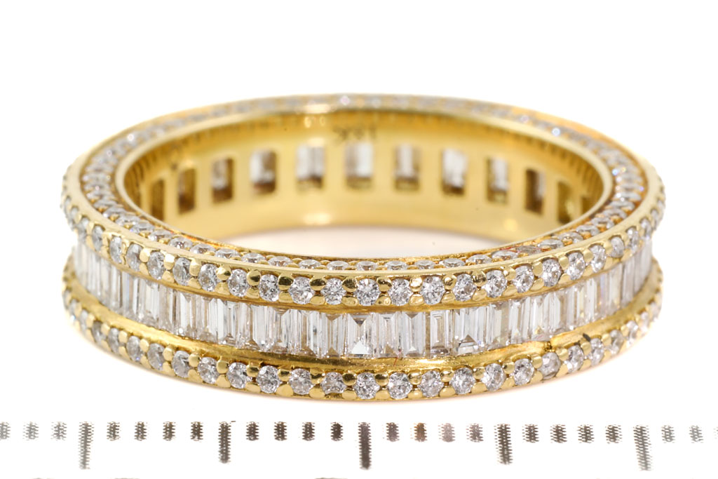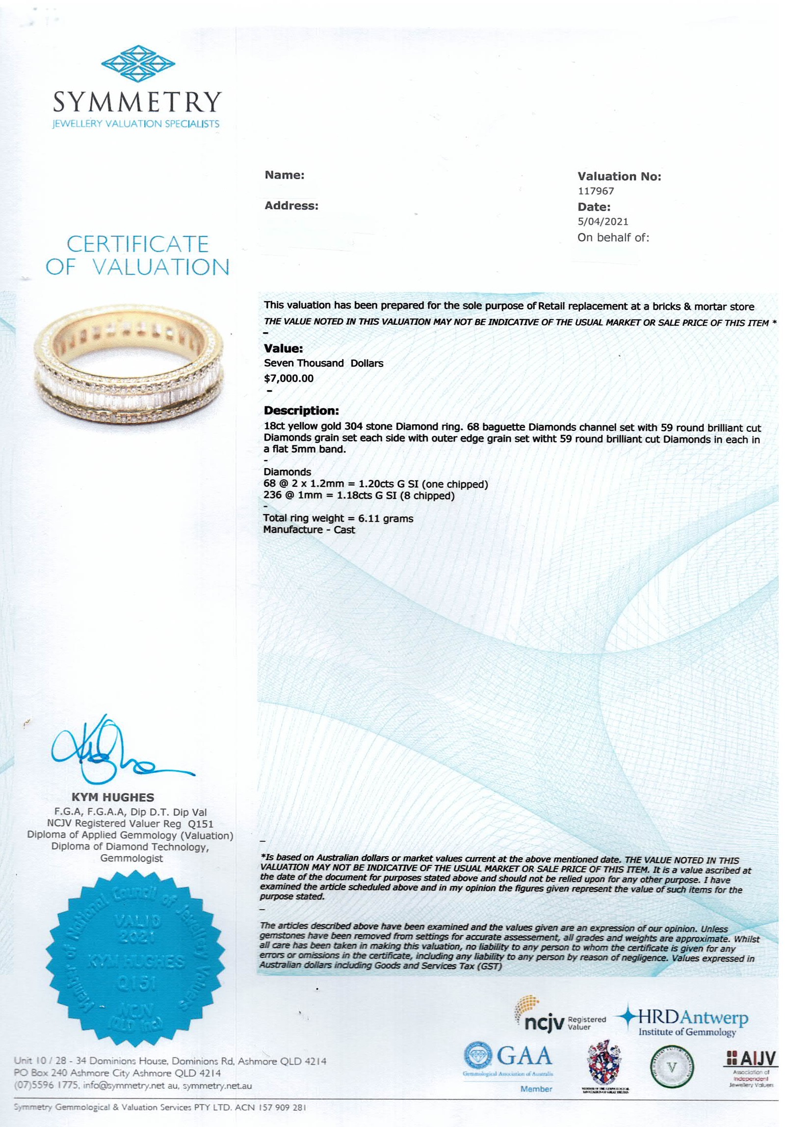 Full hoop Diamond eternity ring with 68 baguette cut Diamonds of 1.20cts (single Diamond chipped, estimated grading: G SI) and 236 round brilliant Diamonds of 1.18cts (Estimated grading: G SI - 8 chipped). 18ct yellow gold. Ring size: O. Weight: 6.2g. With Valuation Certificate Ref #024000176117. (Pre-owned)