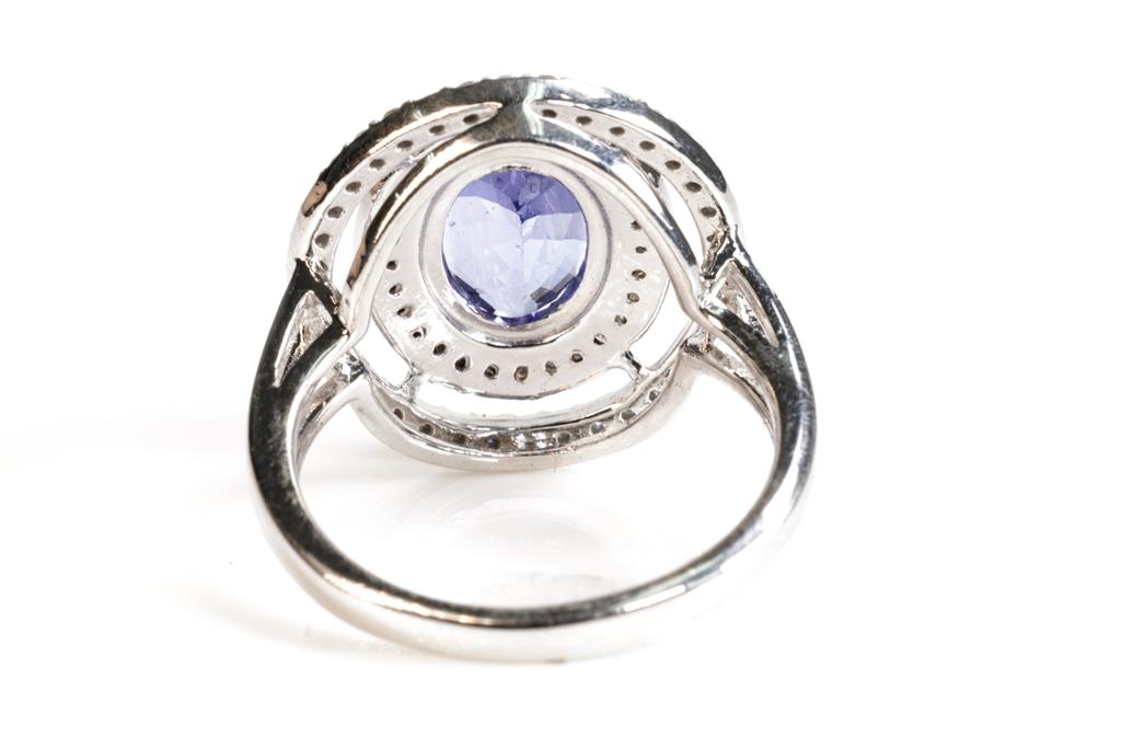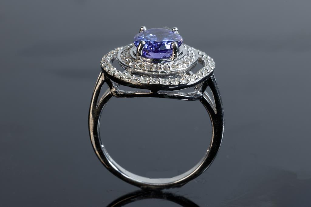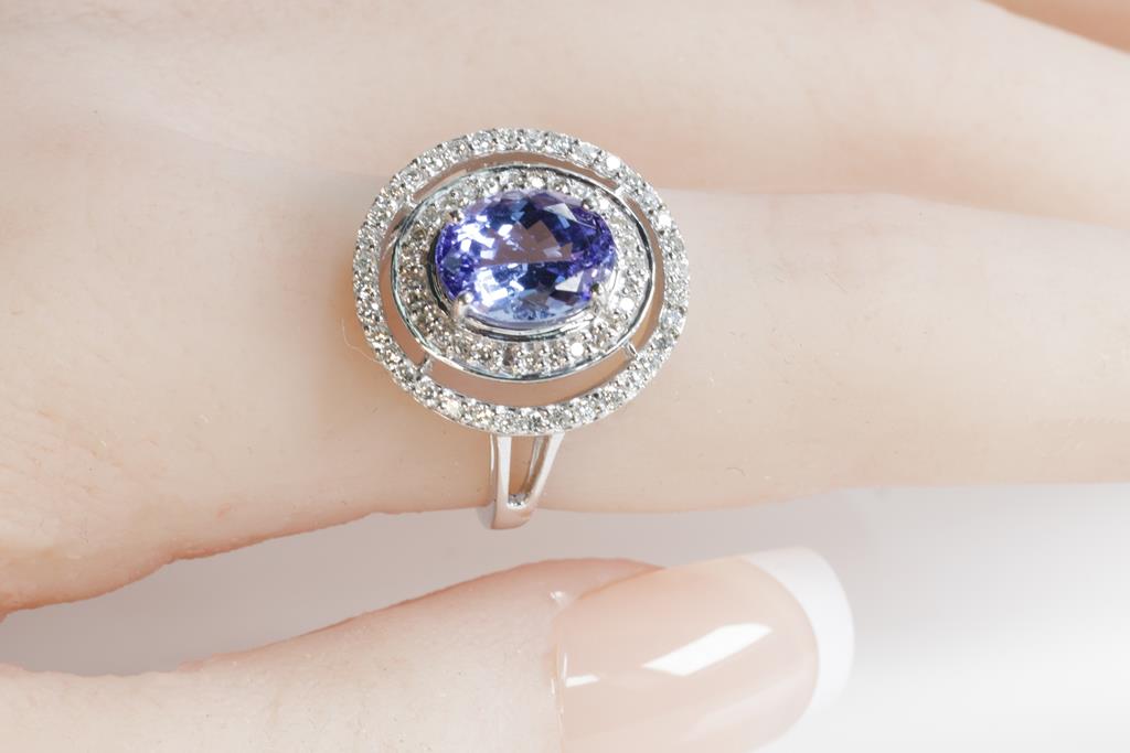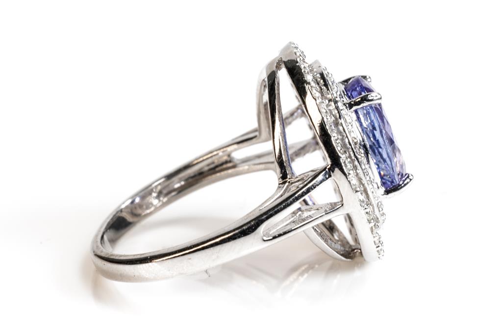 Tanzanite and Diamond ring with centre oval shape Tanzanite of 2.39ct and surrounding round Diamonds totalling 0.32cts (Estimated grading: H SI). 18ct white gold. Ring size: L1/2 - ring resizing is not recommended. Weight: 6.4. (Pre-owned)