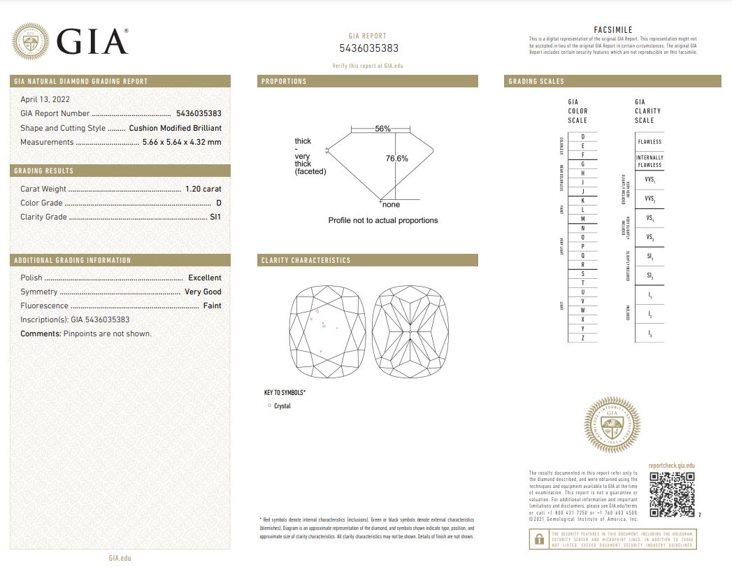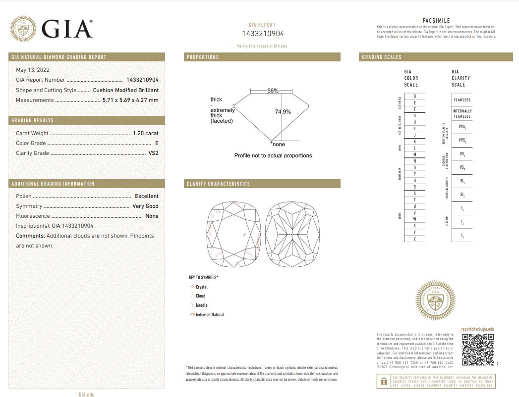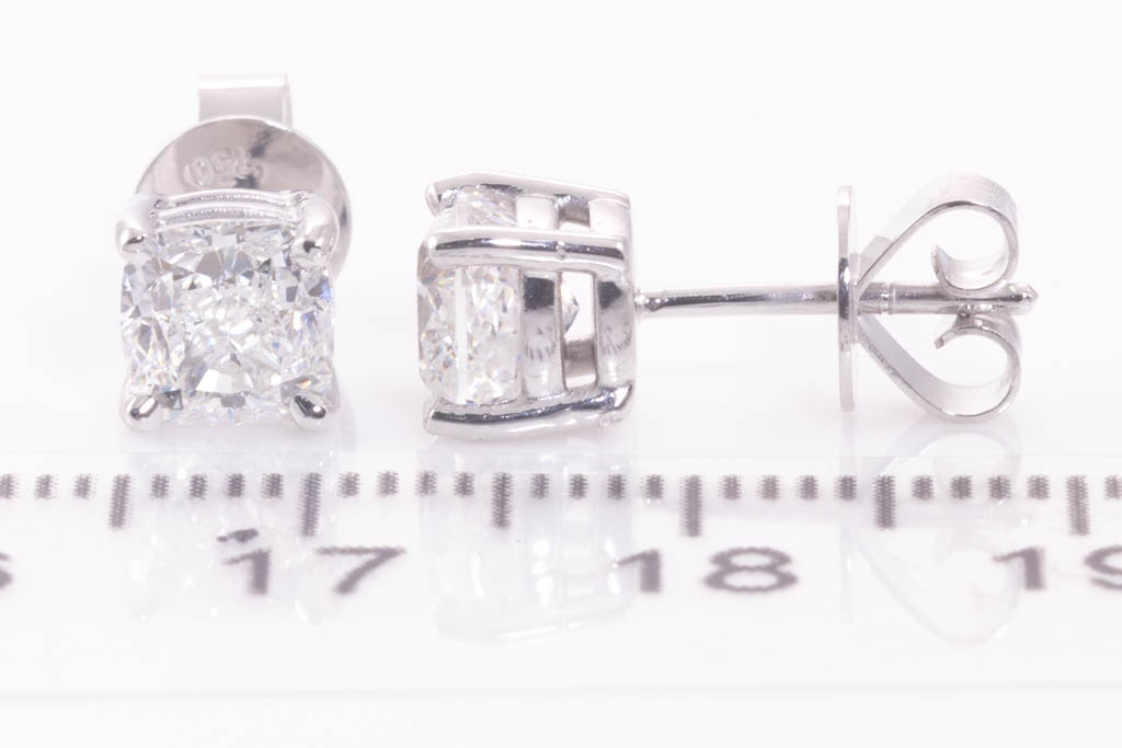 Diamond stud earrings with 2 cushion cut Diamonds totalling 2.40cts (both with GIA reports graded as E VS2 & D SI1 #1433210904, 5436035383). 18ct white gold. Weight 3.2g. (New)