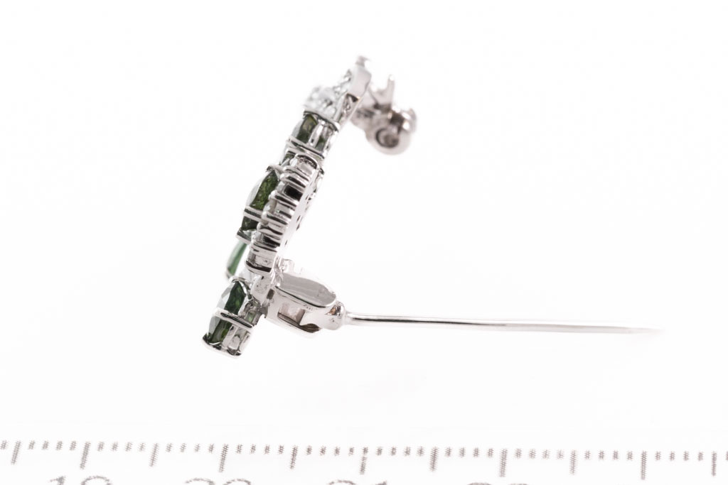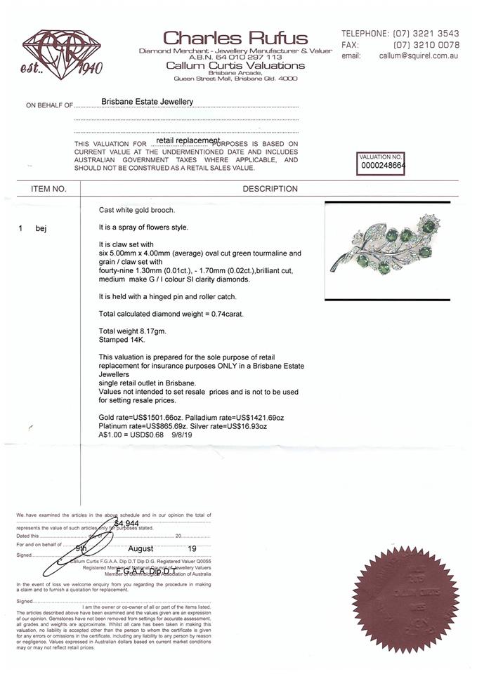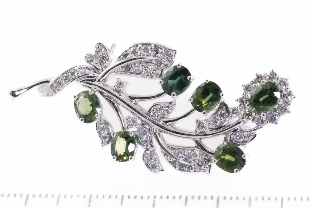 Tourmaline and Diamond brooch with oval shape green Tourmalines totalling approximately 2.40cts and round Diamonds totalling 0.74cts (Estimated grading: H-J SI). 14ct white gold. Weight: 8.1g. With Valuation Certificate dated 09/08/2019. (Pre-owned)
