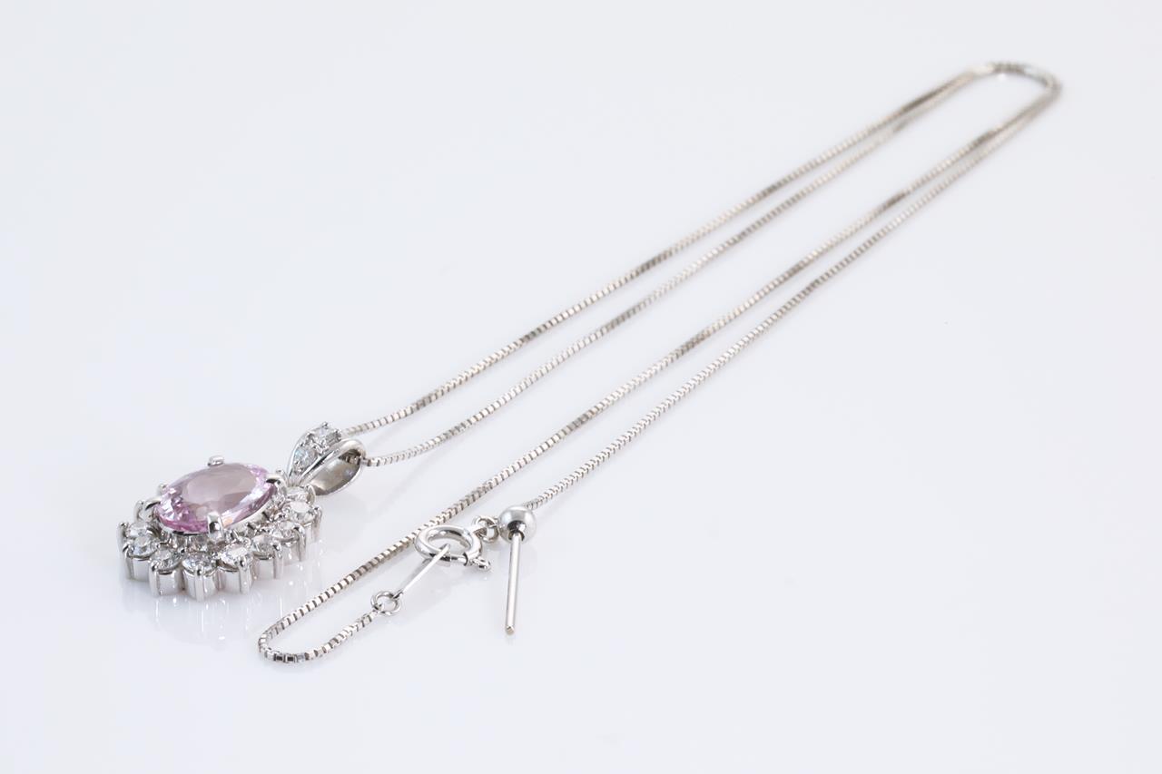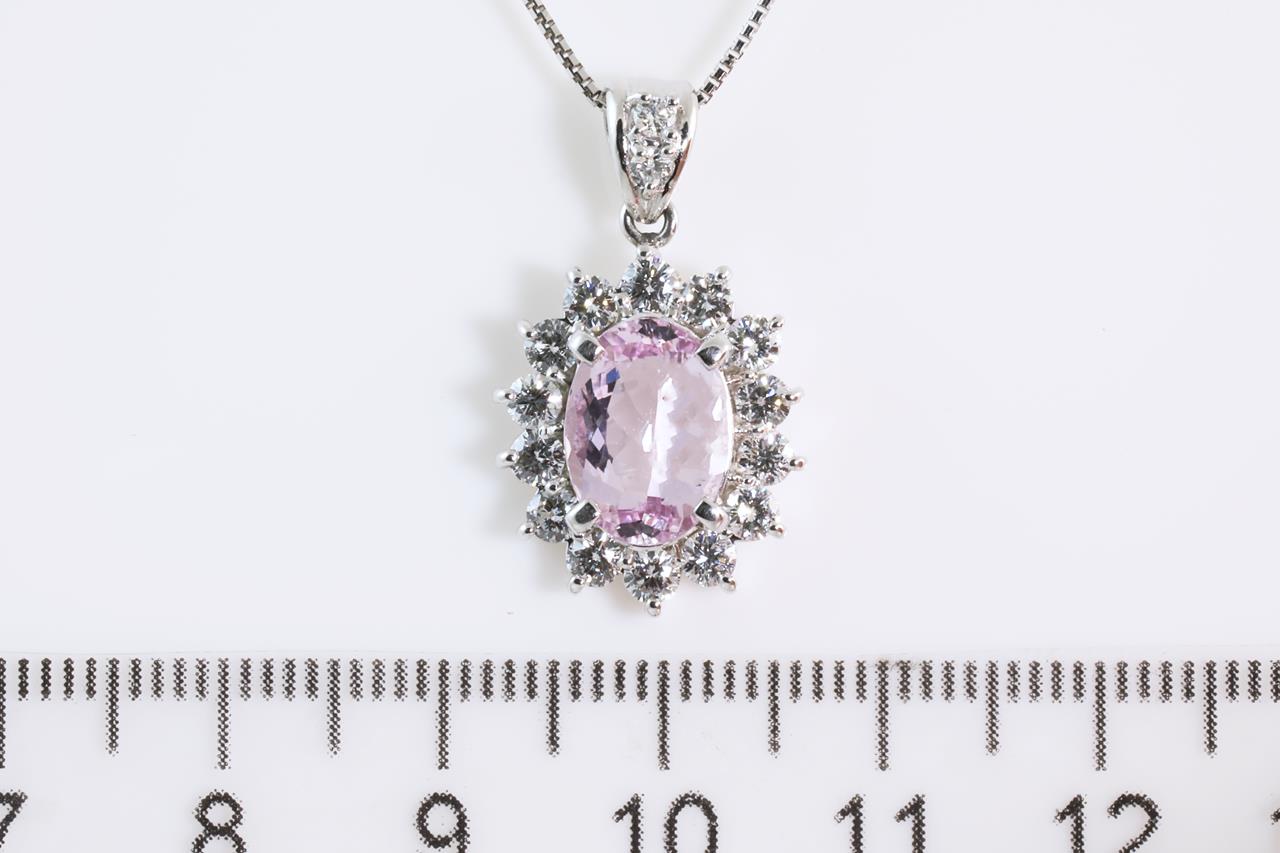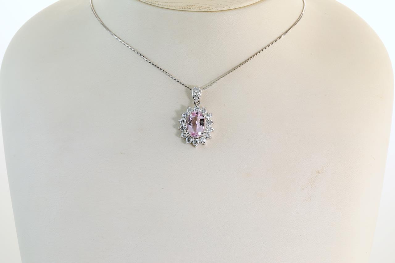 Topaz and Diamond pendant with oval shape pink Topaz of 2.42ct and Diamonds totalling 0.91cts (Estimated grading: G-H VS). Platinum with 18ct white gold 45cm adjustable chain. Weight: 7.2g (Pre-owned)