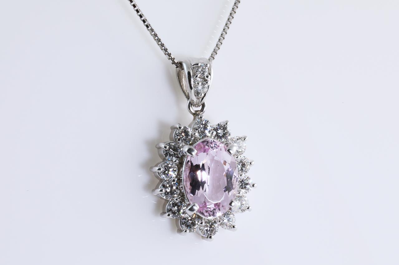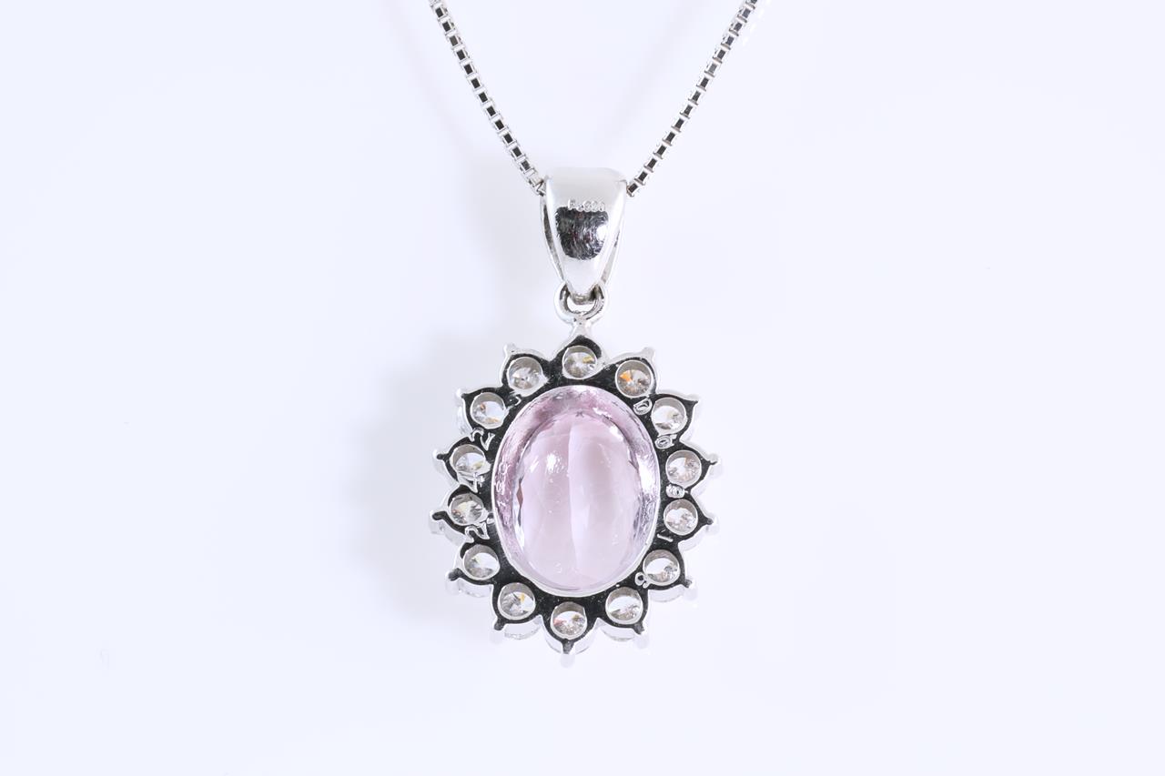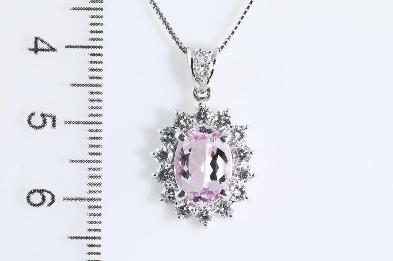 Topaz and Diamond pendant with oval shape pink Topaz of 2.42ct and Diamonds totalling 0.91cts (Estimated grading: G-H VS). Platinum with 18ct white gold 45cm adjustable chain. Weight: 7.2g (Pre-owned)