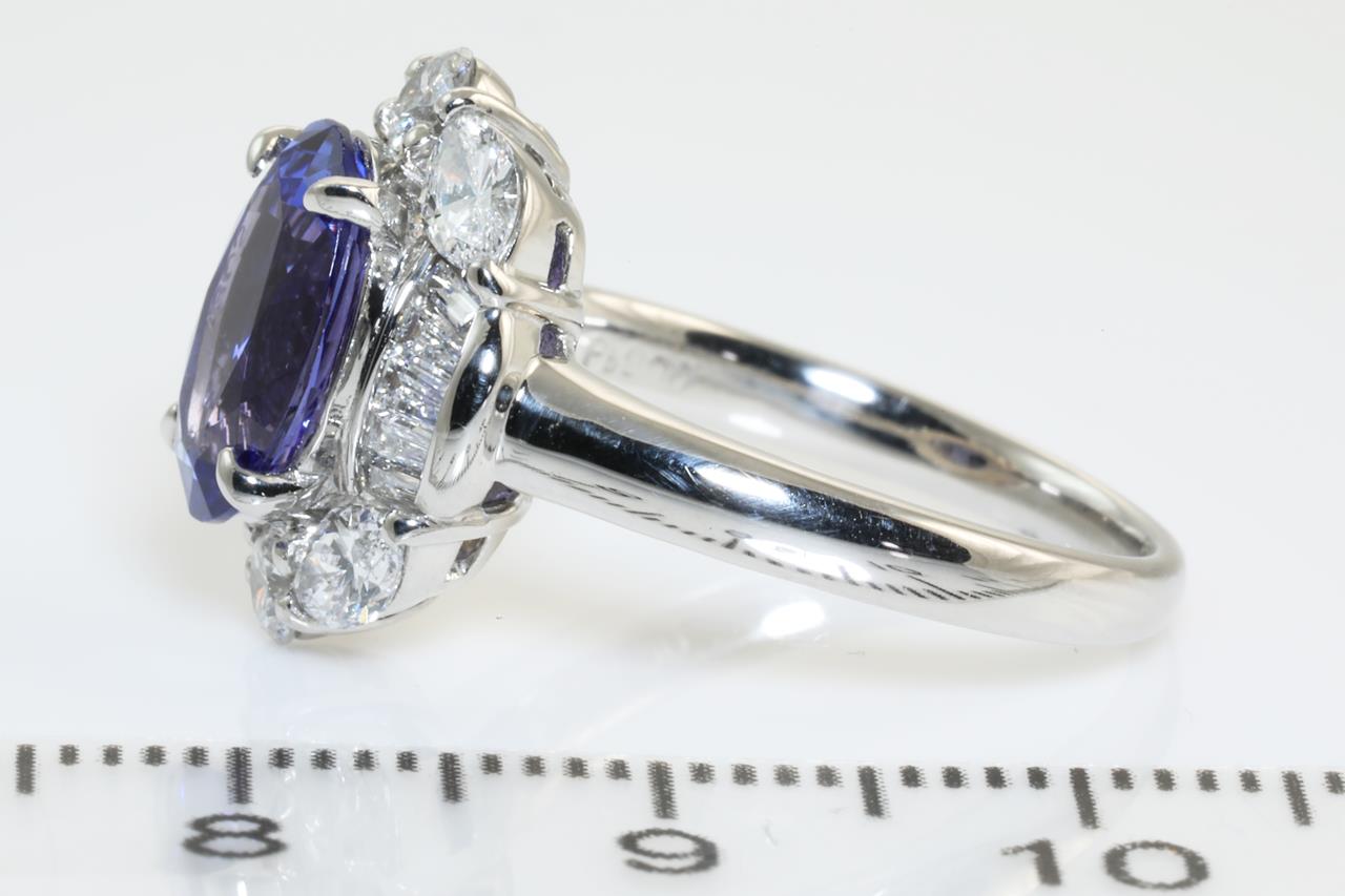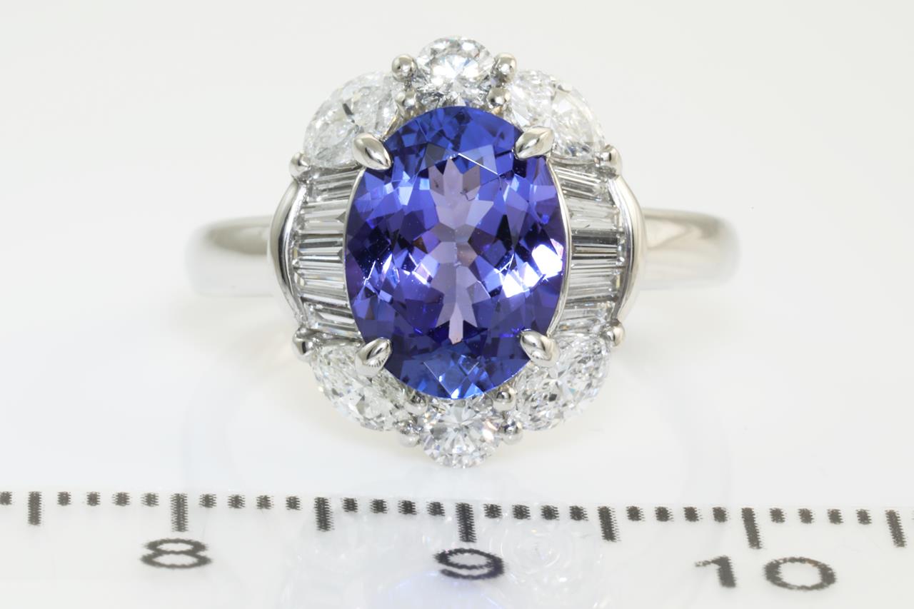 Tanzanite and Diamond ring with oval Tanzanite of 2.41ct with round, baguette and marquise cut Diamonds totalling 1.03cts (Estimated grading: G-H VS-SI). Platinum. Ring size: M1/2 - Note it is not recommended to resize this ring smaller. Weight: 8.0g (Pre-owned)