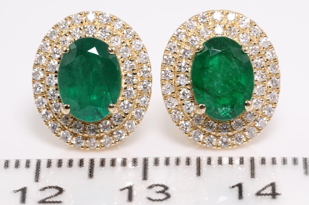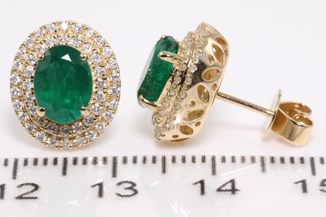 Emerald and Diamond earrings with oval Emeralds totalling 2.42cts and Diamonds totalling 0.55cts (Estimated grading: G-H SI-P1). 14ct yellow gold. Weight: 4.8g. (As new)